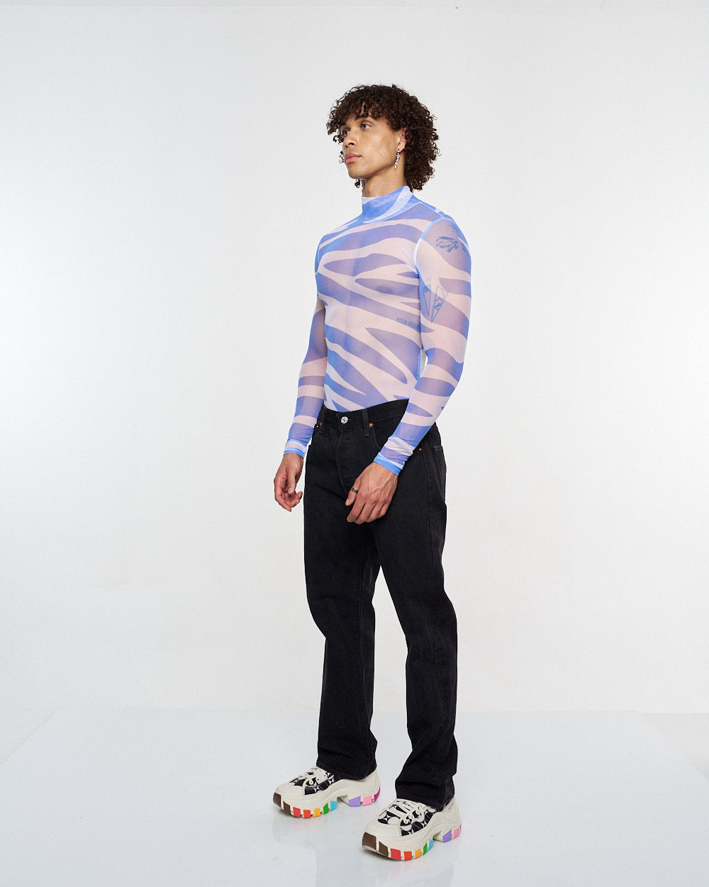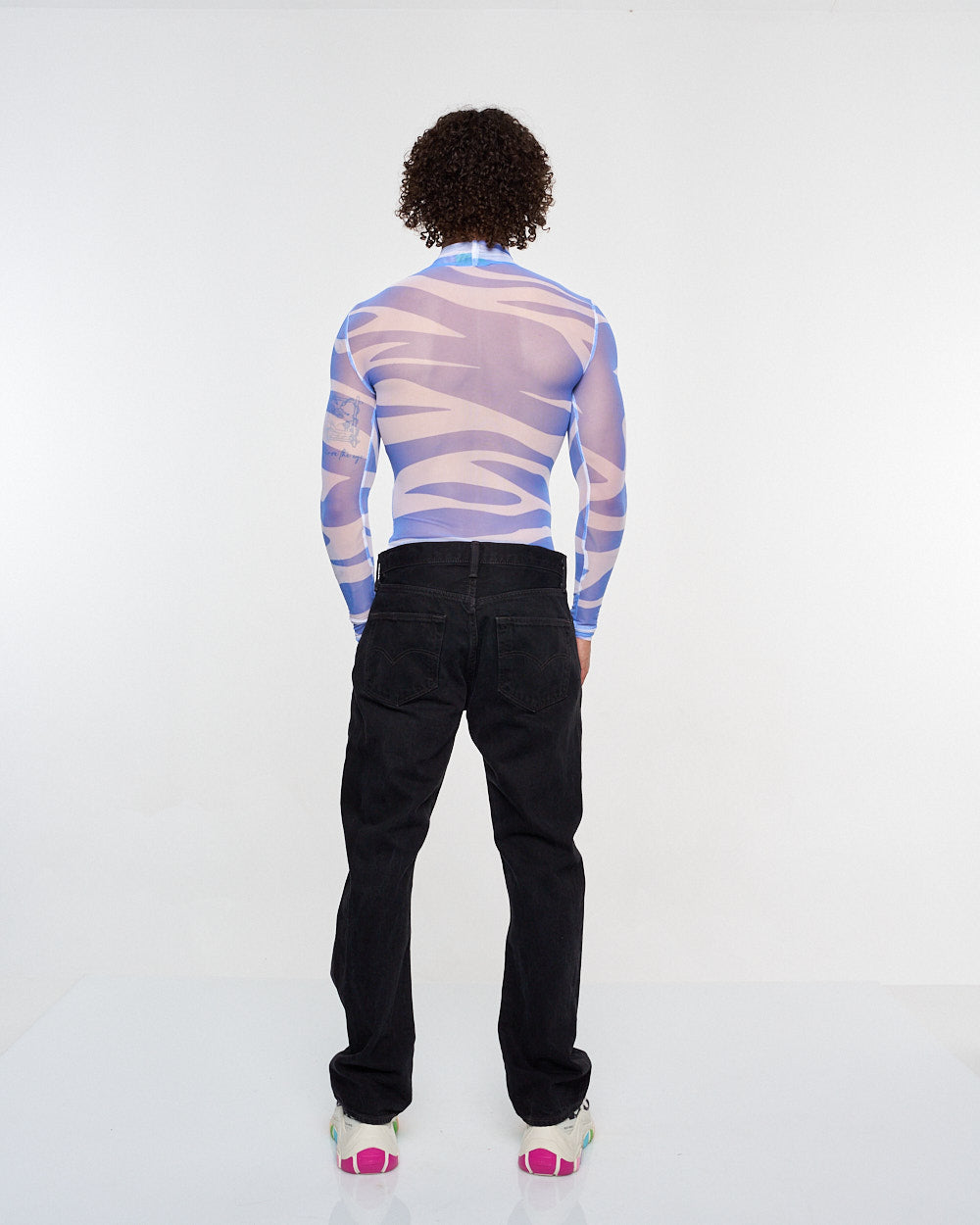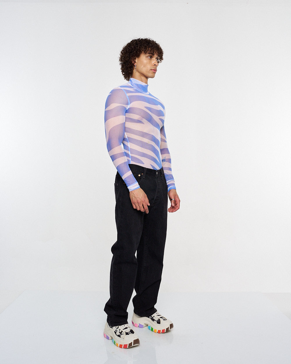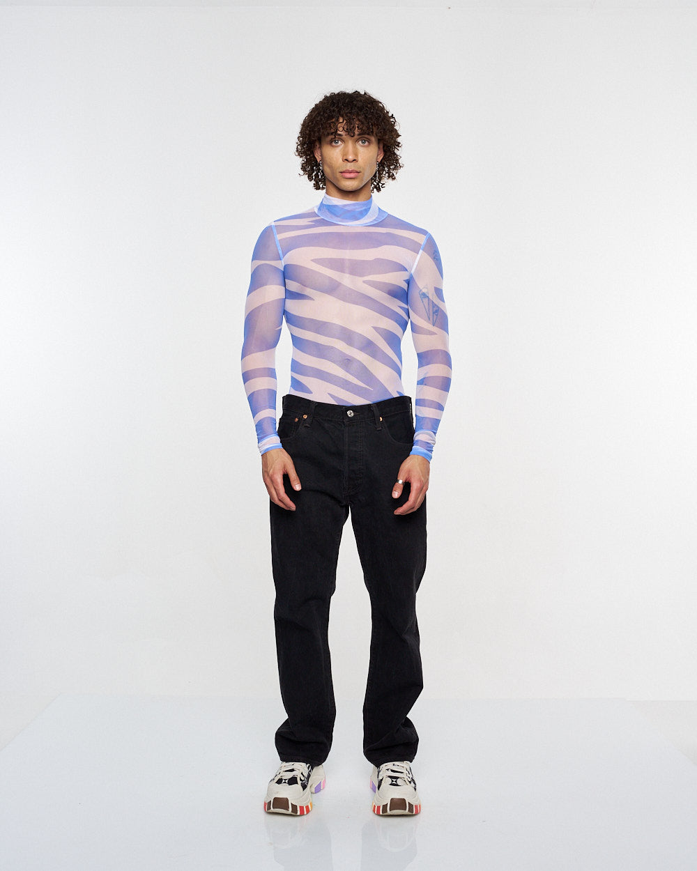 **/Description/*} The RICH MNISI Blue Zebra Tube is a stretch sheer turtleneck patterned in the Blue Zebra print.