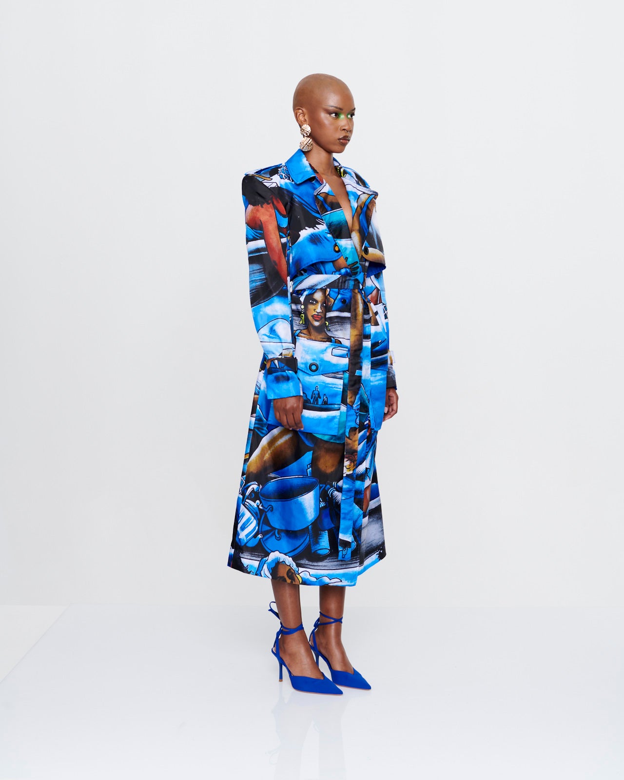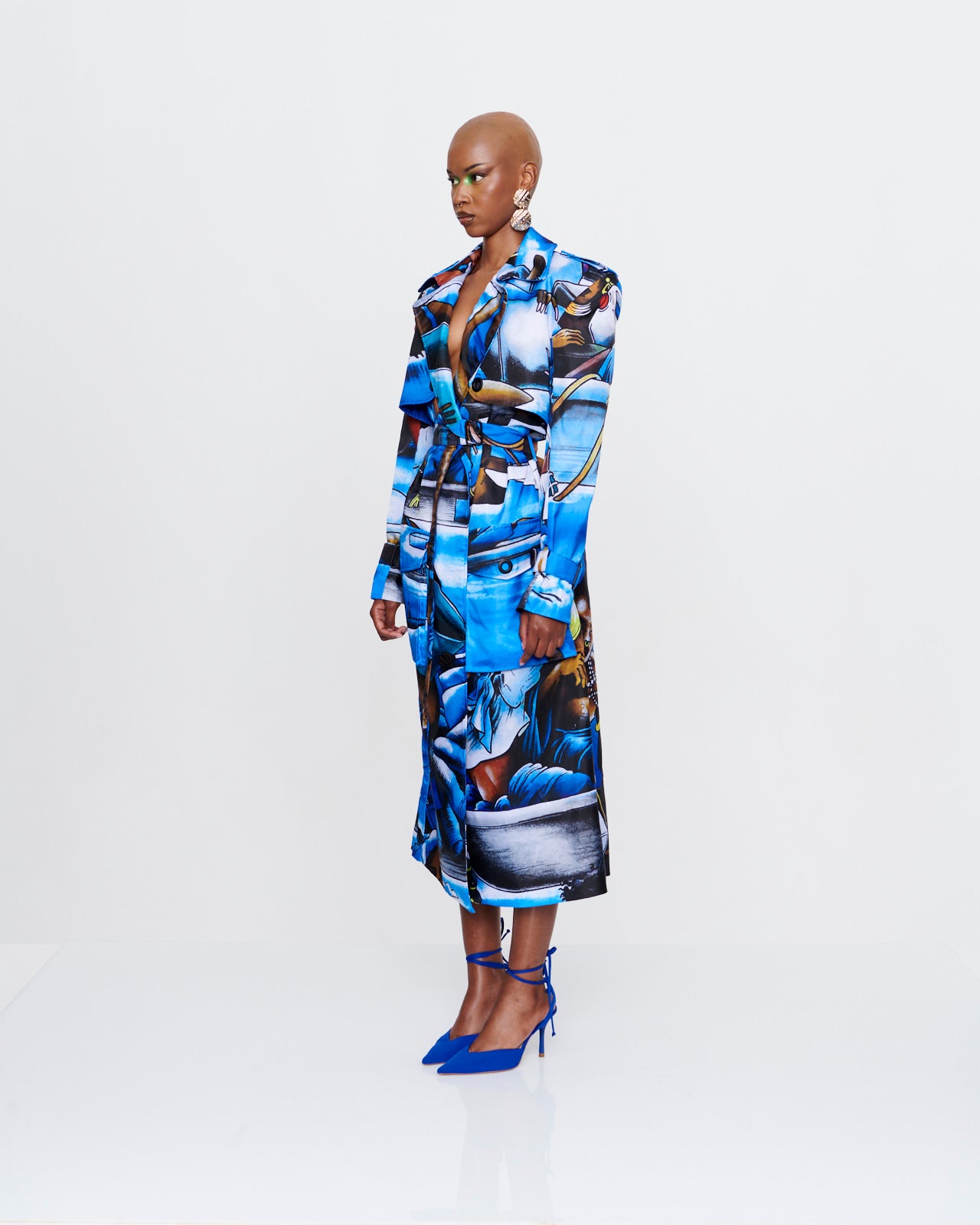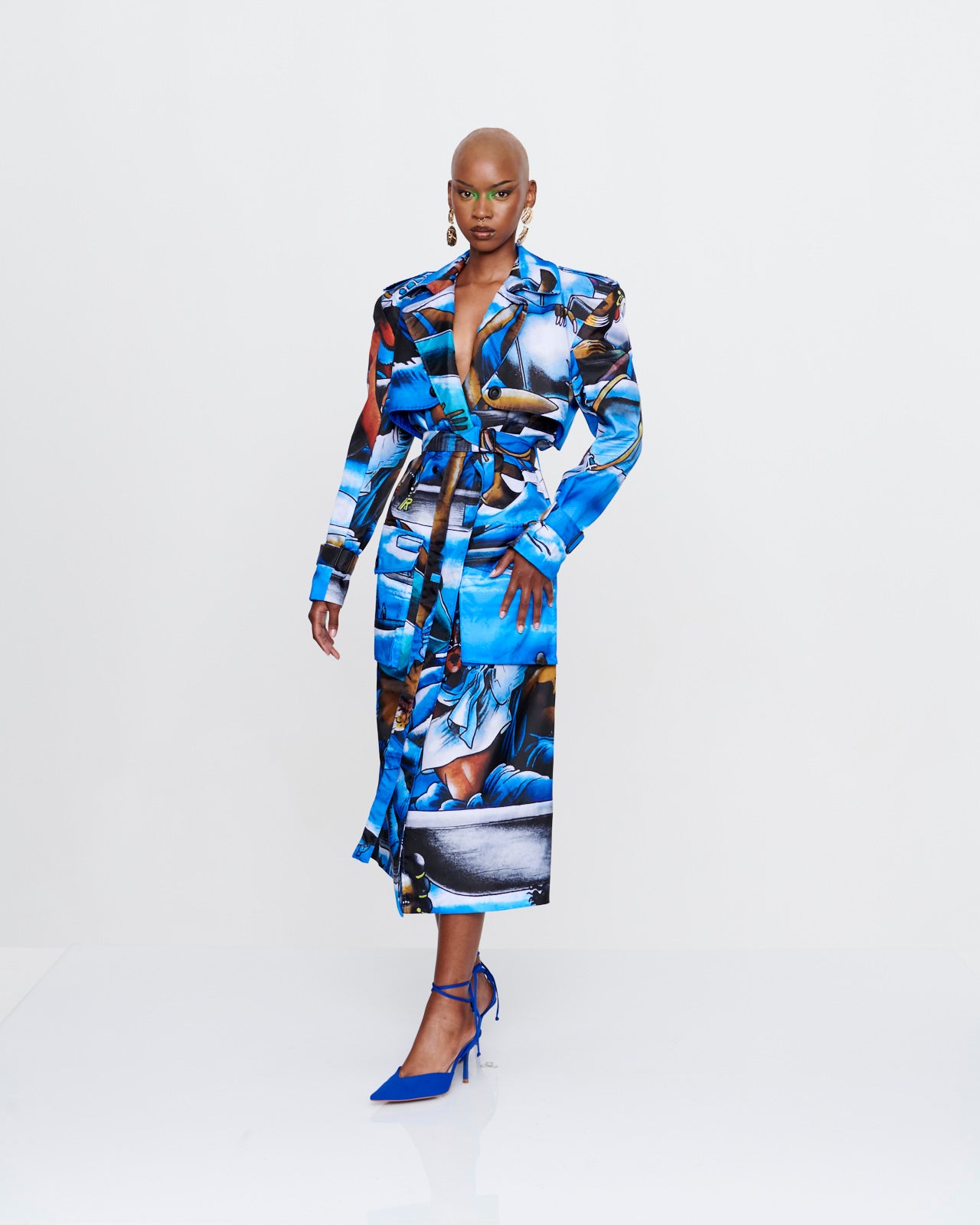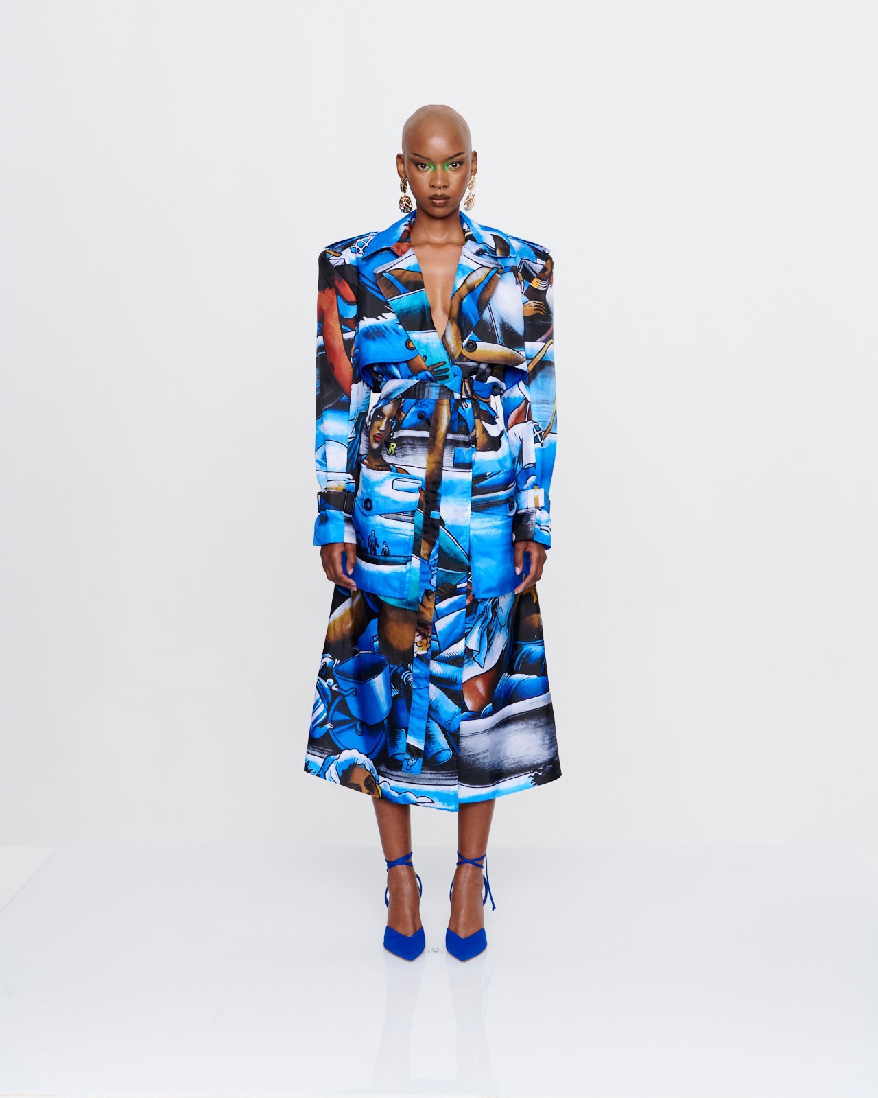 **/Description/*} The RICH MNISI Bucket Rain Coat is crafted from 'RICH MNISI' bucket rain print, a belted waist, side pockets and a tailored collar finish.