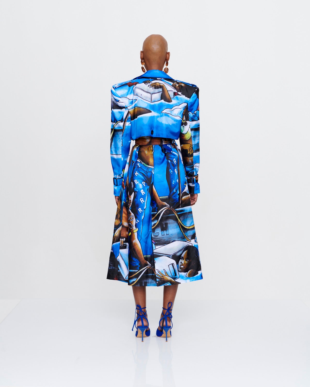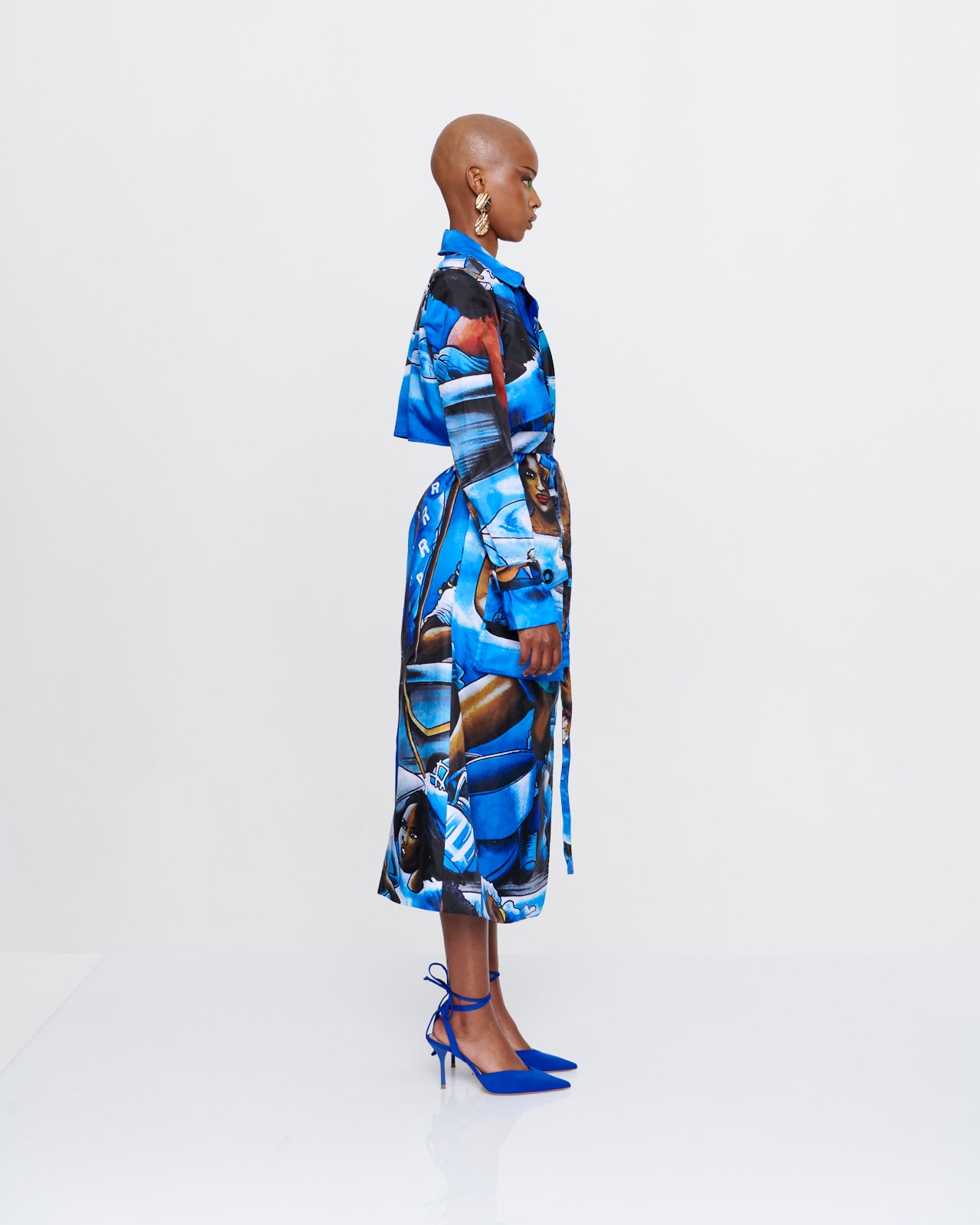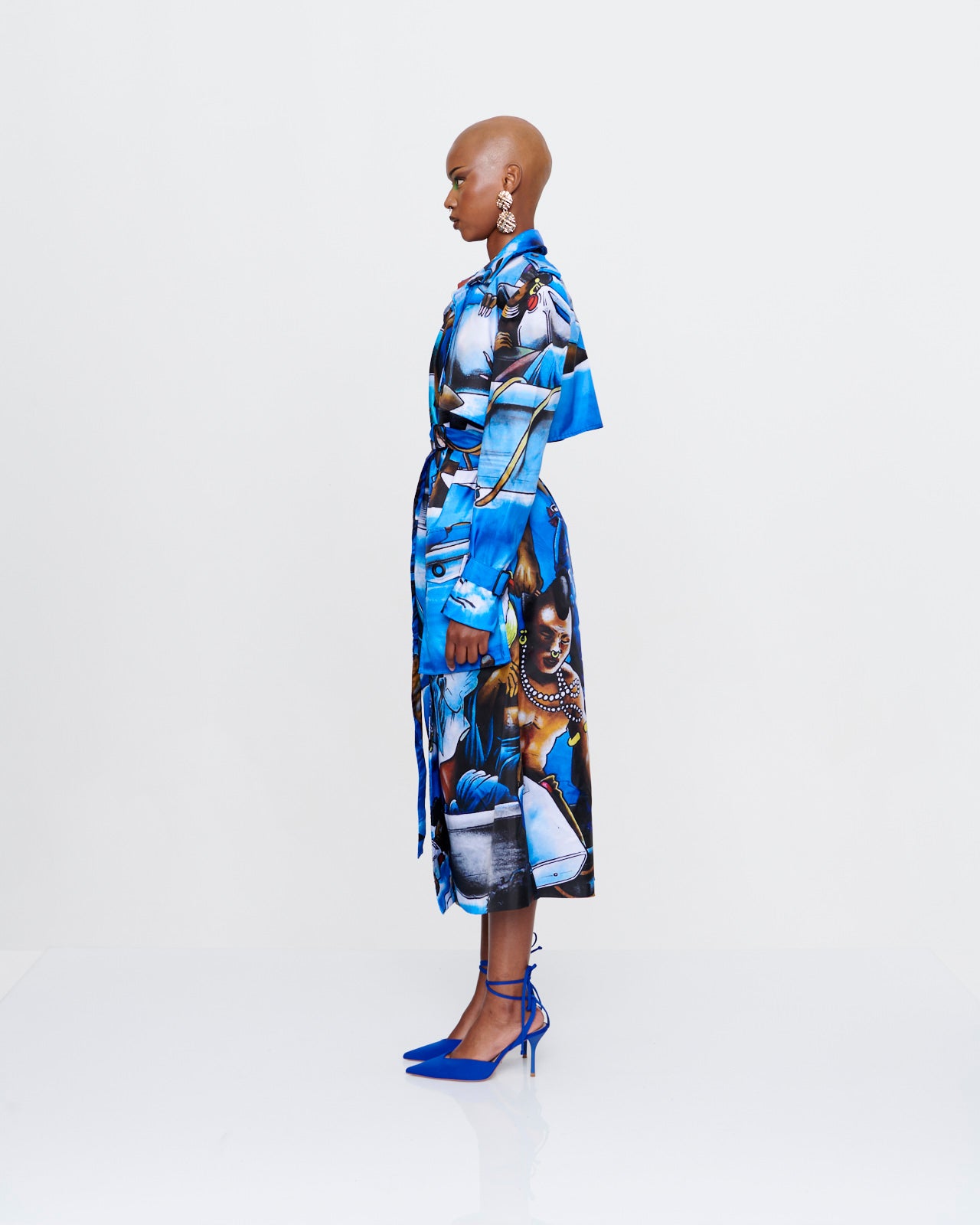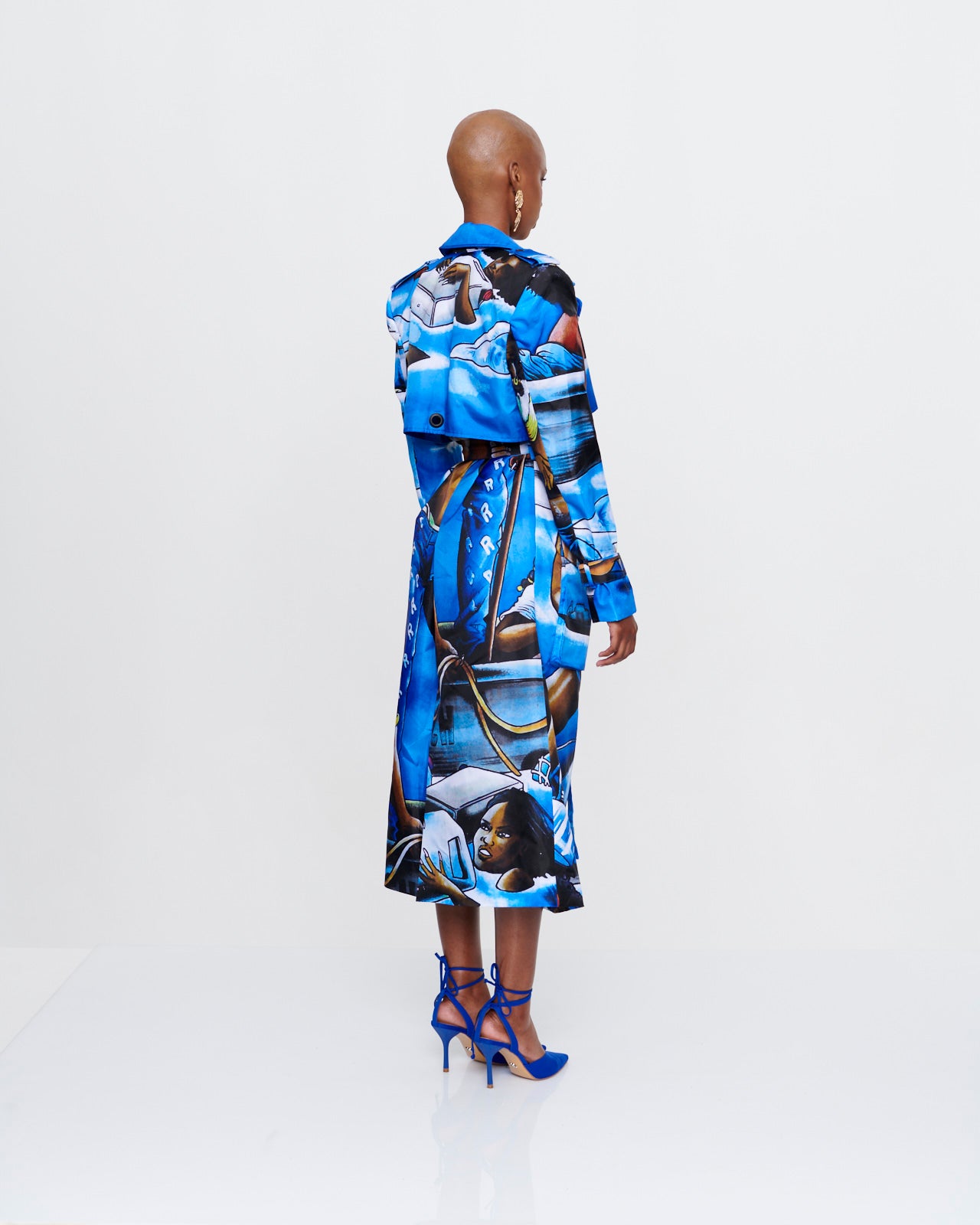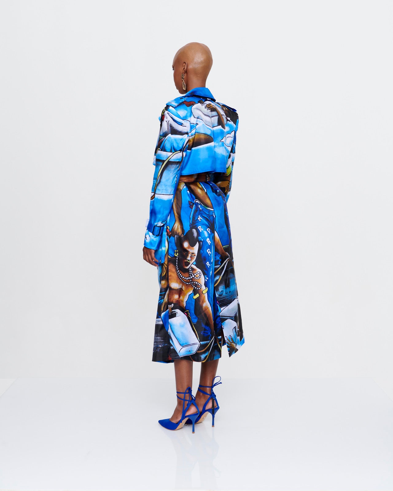 **/Description/*} The RICH MNISI Bucket Rain Coat is crafted from 'RICH MNISI' bucket rain print, a belted waist, side pockets and a tailored collar finish.