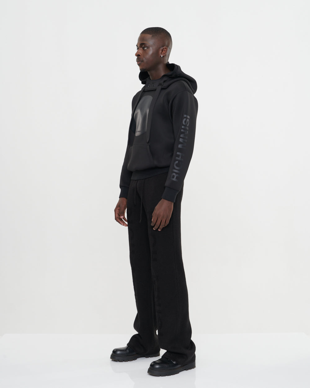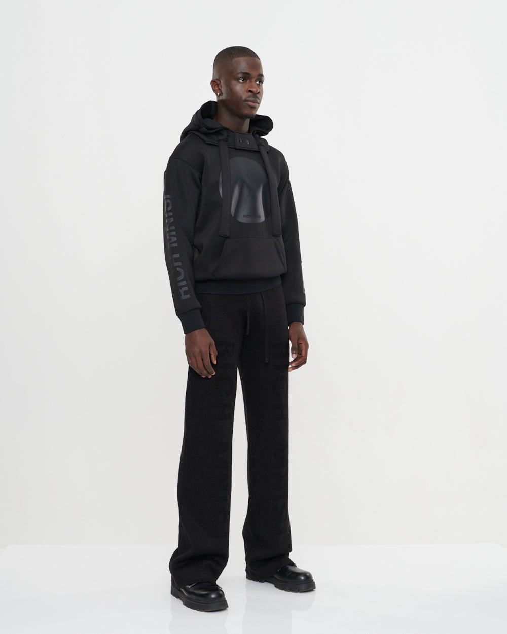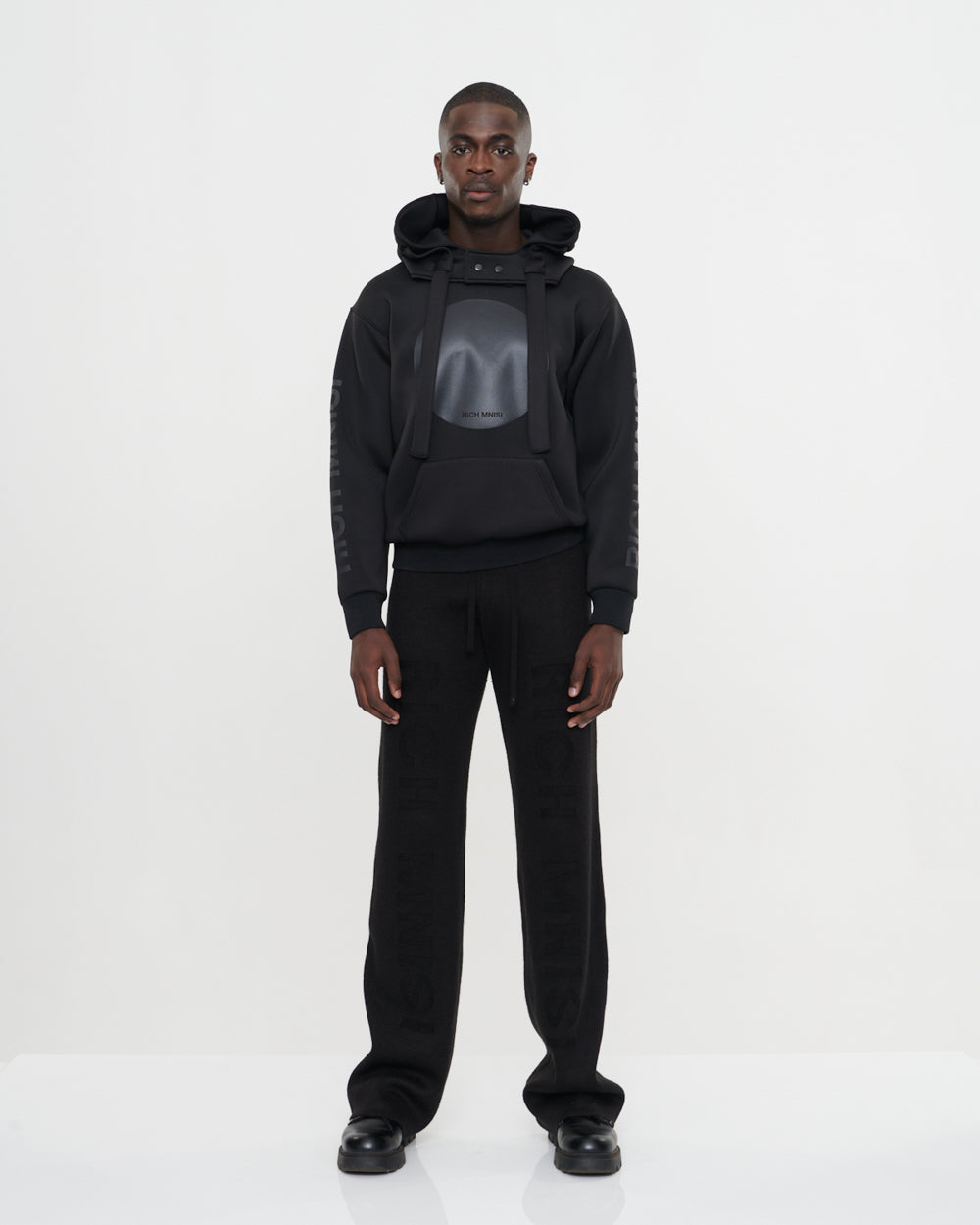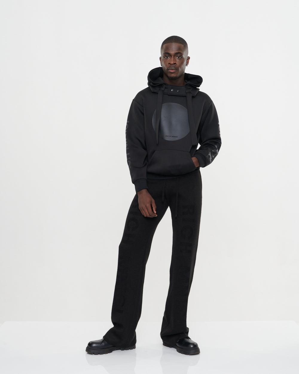 The RICH MNISI Black Moon Hoodie is crafted from a sandwich scuba and features a black moon motif on the front, a detachable hood and the sleeves accented with our tone-on-tone brand name.