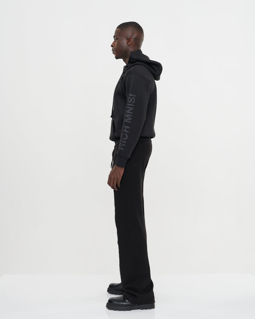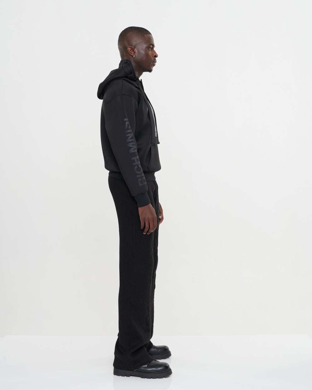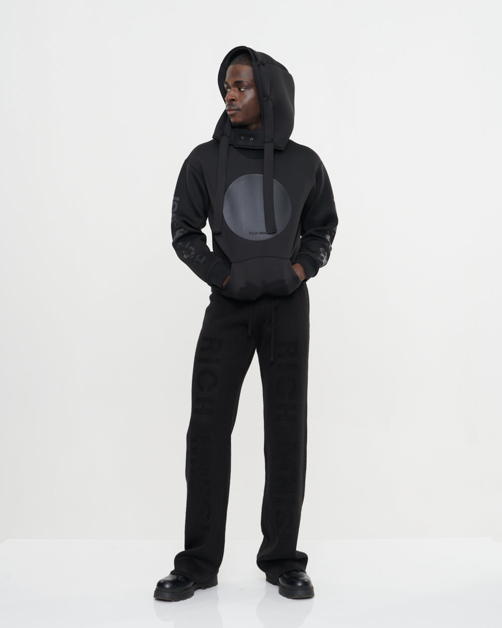 The RICH MNISI Black Moon Hoodie is crafted from a sandwich scuba and features a black moon motif on the front, a detachable hood and the sleeves accented with our tone-on-tone brand name.
