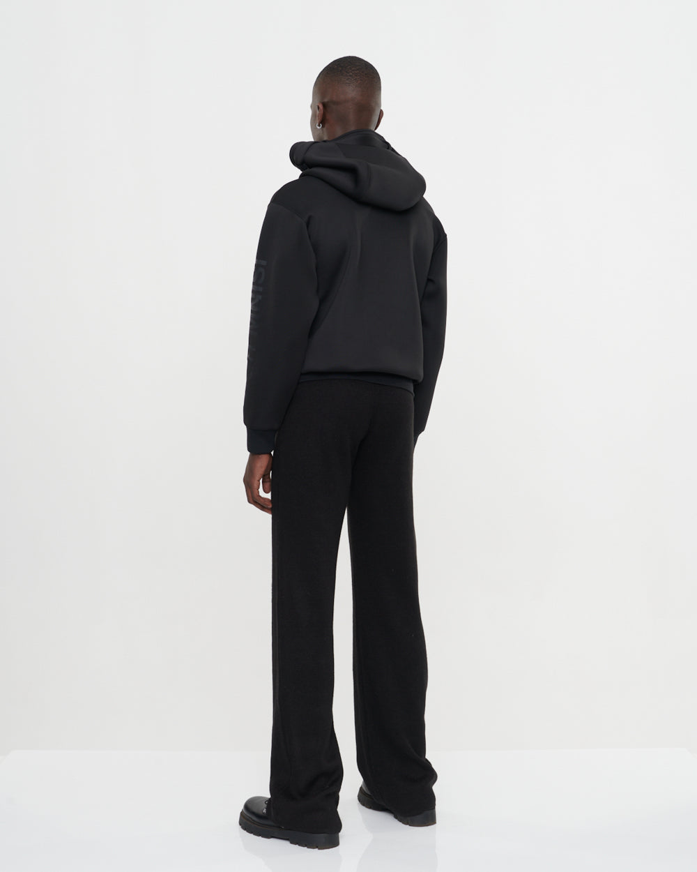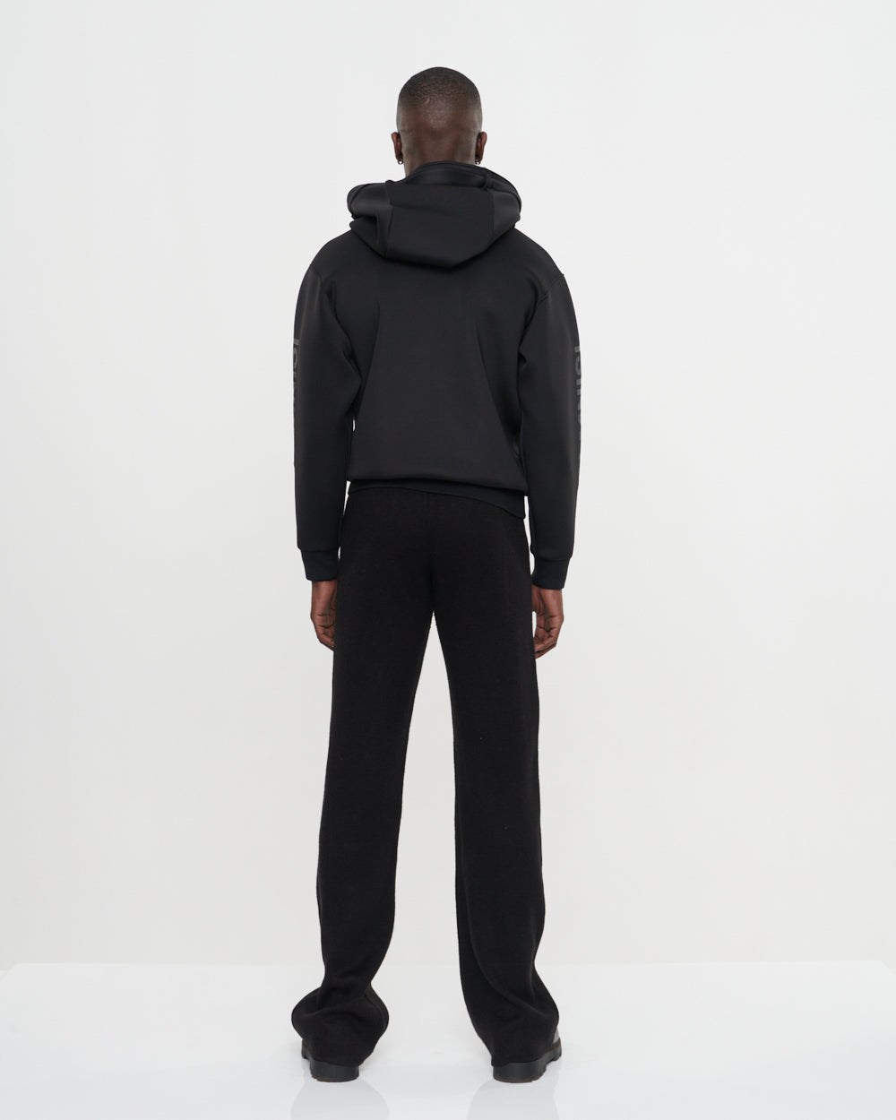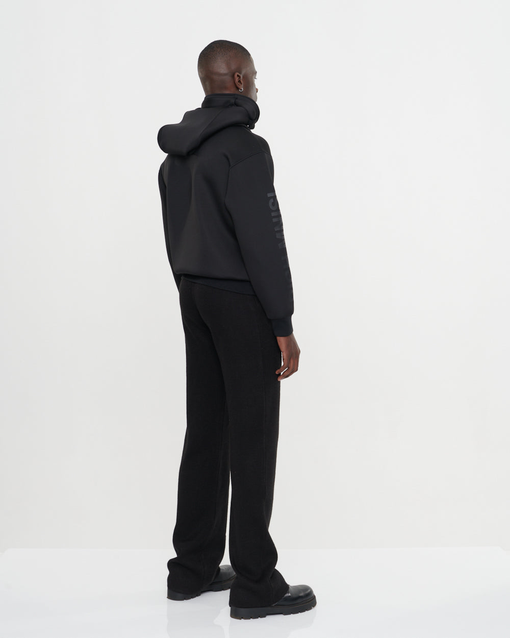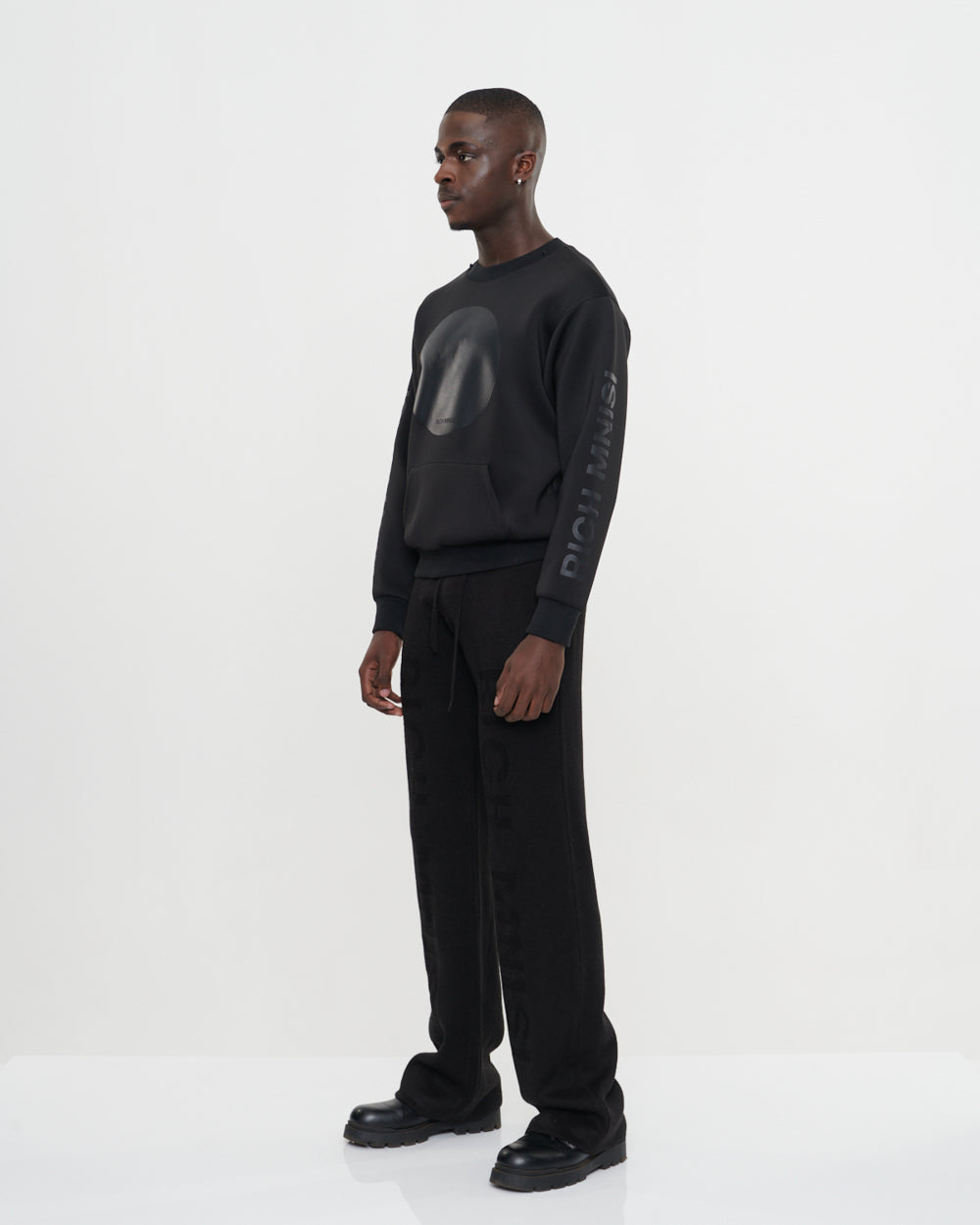 The RICH MNISI Black Moon Hoodie is crafted from a sandwich scuba and features a black moon motif on the front, a detachable hood and the sleeves accented with our tone-on-tone brand name.