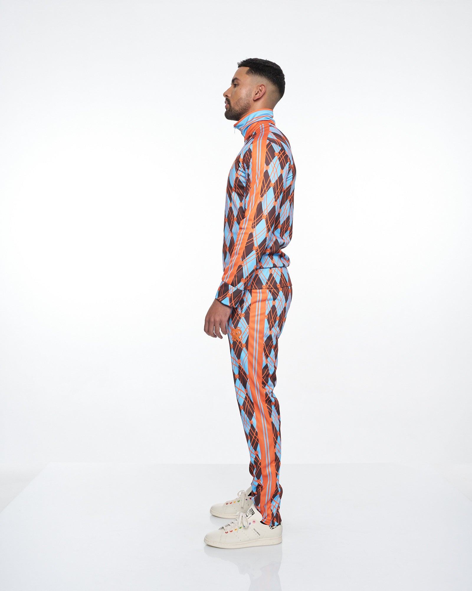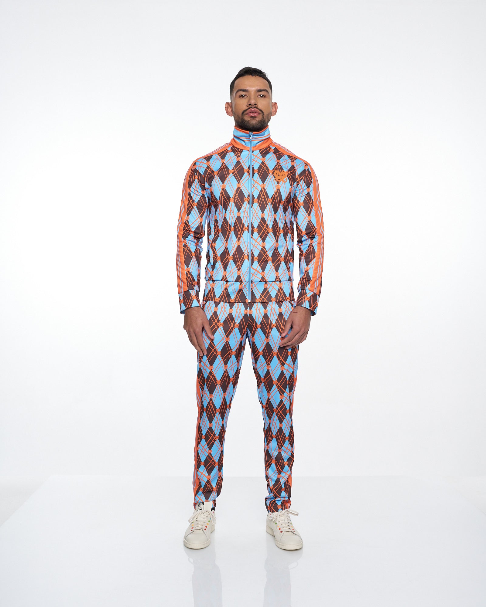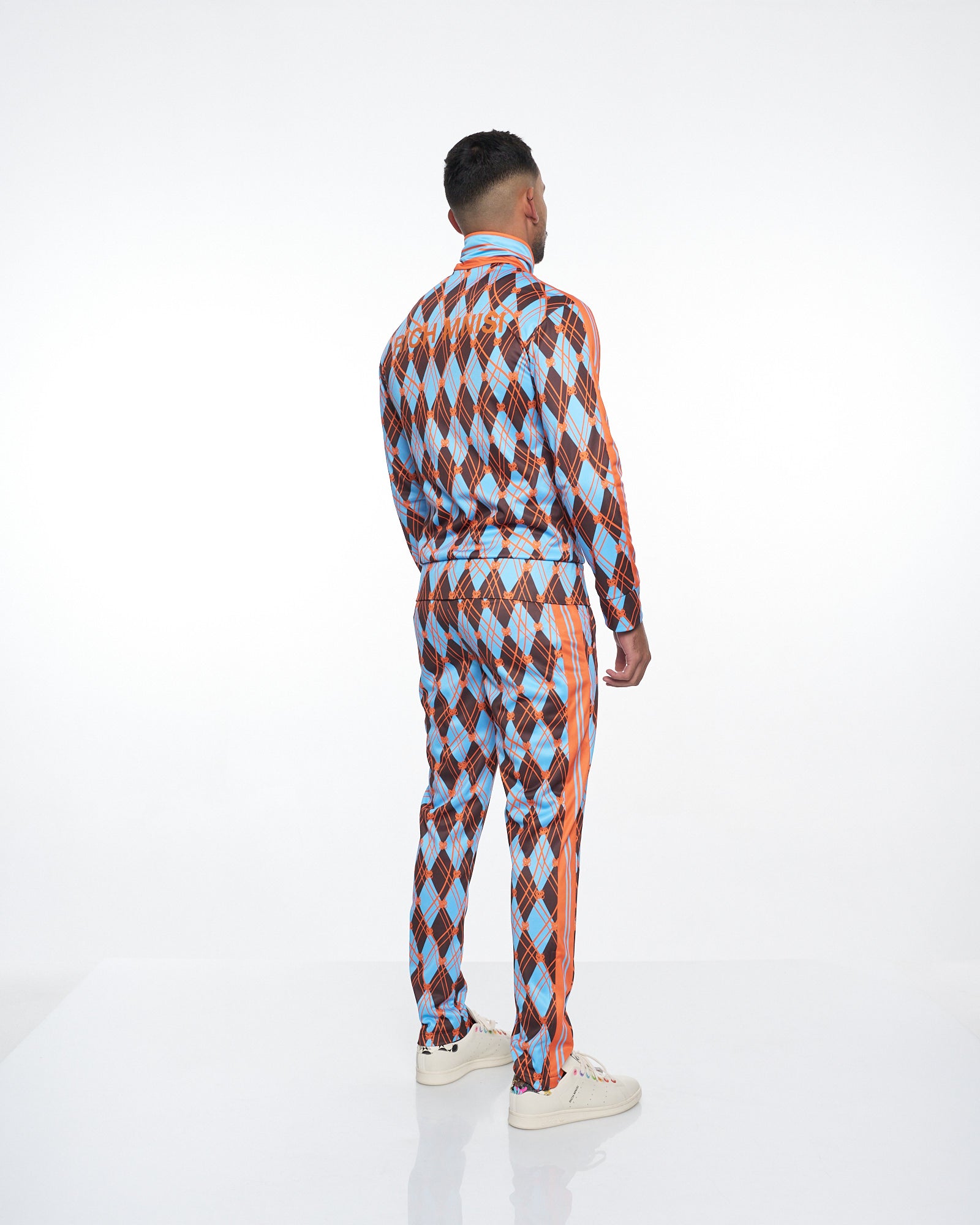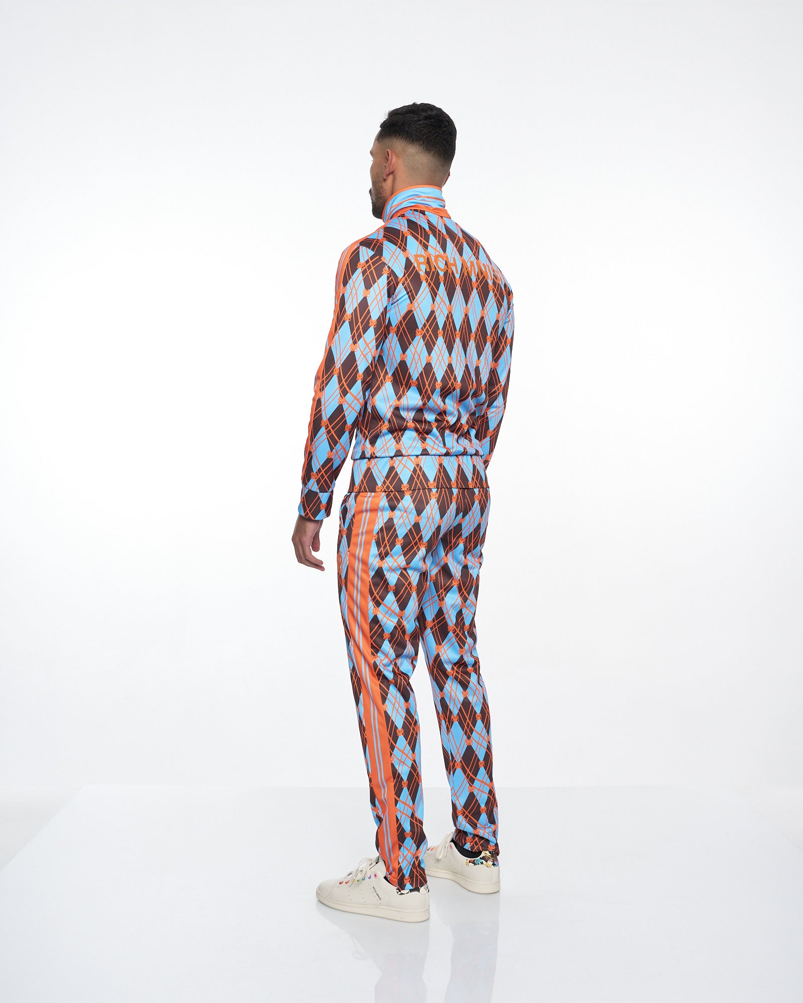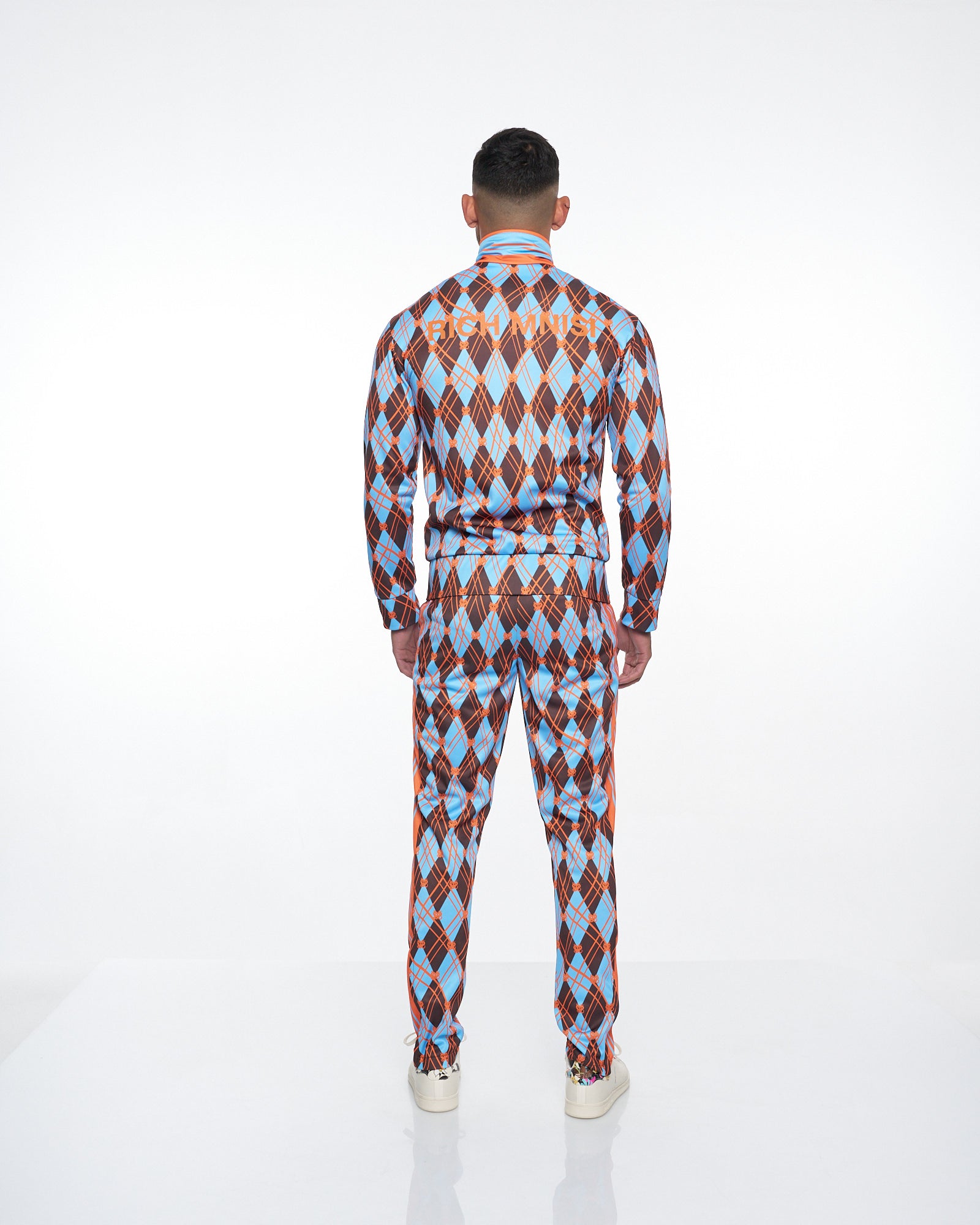 **/Description/*} The RICH MNISI Earth Argyle Track Top features a geometric argyle pattern. The track top boasts a high standing classic collar with long sleeves, featuring zip up angled welt pockets on each side. The track top provides a sleek appearance while its fitted design accentuates the body's form, with a front zipper that adds to its streamlined effect. Finished off with an embroidery of our RICH MNISI “Nyoka” emblem on the left chest and our RICH MNISI logo embroidered across the back.