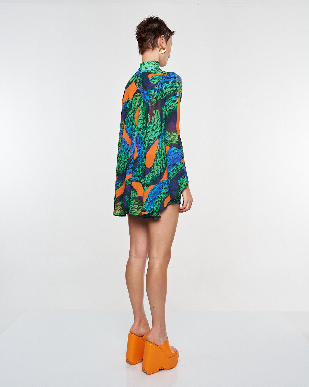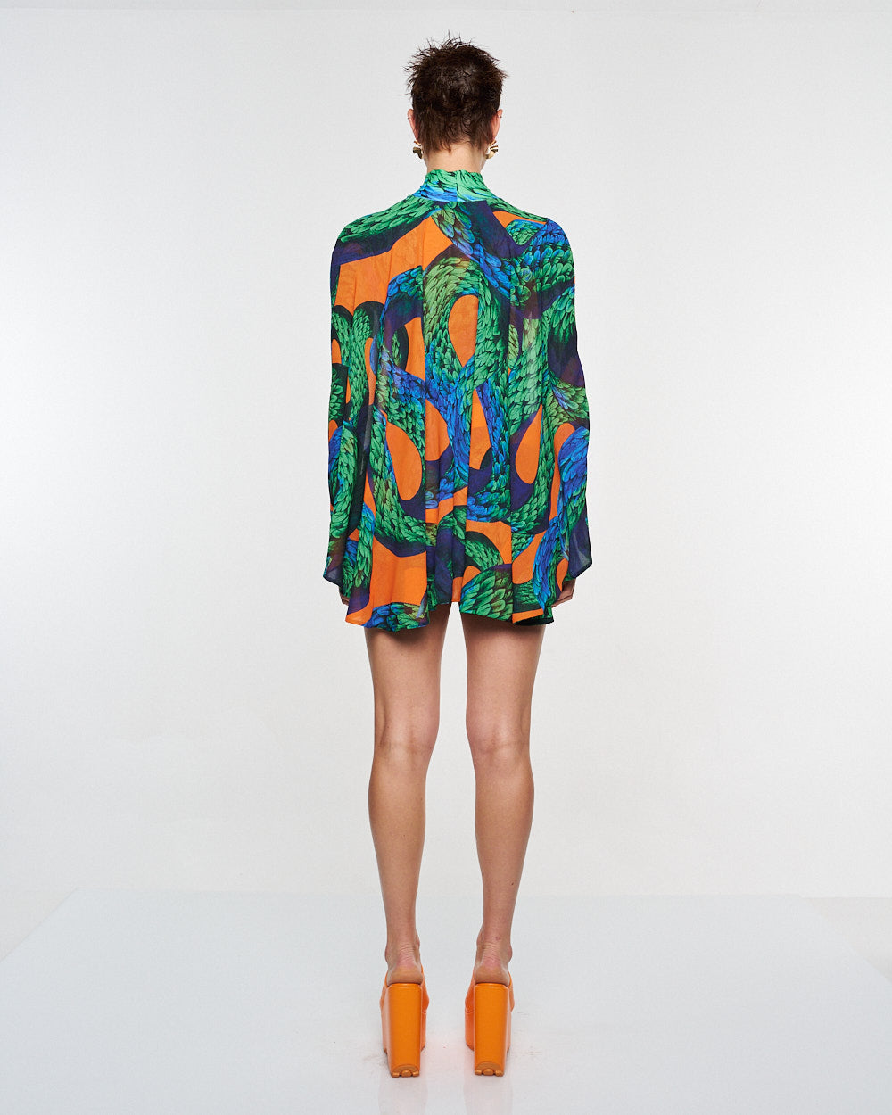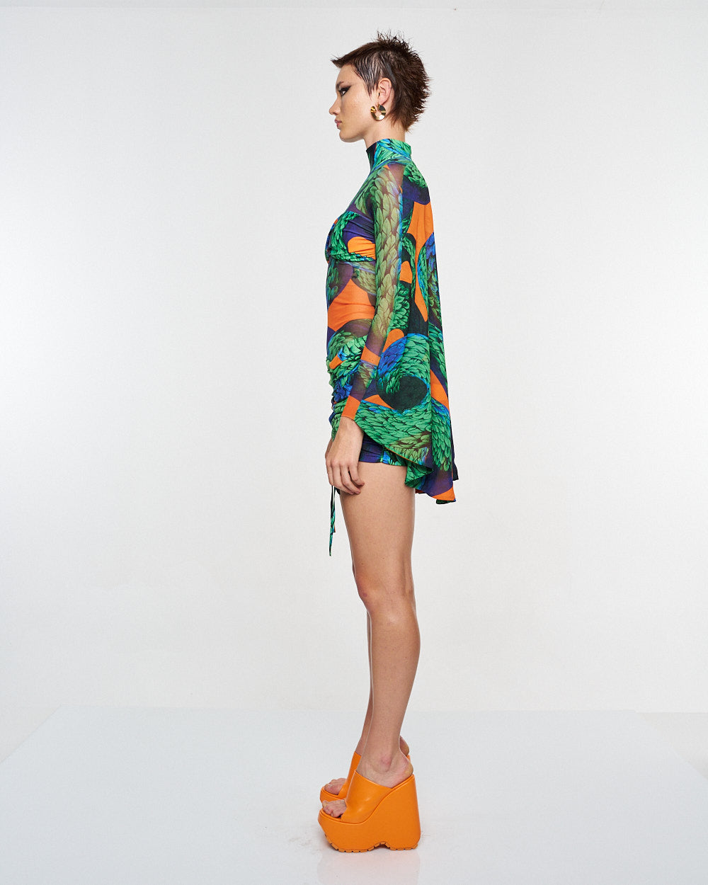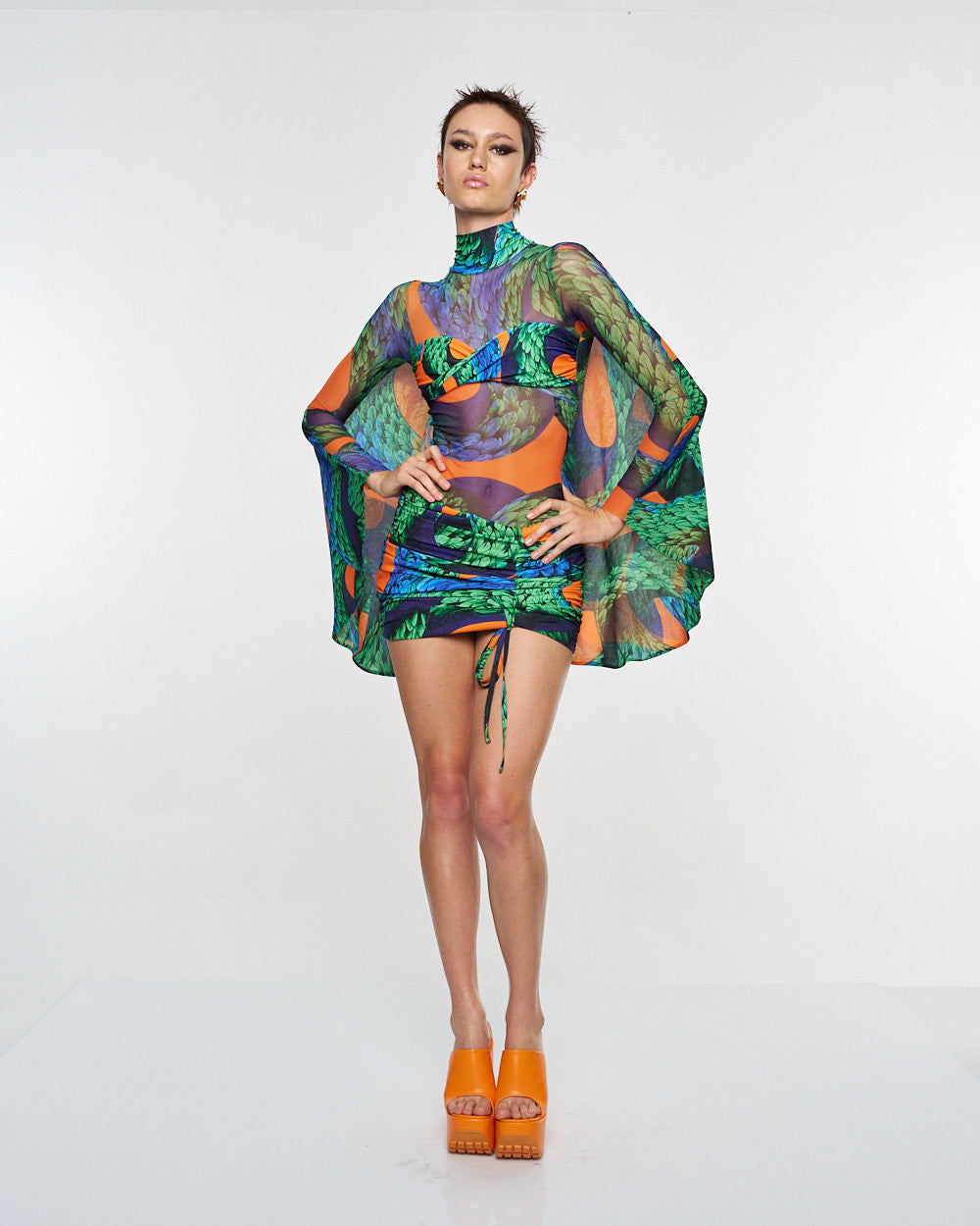 **/Description/*} The RICH MNISI Feathered Snake Cape Tube is a stretch sheer turtleneck patterned with the feathered snake print and features a twist bralet attached to the front and an eye-catching cape that extends from the shoulders.