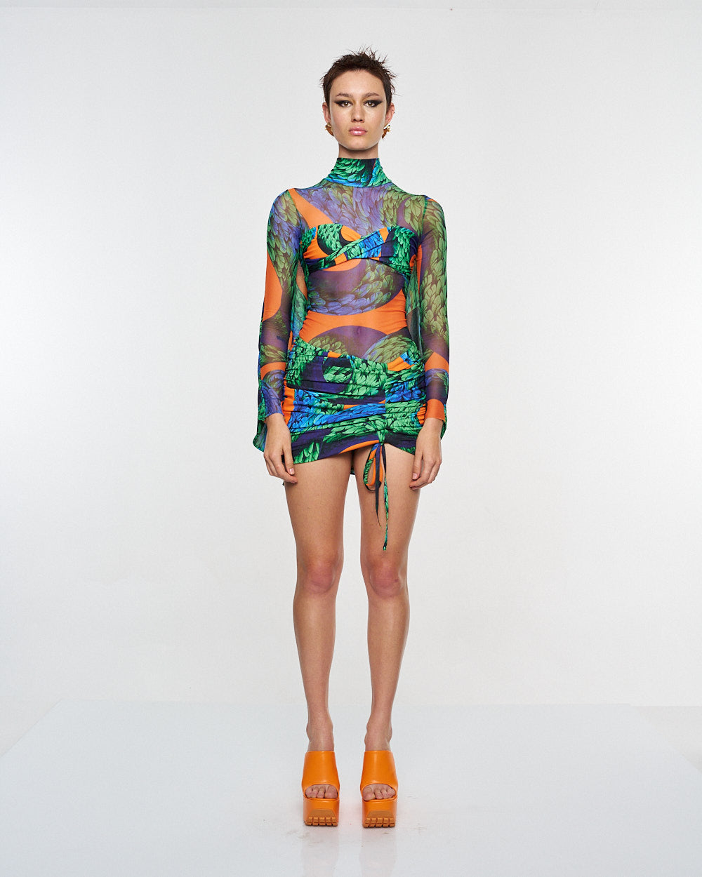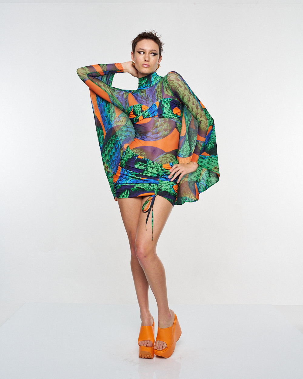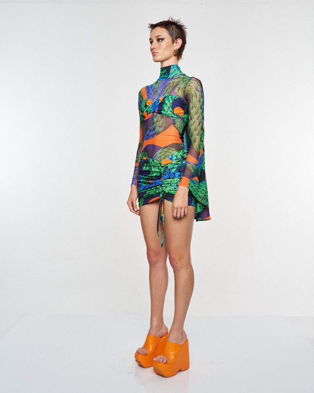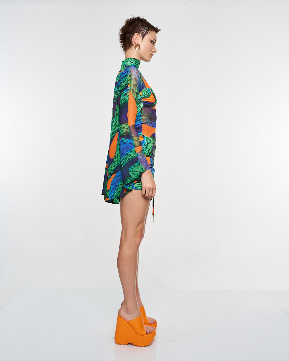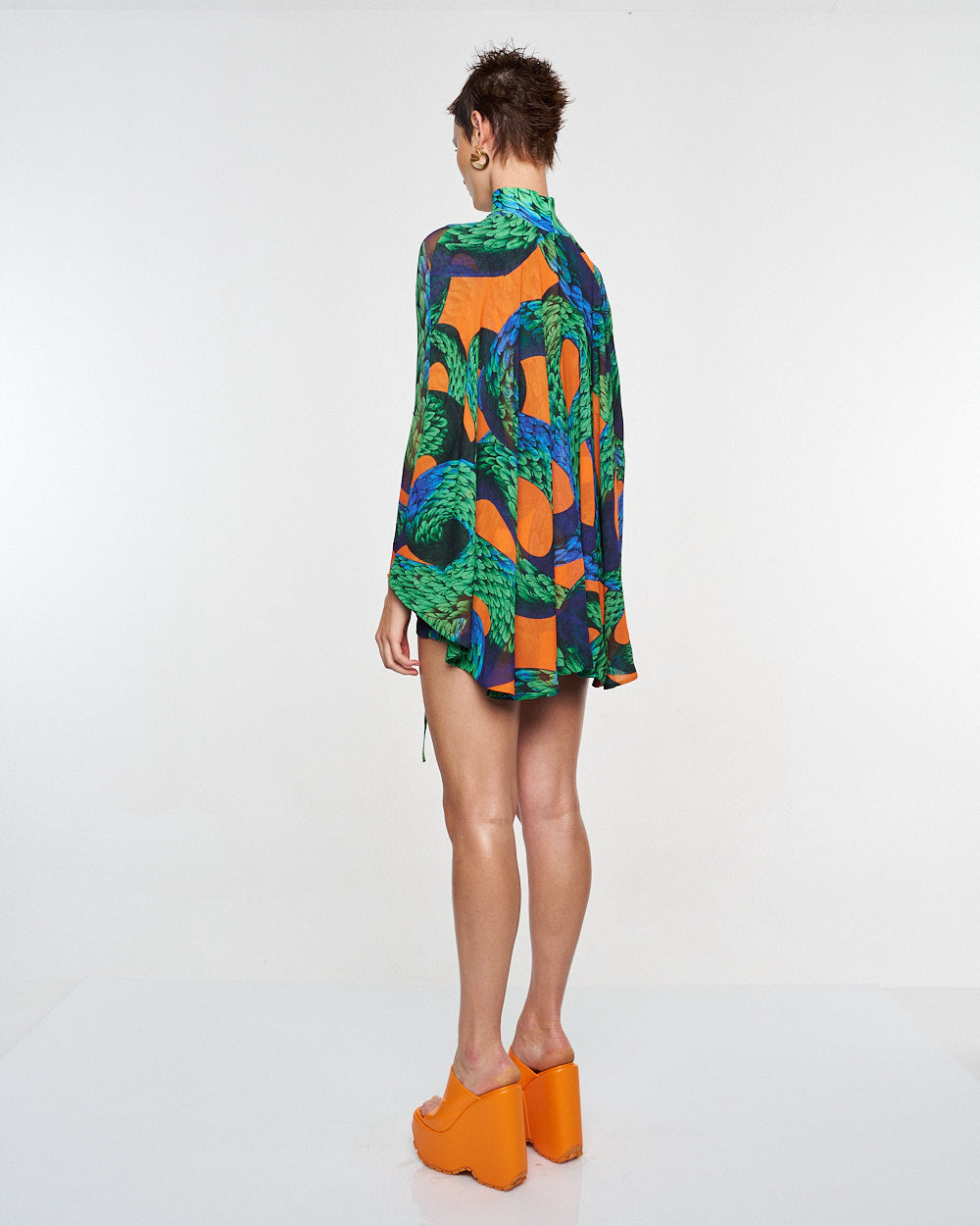 **/Description/*} The RICH MNISI Feathered Snake Cape Tube is a stretch sheer turtleneck patterned with the feathered snake print and features a twist bralet attached to the front and an eye-catching cape that extends from the shoulders.