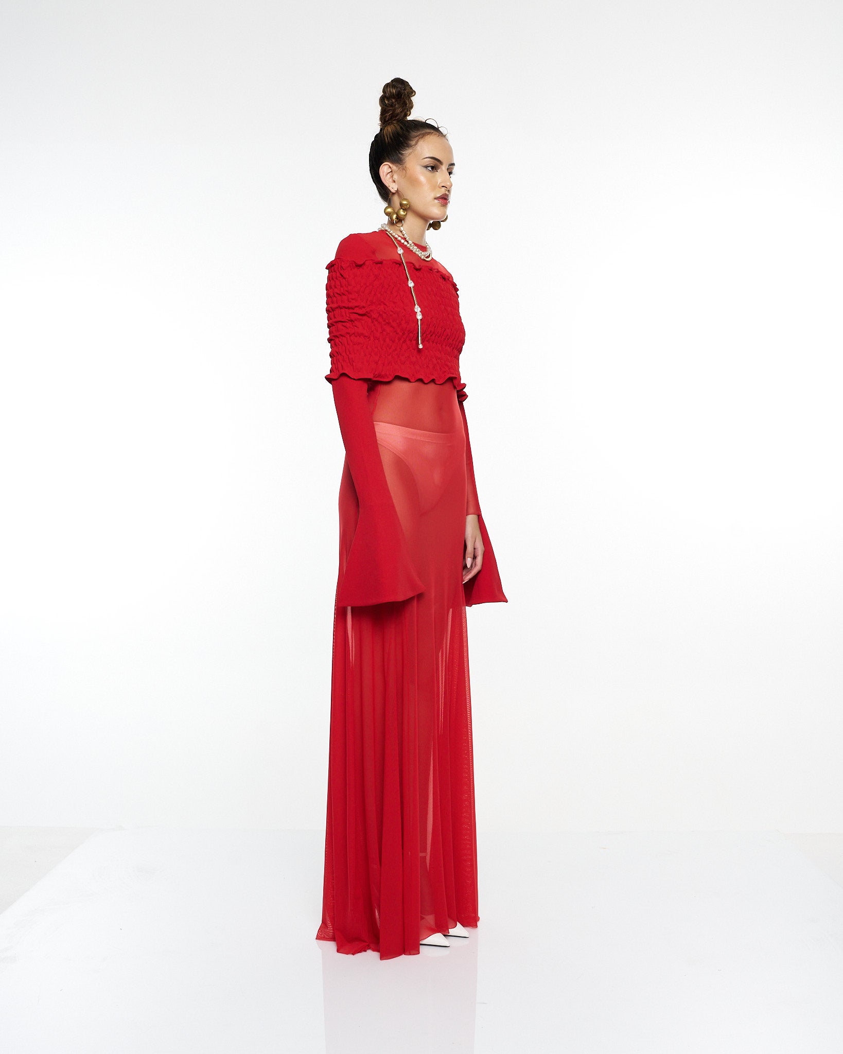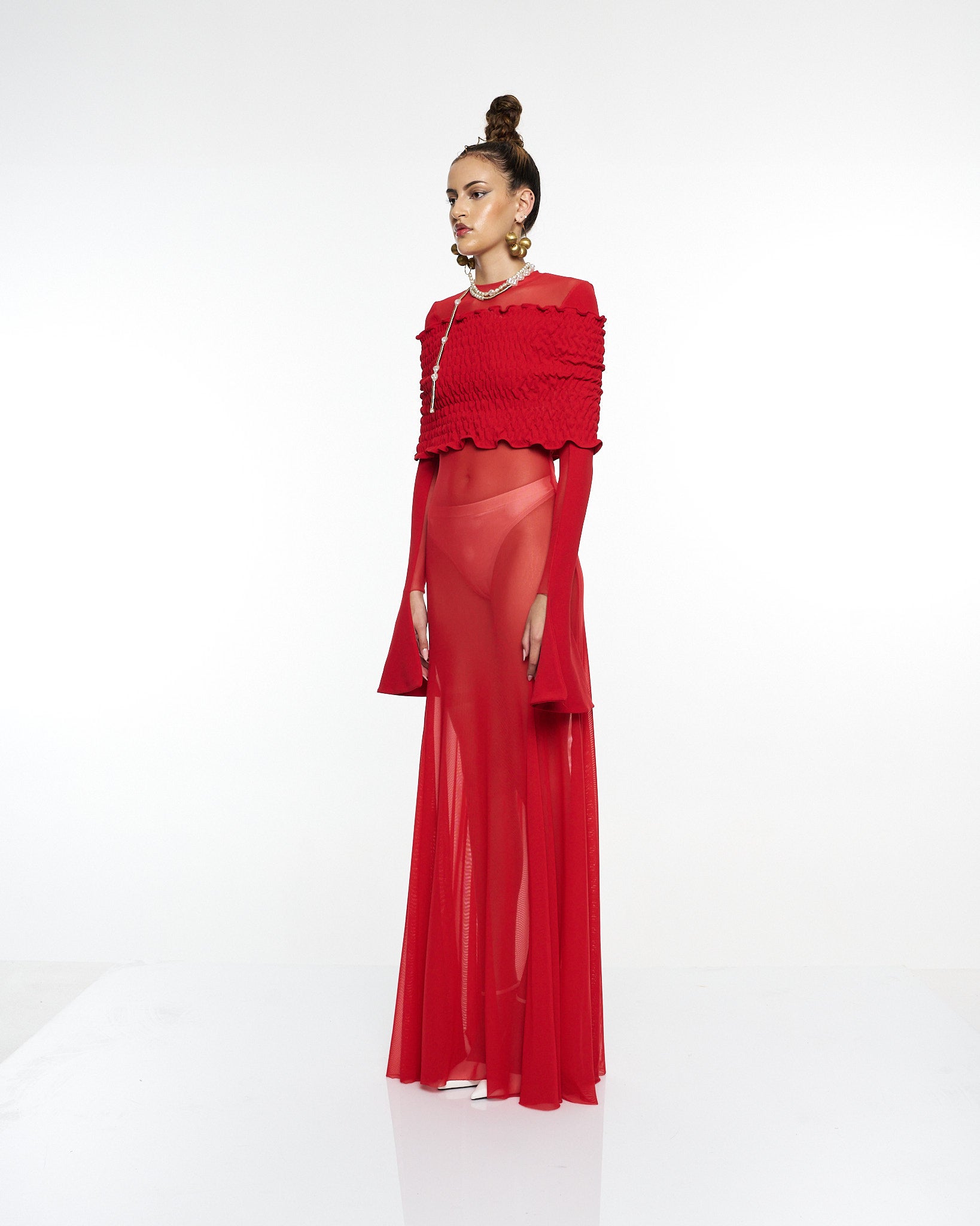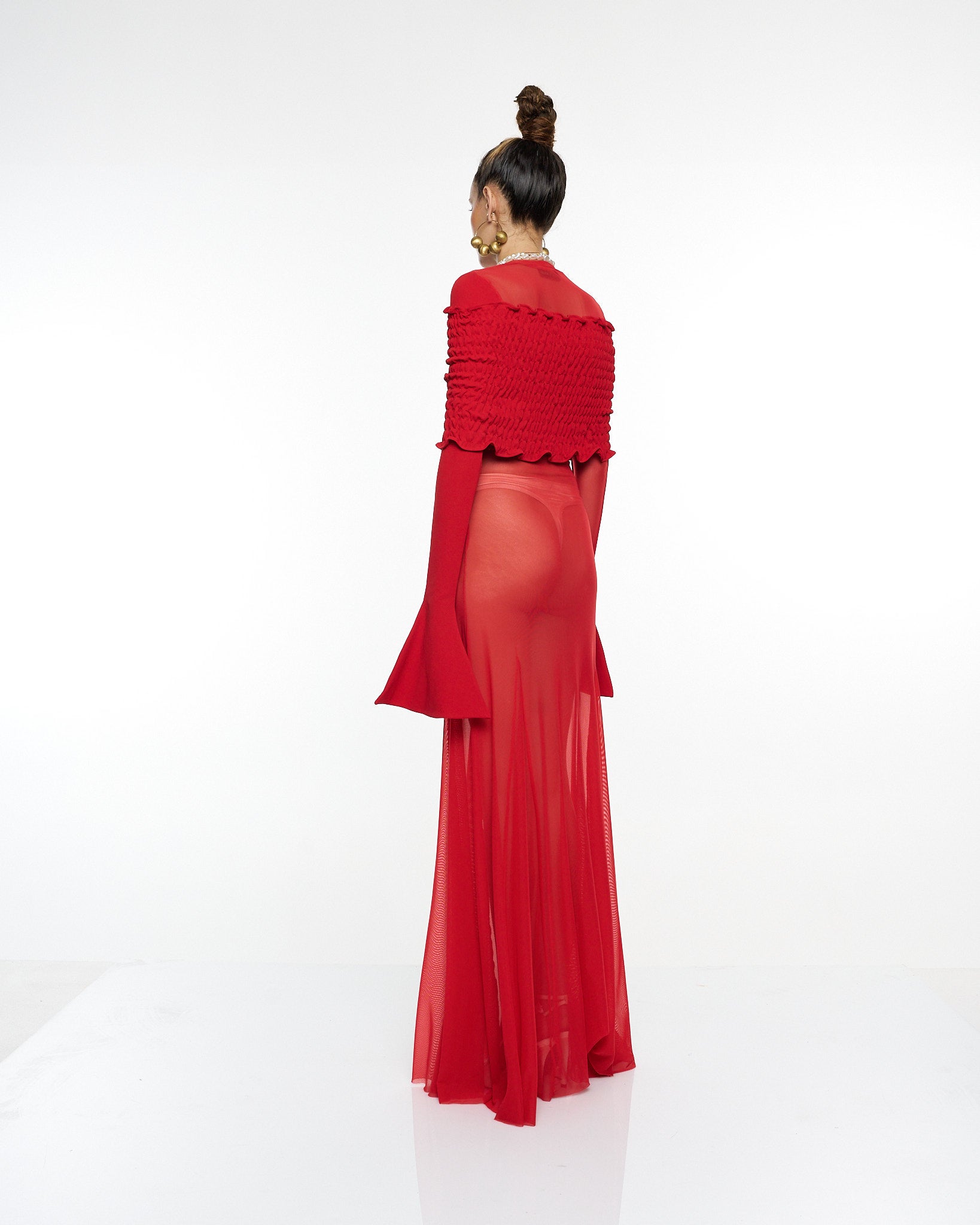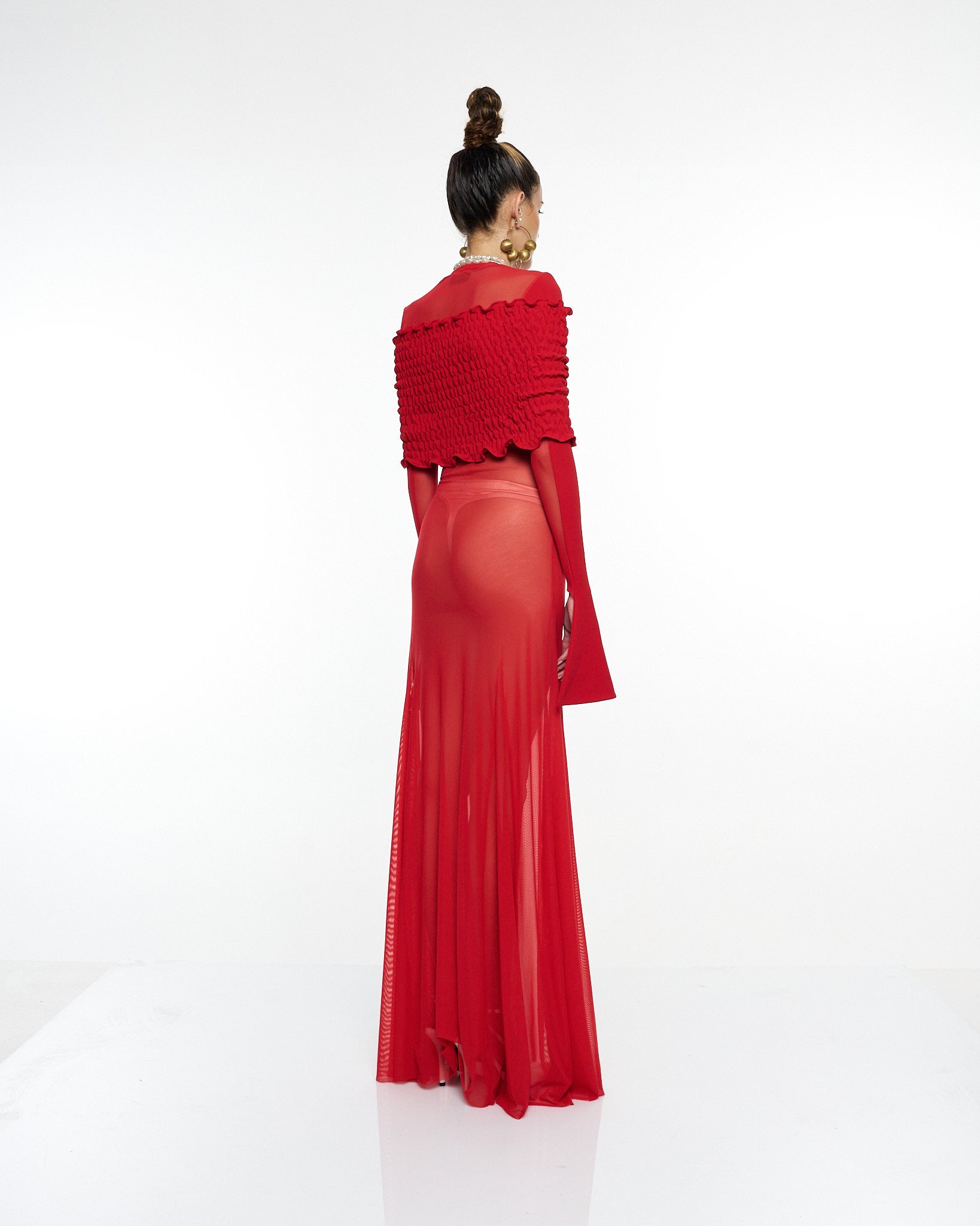 **/Description/*} The RICH MNISI Flame Tide Dress is crafted from delicate mesh & textured shirring, featuring an off-the-shoulder shirring top flowing into a sheer maxi dress. Bell sleeves and fluid draping create a striking silhouette, exuding effortless sensuality.