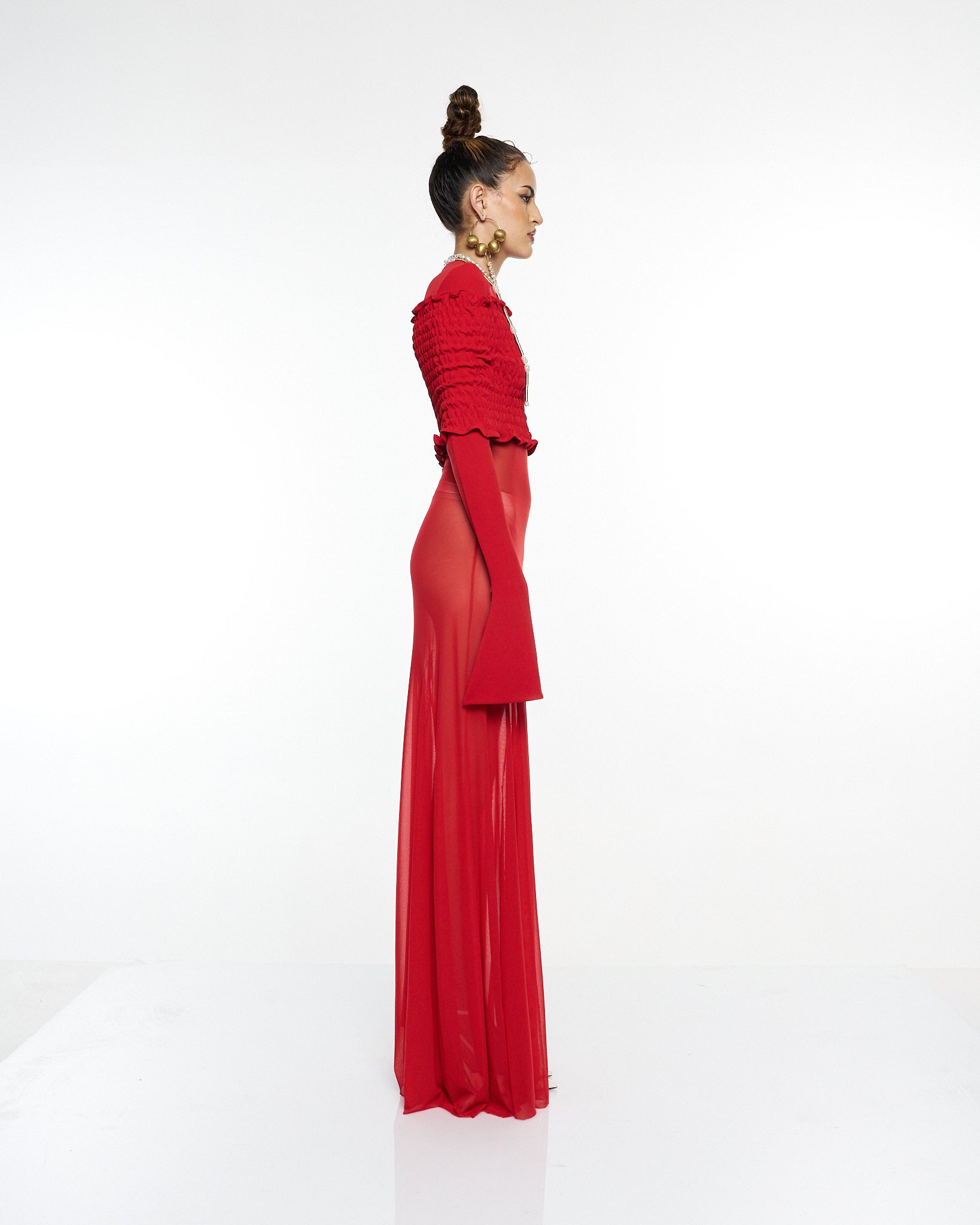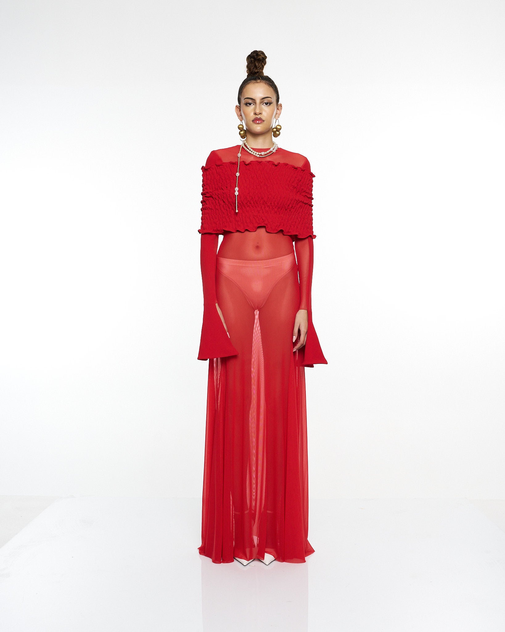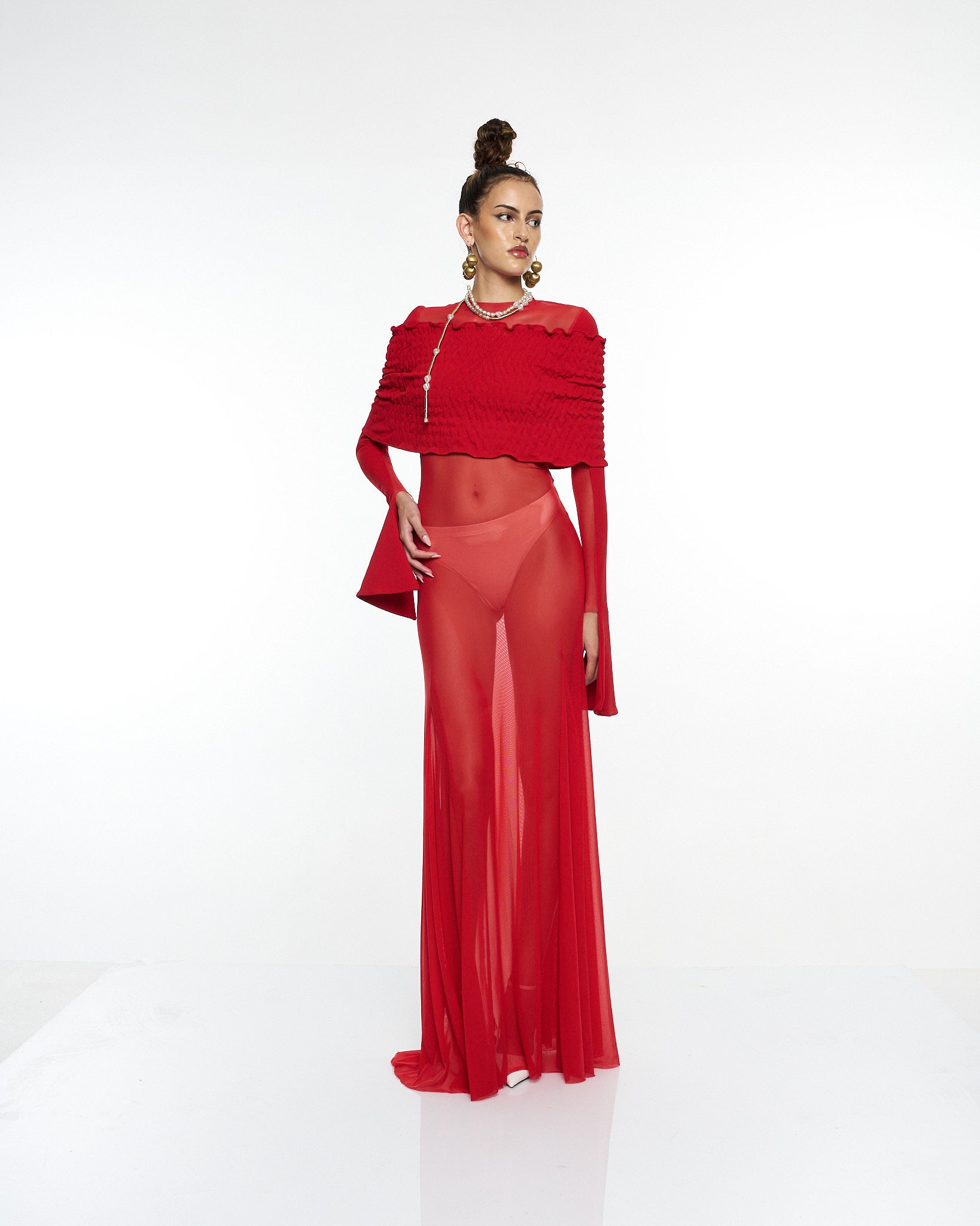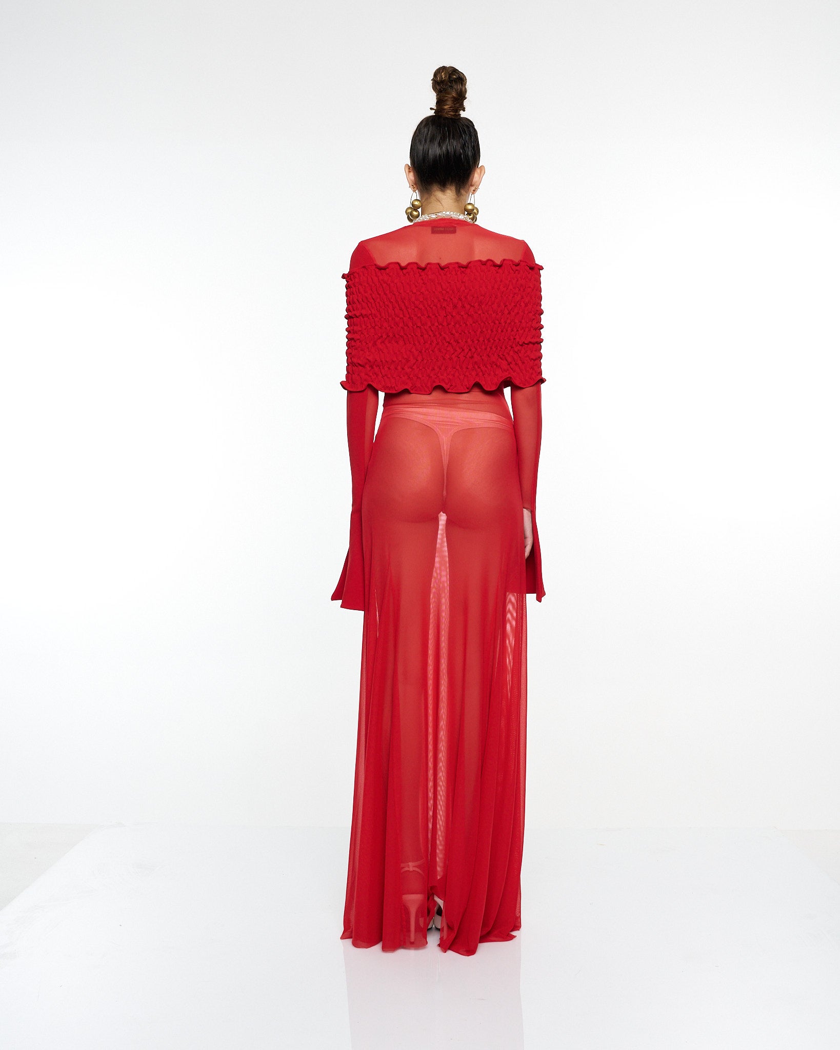**/Description/*} The RICH MNISI Flame Tide Dress is crafted from delicate mesh & textured shirring, featuring an off-the-shoulder shirring top flowing into a sheer maxi dress. Bell sleeves and fluid draping create a striking silhouette, exuding effortless sensuality.