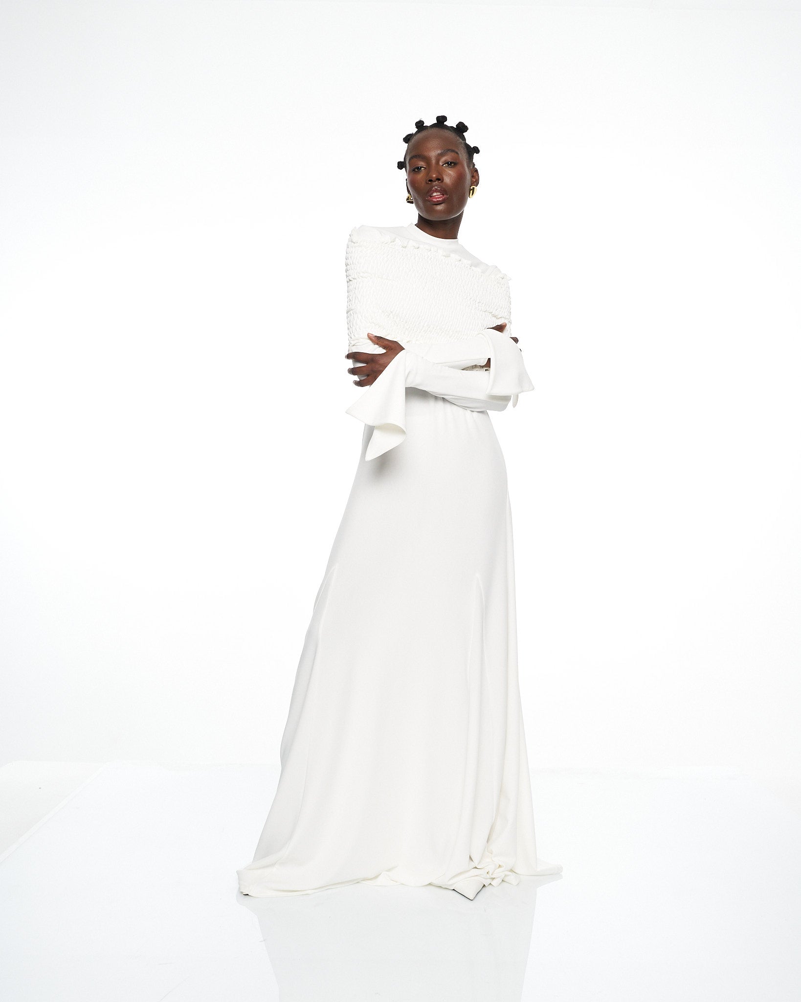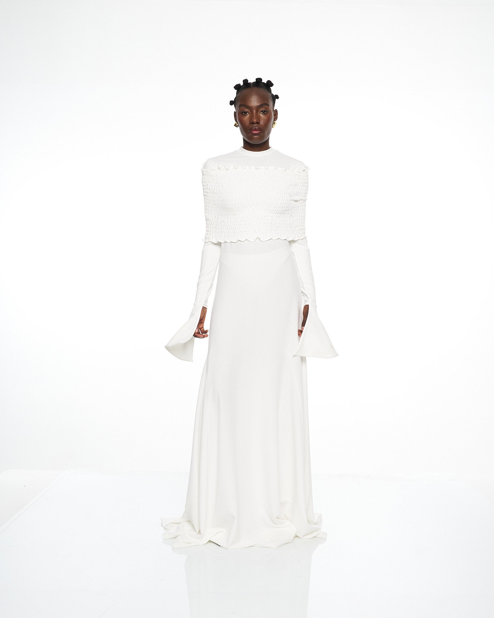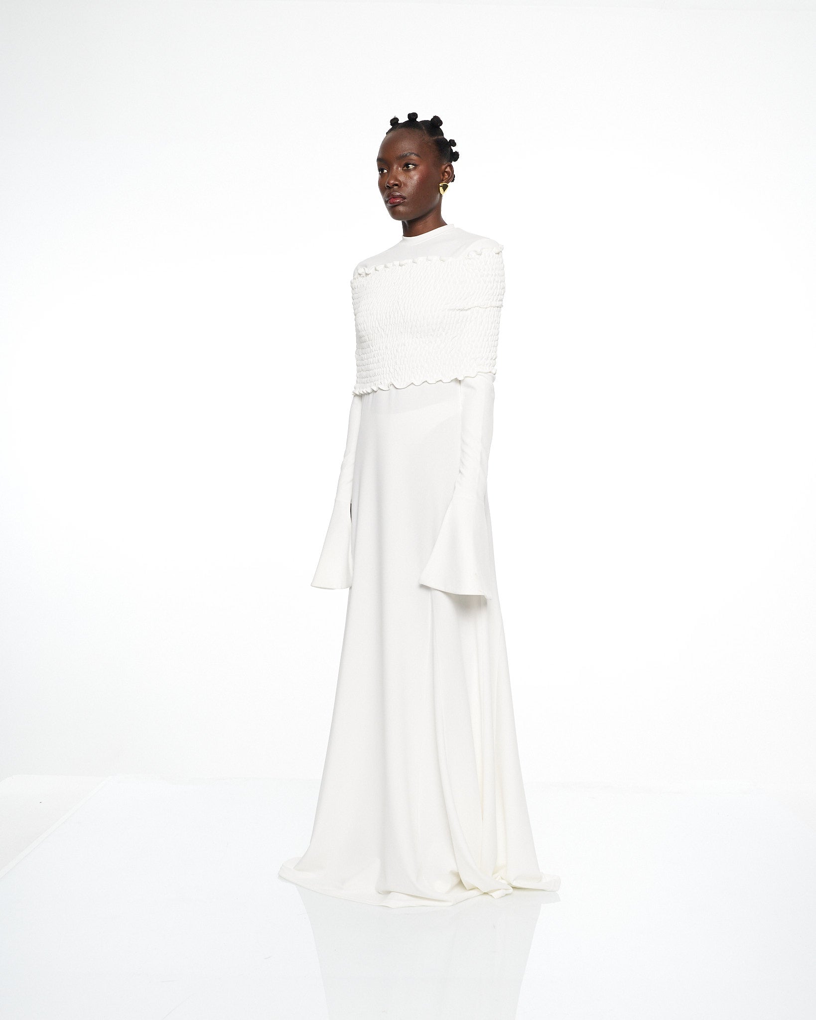 **/Description/*} The RICH MNISI Purity Tide Dress is crafted from delicate crepe & textured shirring, featuring an off-the-shoulder shirring top flowing into a sheer maxi dress. Bell sleeves and fluid draping create a striking silhouette, exuding effortless sensuality.