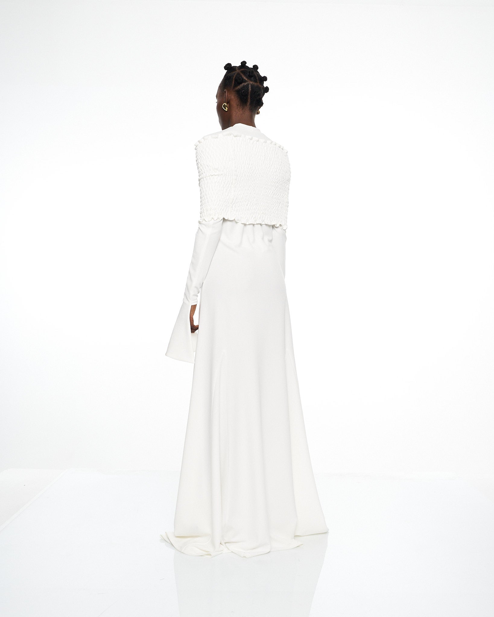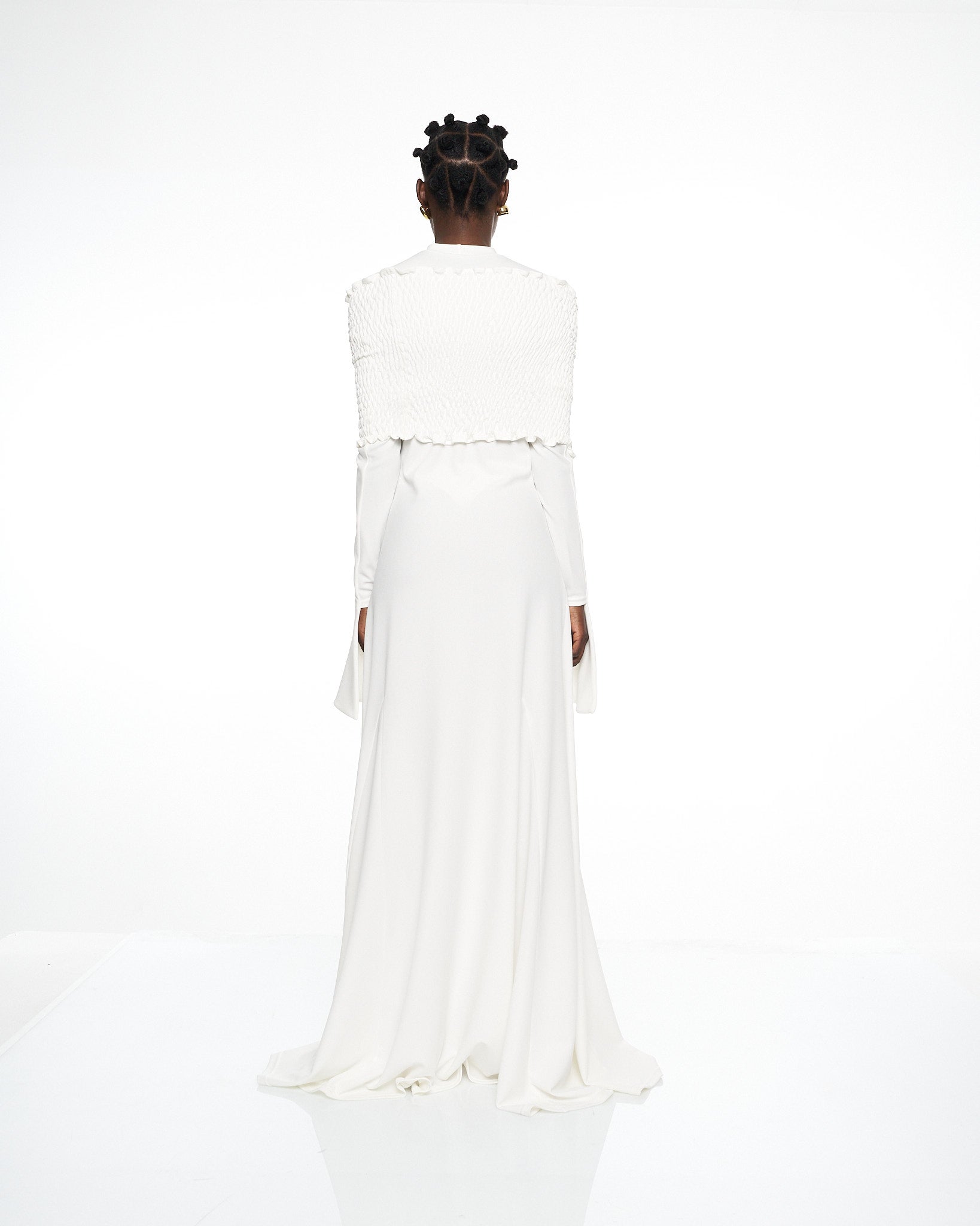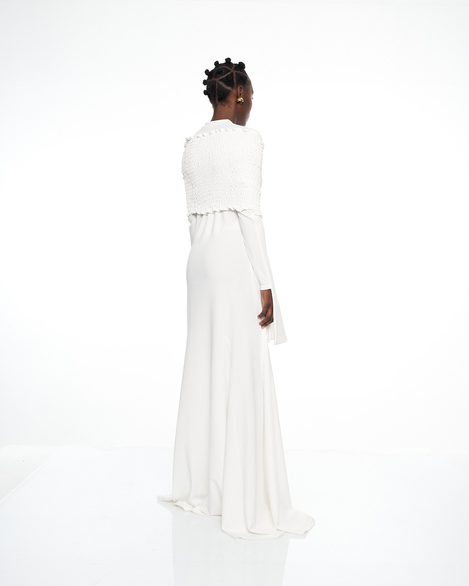 **/Description/*} The RICH MNISI Purity Tide Dress is crafted from delicate crepe & textured shirring, featuring an off-the-shoulder shirring top flowing into a sheer maxi dress. Bell sleeves and fluid draping create a striking silhouette, exuding effortless sensuality.