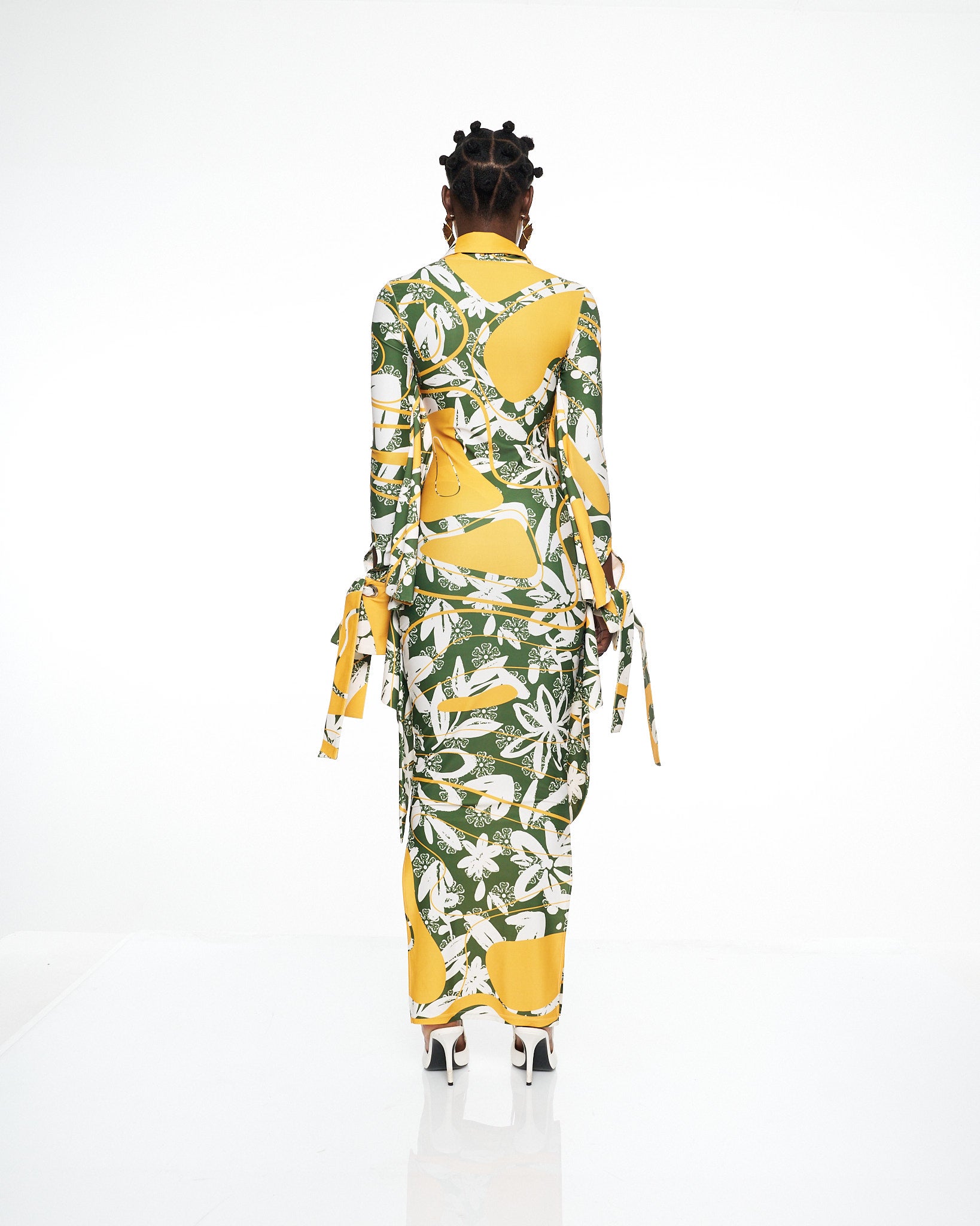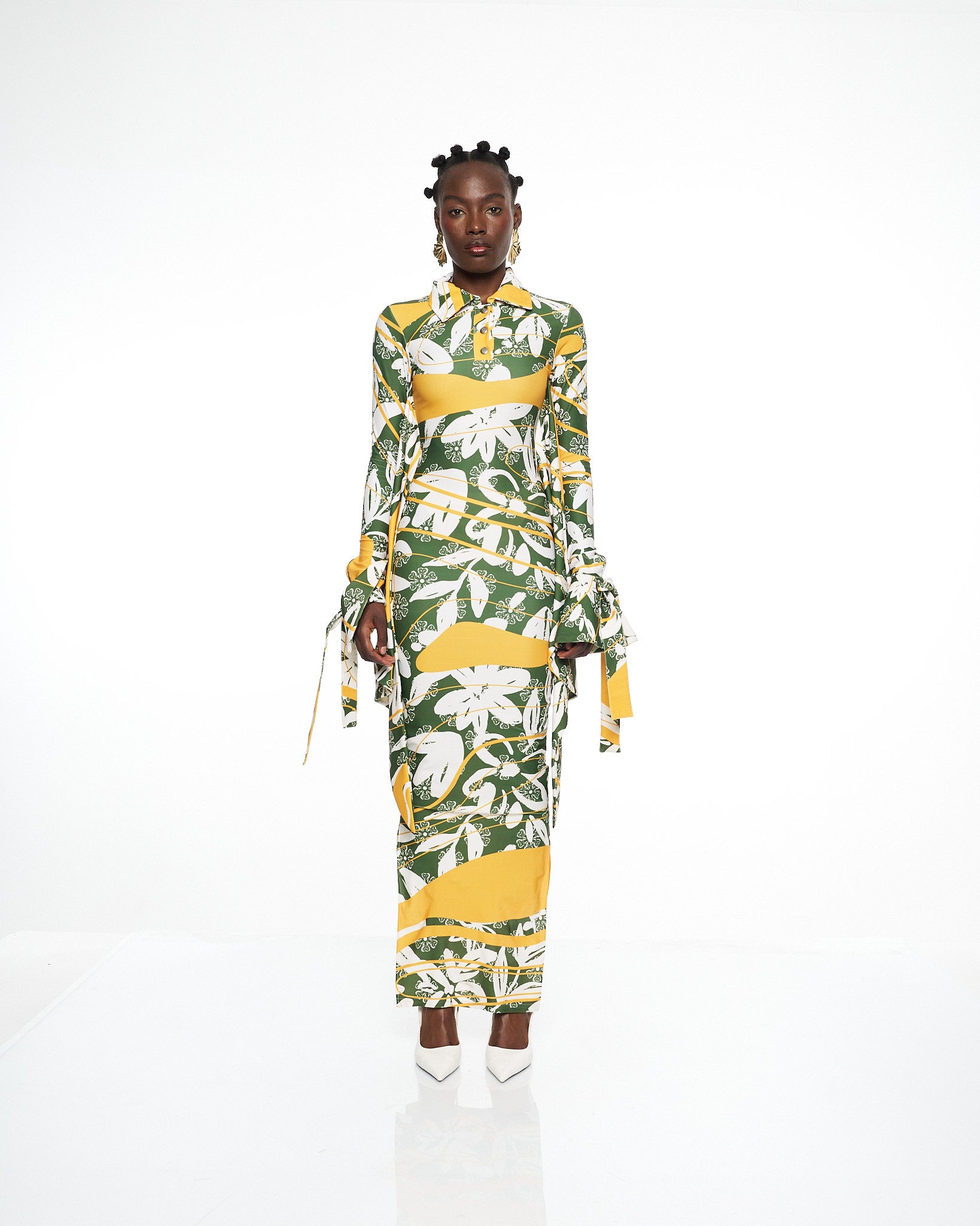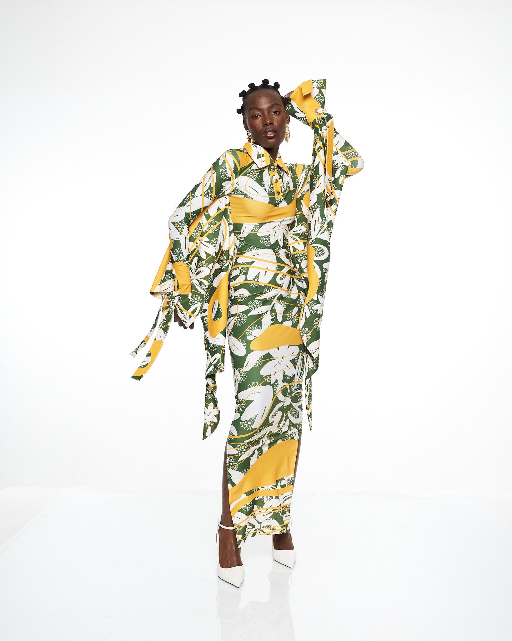 **/Description/*} The RICH MNISI Wing Sunset Dress is crafted in a fluid printed lycra that contours the body through a fitted bodice before extending into dramatic winged sleeves that drape and flow from the arms. The high collar and elongated midi silhouette create a sense of ceremony and power, while the bold botanical print moves with the body like a living tapestry.