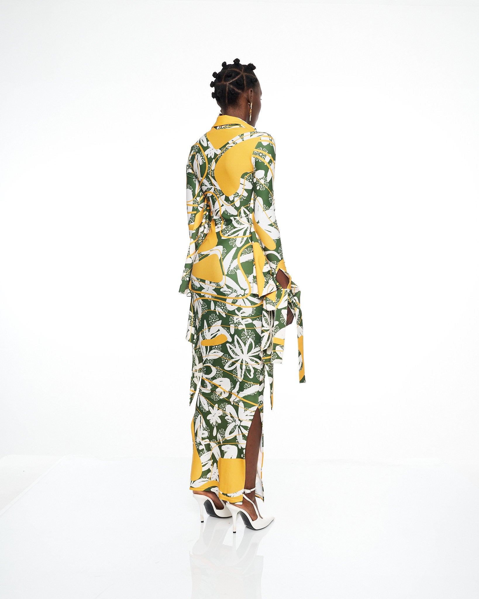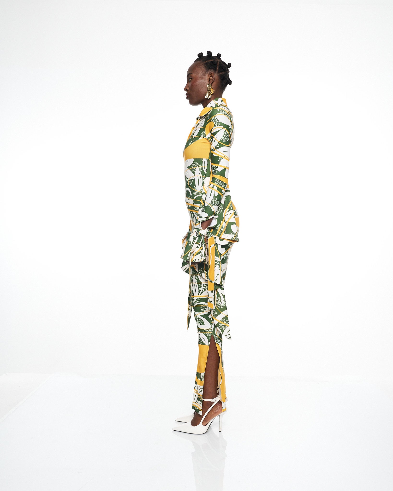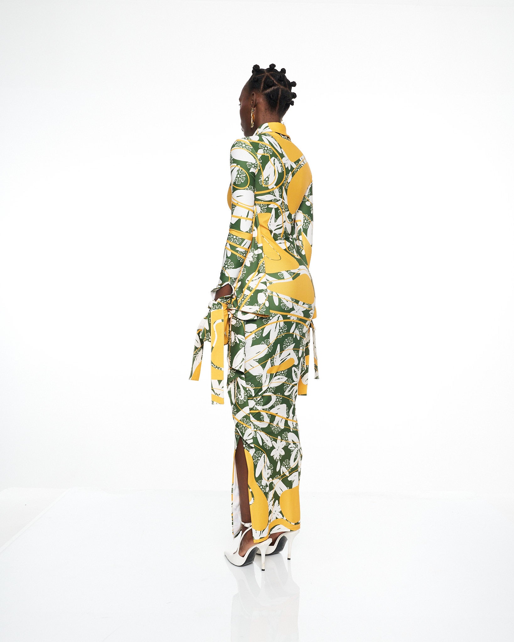 **/Description/*} The RICH MNISI Wing Sunset Dress is crafted in a fluid printed lycra that contours the body through a fitted bodice before extending into dramatic winged sleeves that drape and flow from the arms. The high collar and elongated midi silhouette create a sense of ceremony and power, while the bold botanical print moves with the body like a living tapestry.