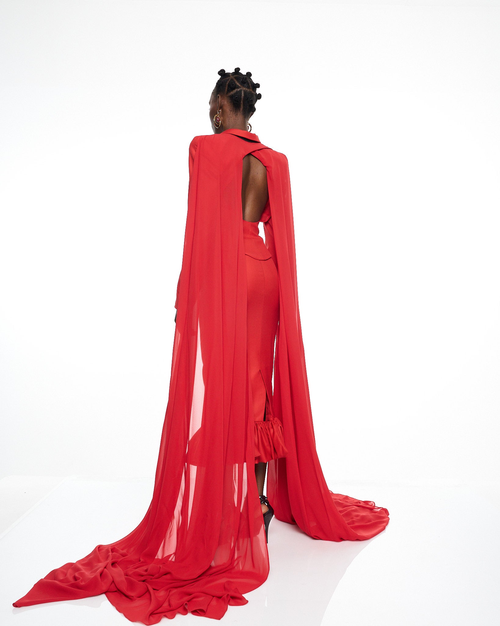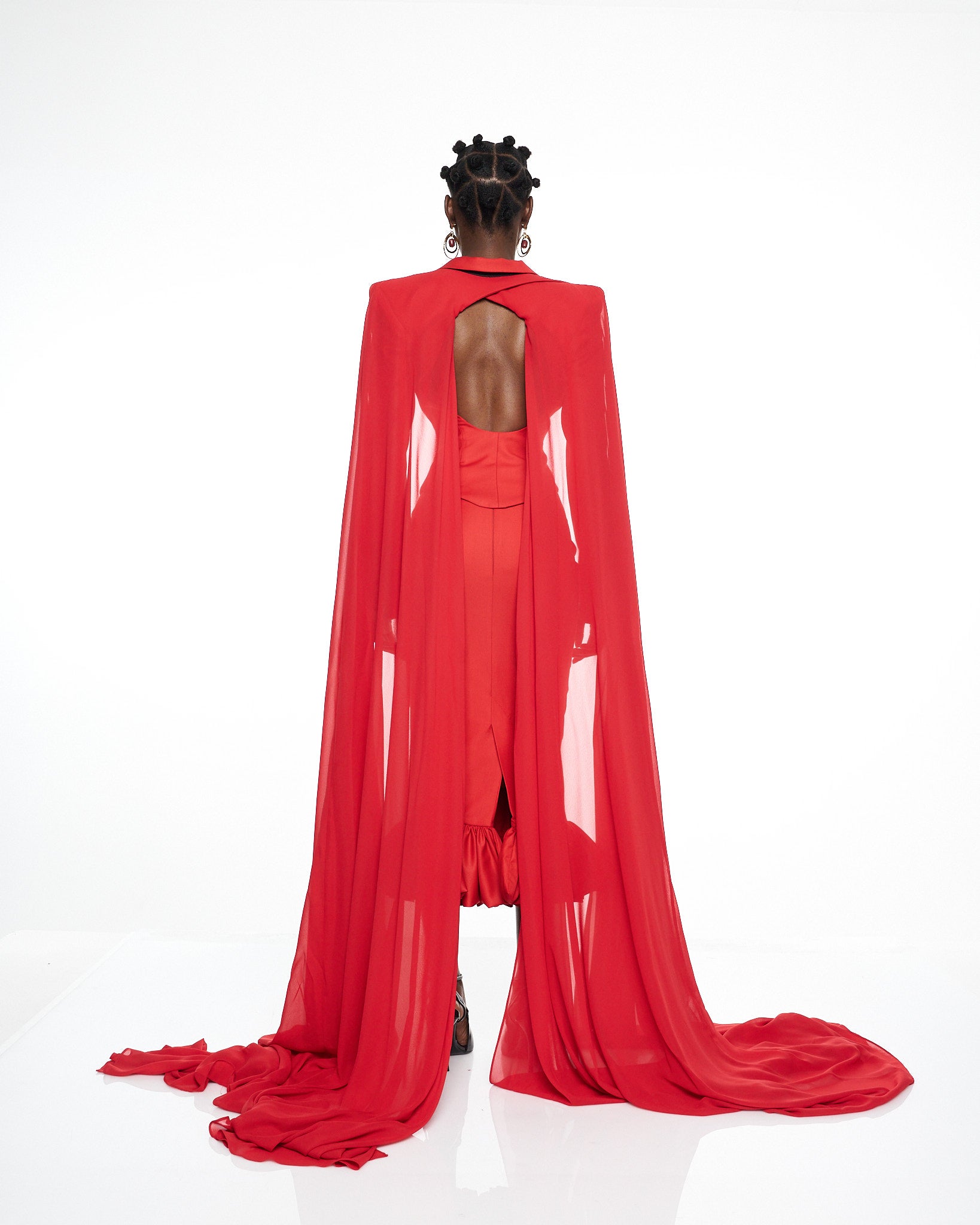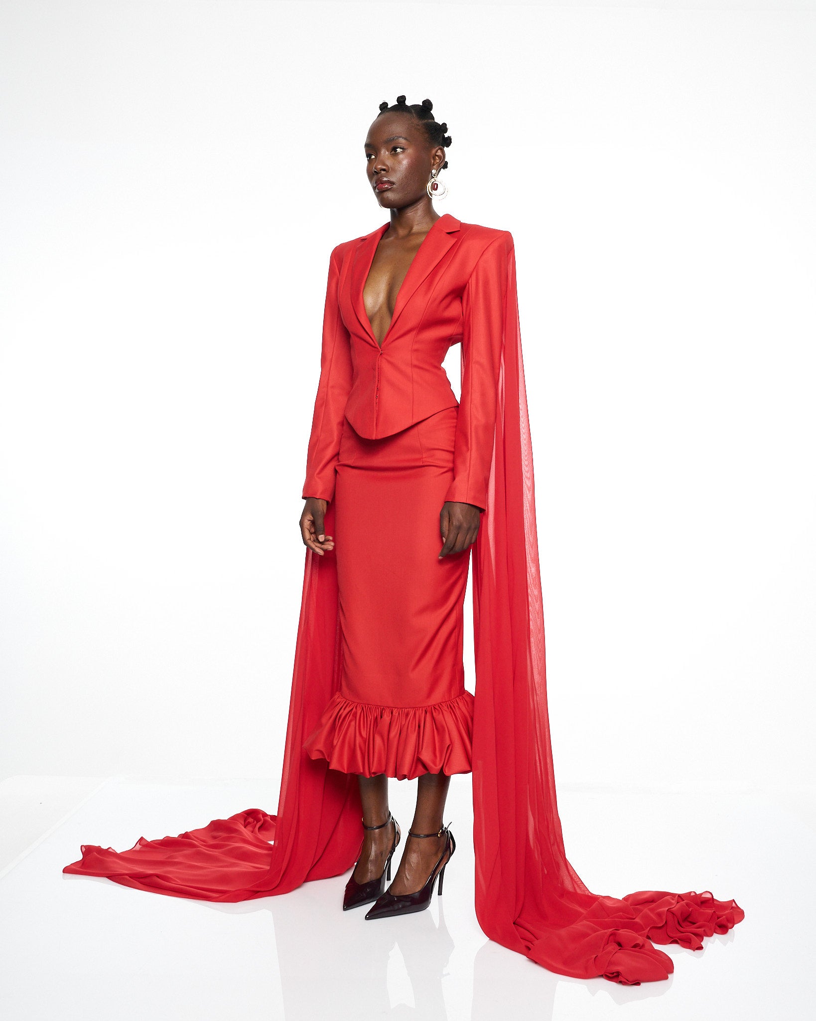 **/Description/*} The RICH MNISI Prayer Blazer is constructed in a wool suiting that nips in at the waist to accentuate an hour-glass form and is curtained by a chiffon cape that extends from the shoulders and sleeves and hangs loosely to the ground.