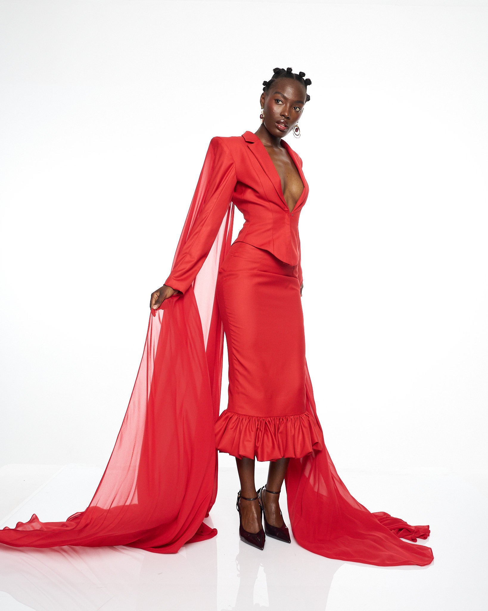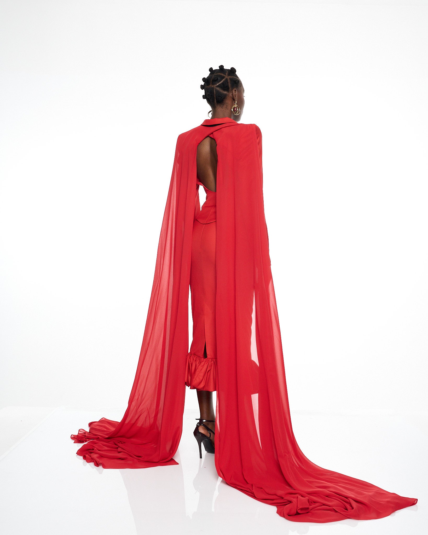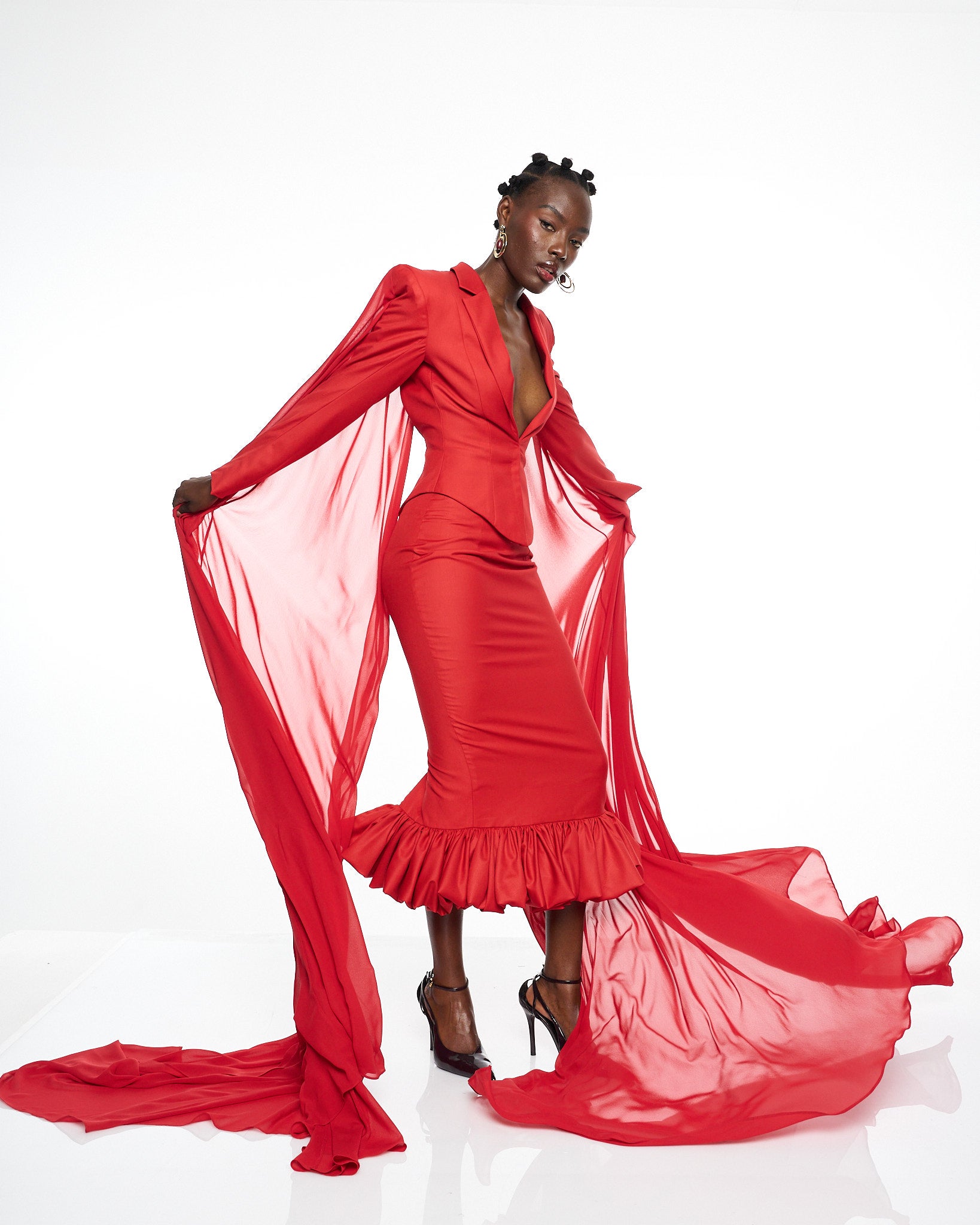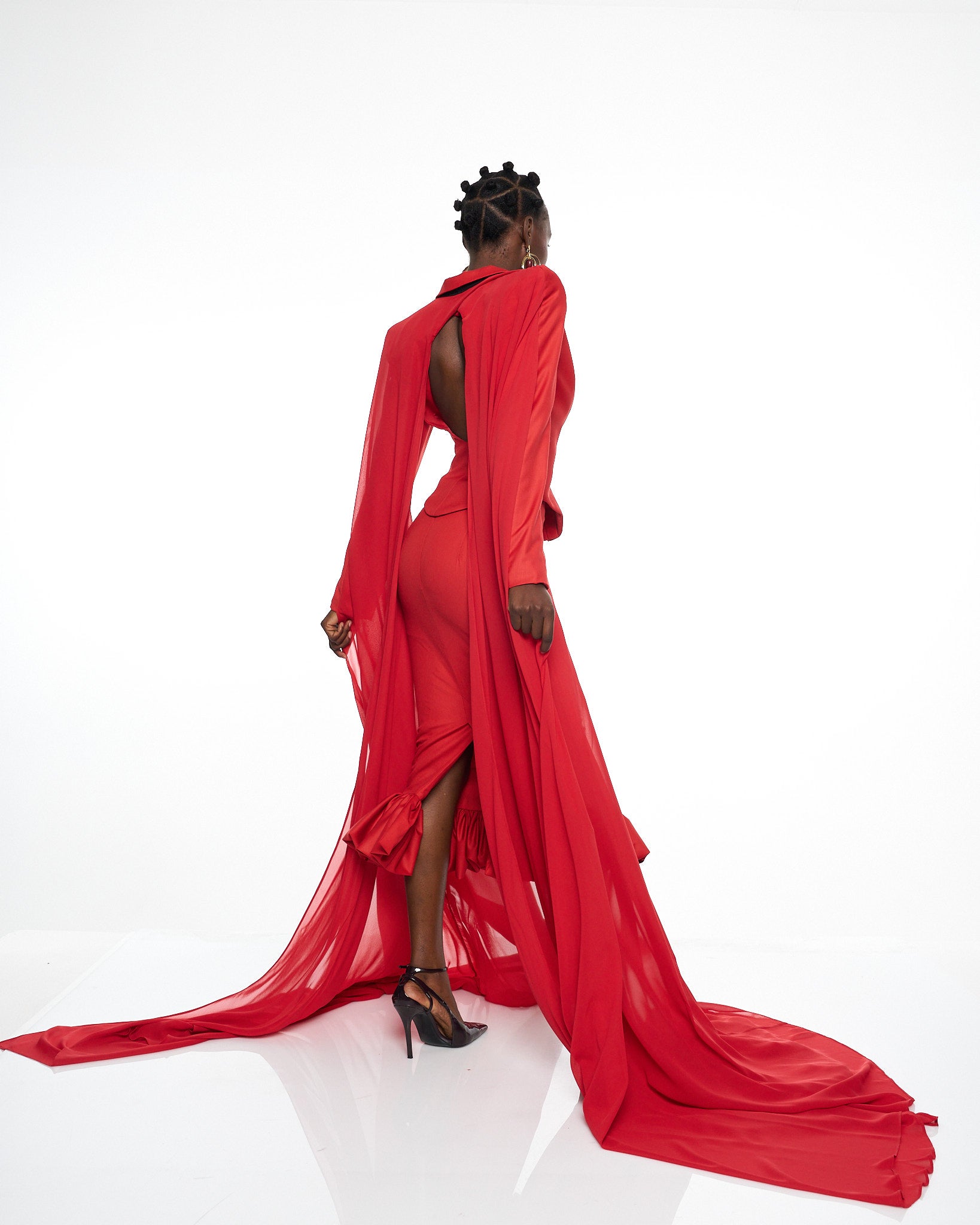 **/Description/*} The RICH MNISI Prayer Blazer is constructed in a wool suiting that nips in at the waist to accentuate an hour-glass form and is curtained by a chiffon cape that extends from the shoulders and sleeves and hangs loosely to the ground.