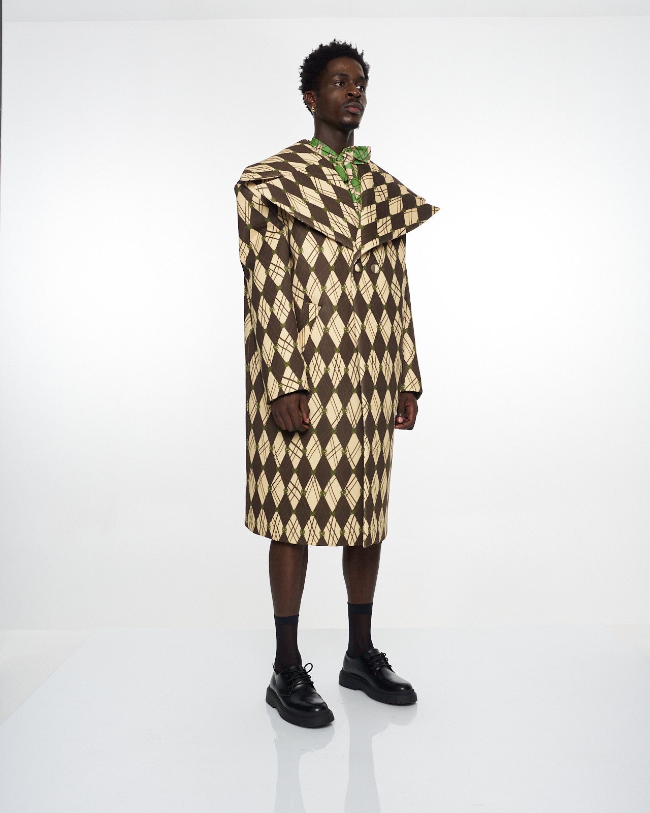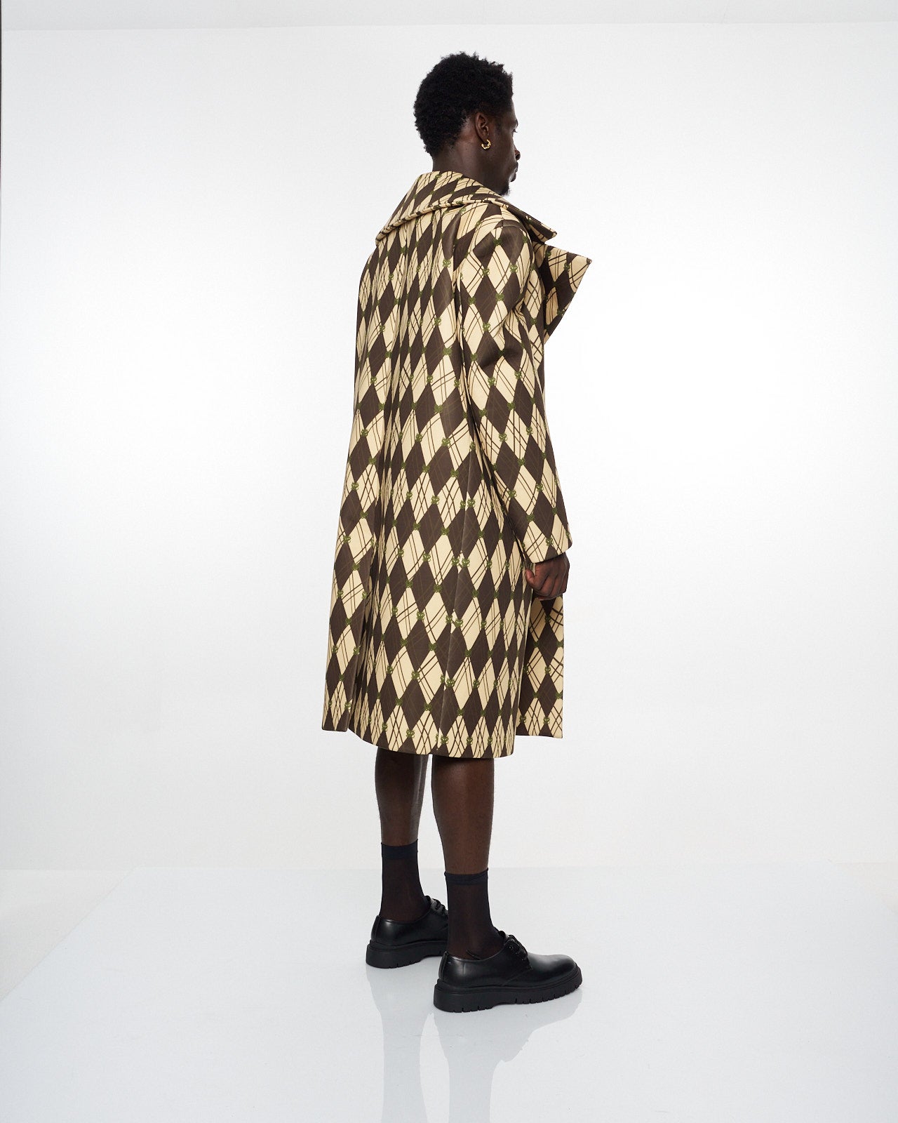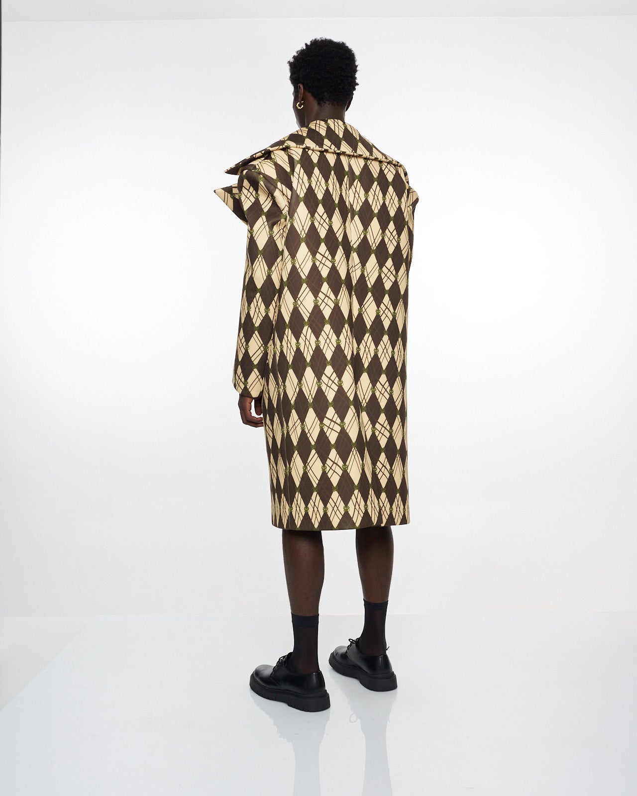 **/Description/*} The RICH MNISI double breasted oversized mid length Mocha Argyle Coat features an exaggerated collar and side pockets.