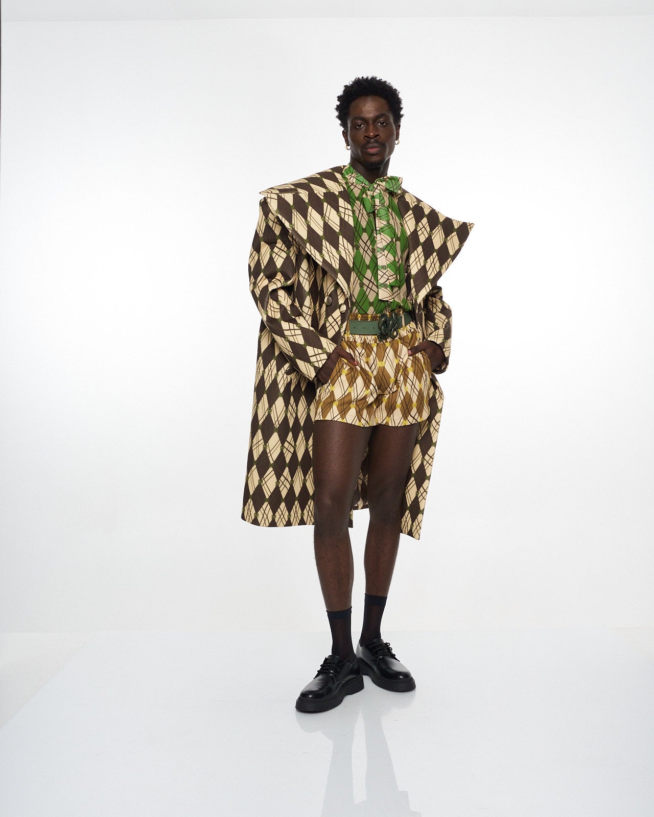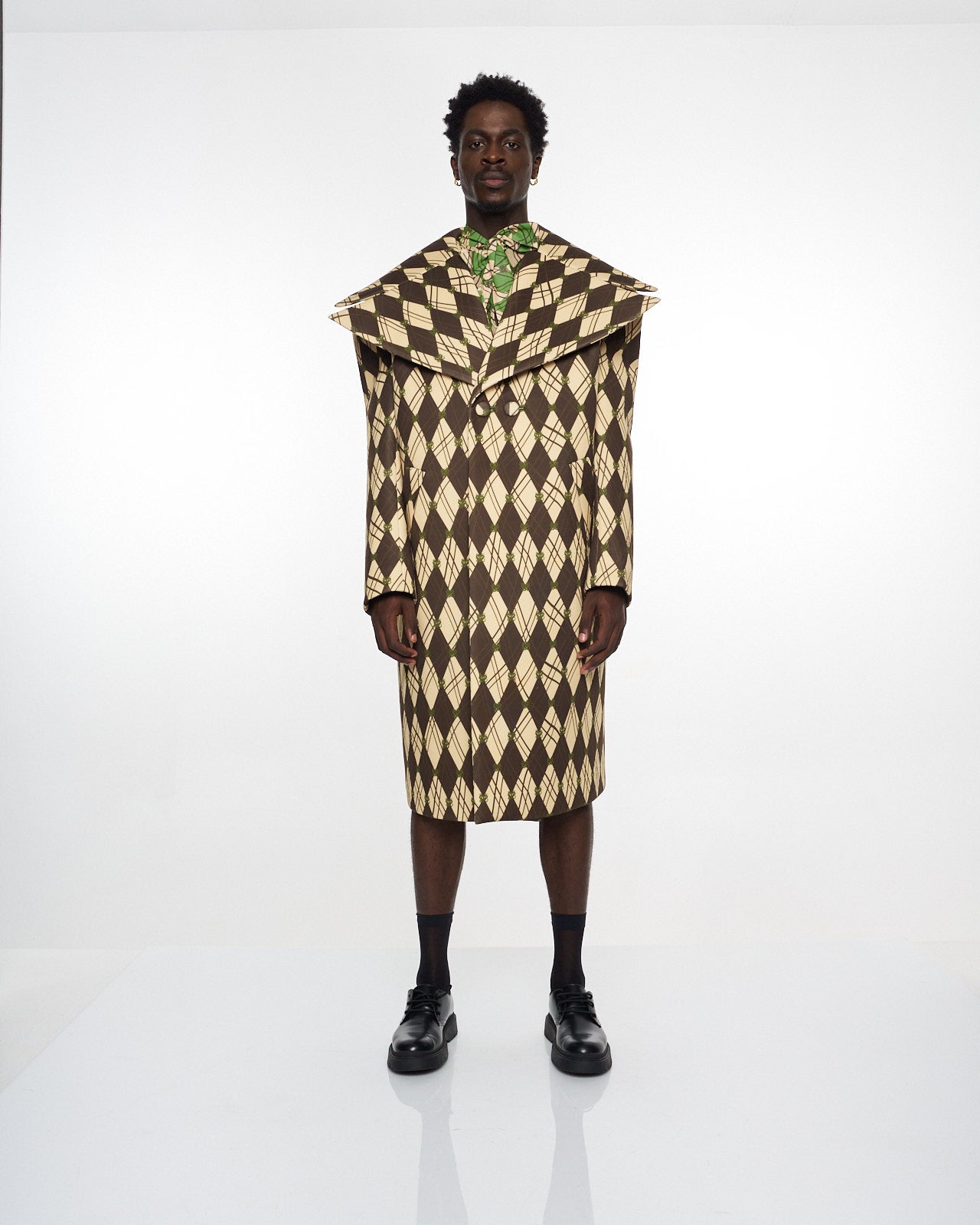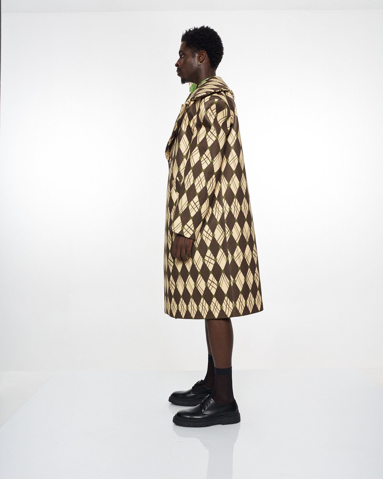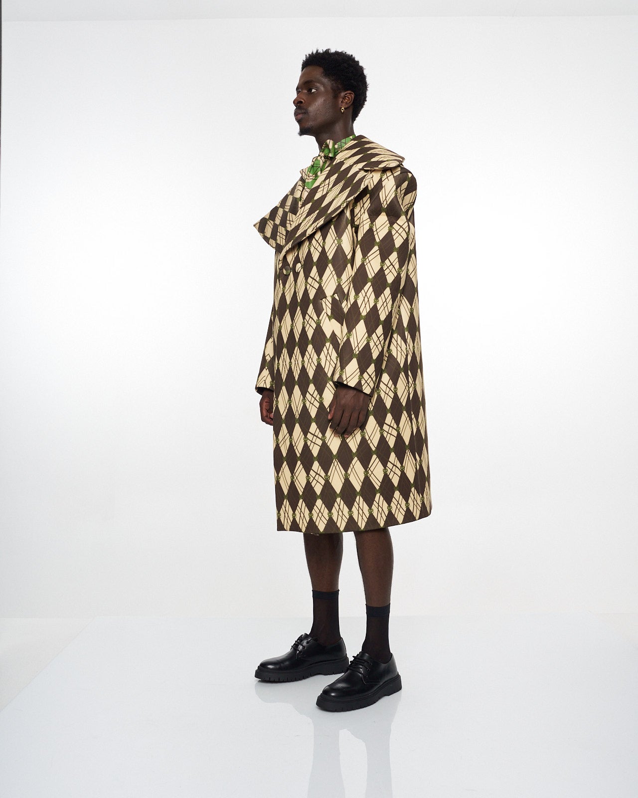 **/Description/*} The RICH MNISI double breasted oversized mid length Mocha Argyle Coat features an exaggerated collar and side pockets.