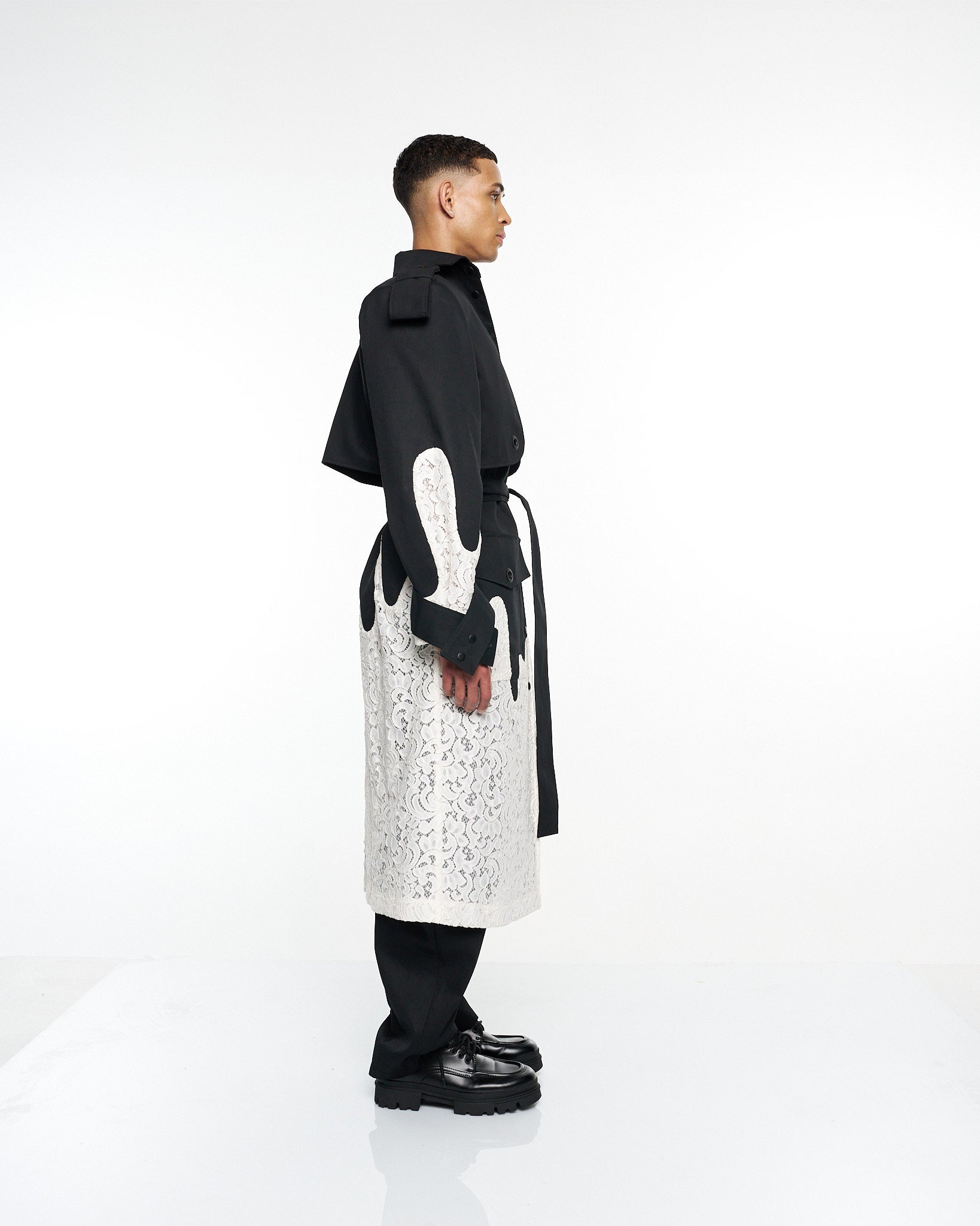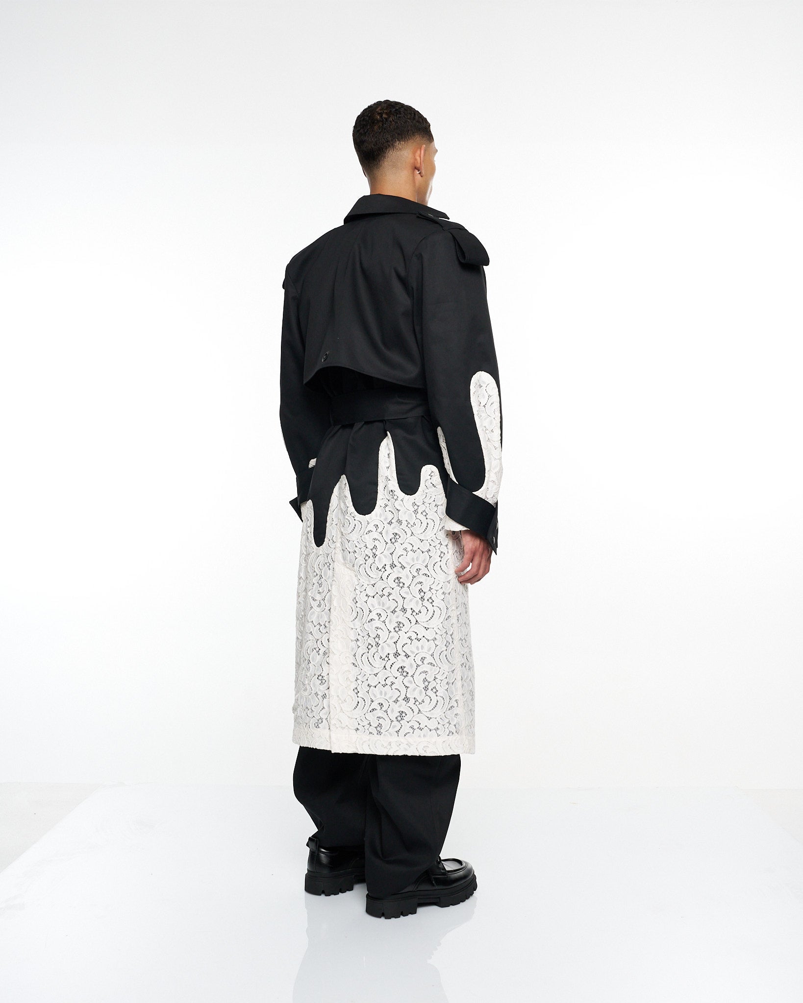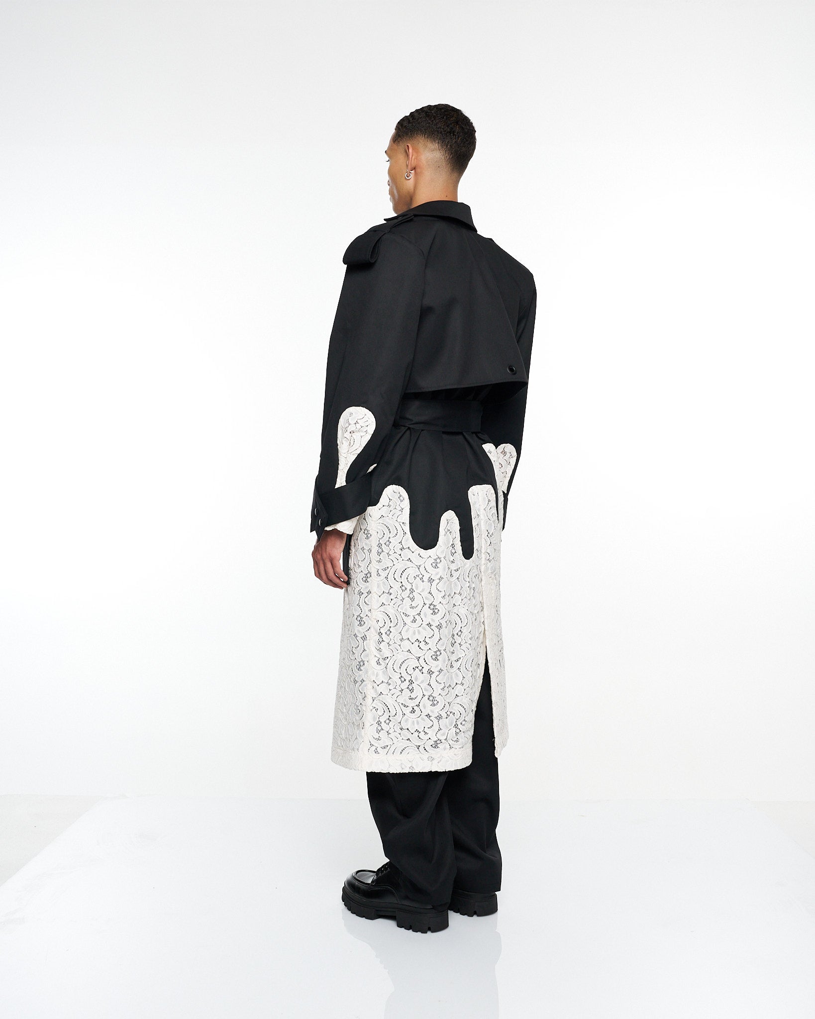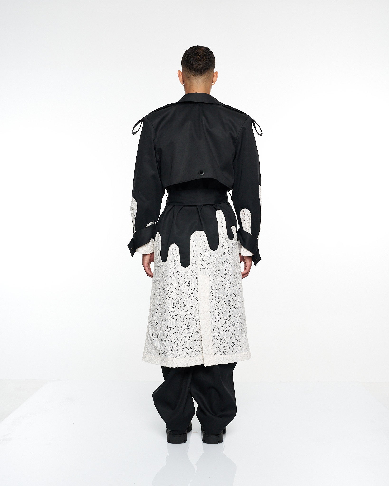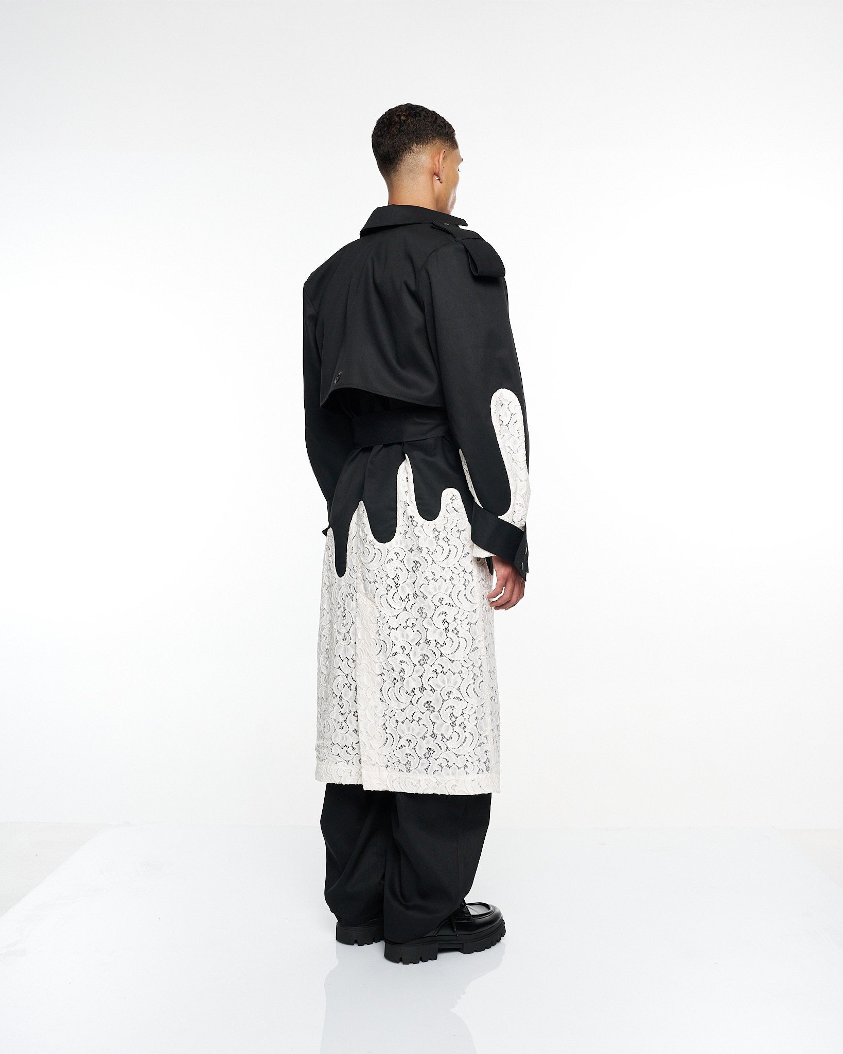 **/Description/*} The RICH MNISI Oreo Trench Coat is crafted from structured cotton & delicate lace, featuring a striking drip-effect overlay, epaulet shoulder details, and a belted waist. Its contrast of sharp tailoring and soft textures creates a bold, sculptural silhouette.