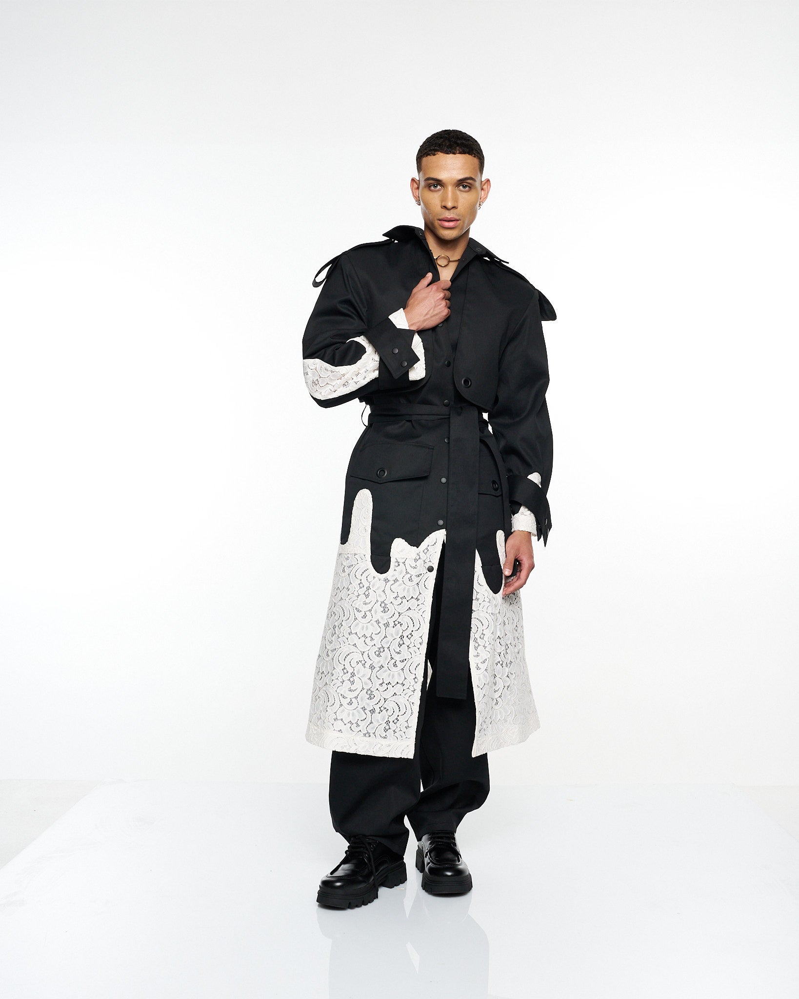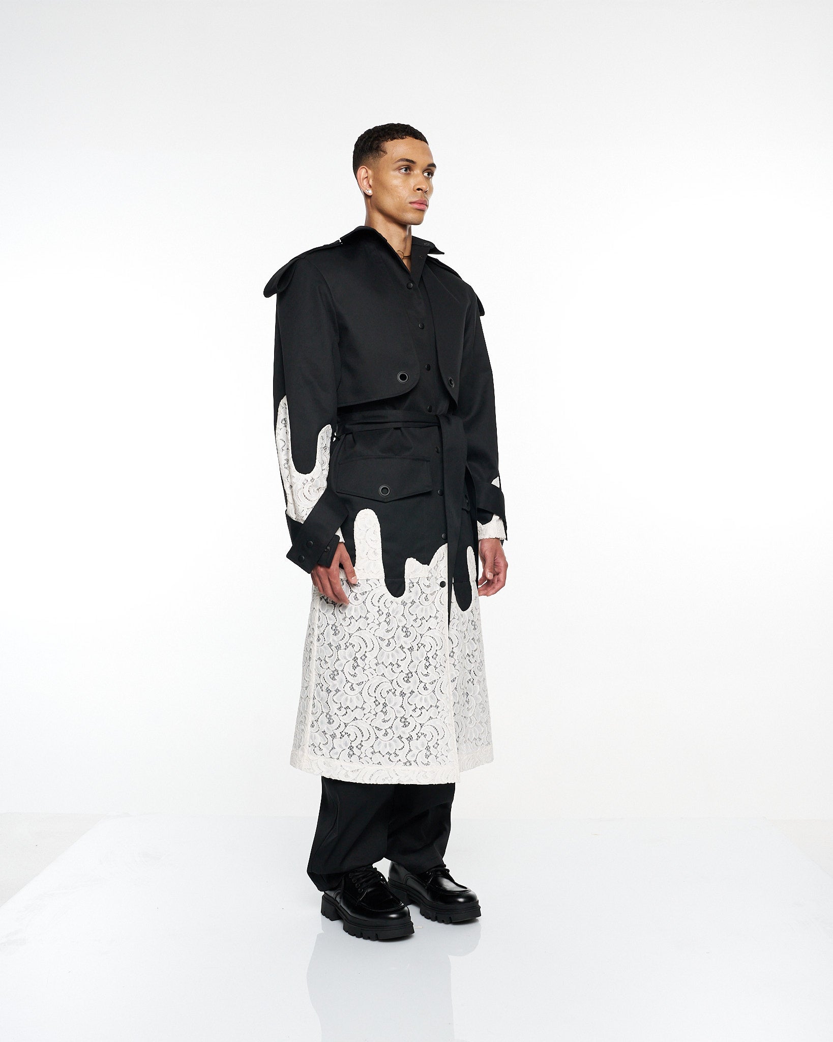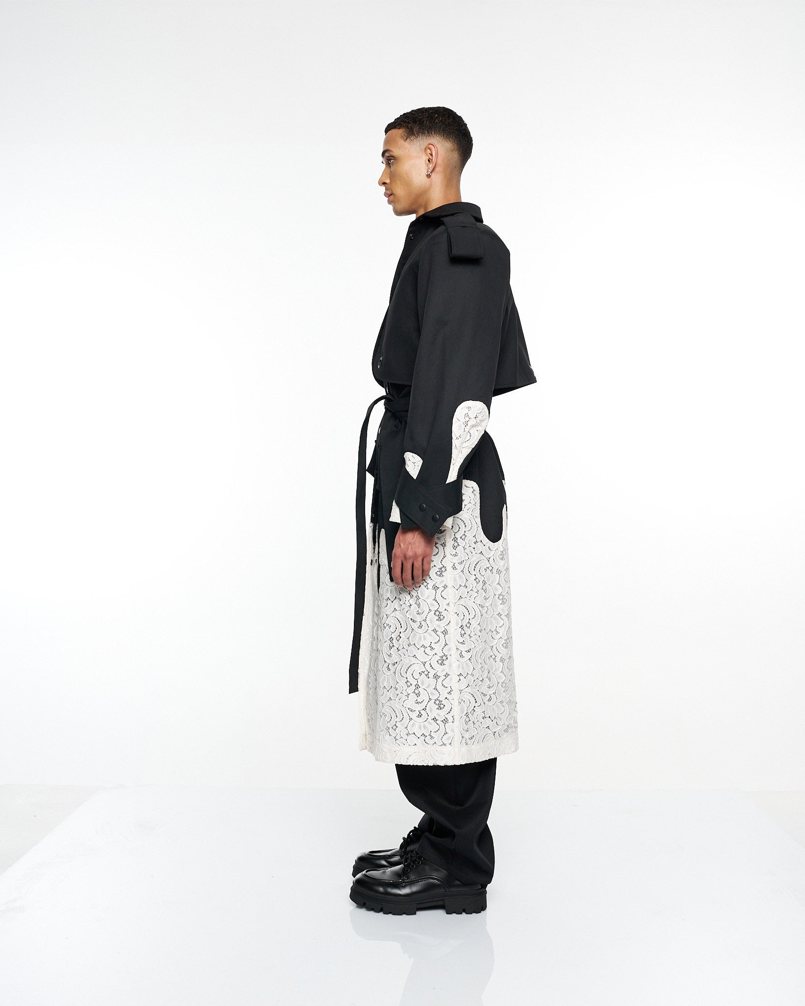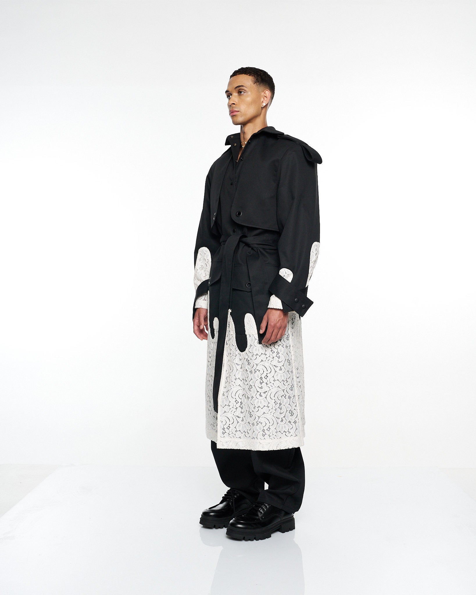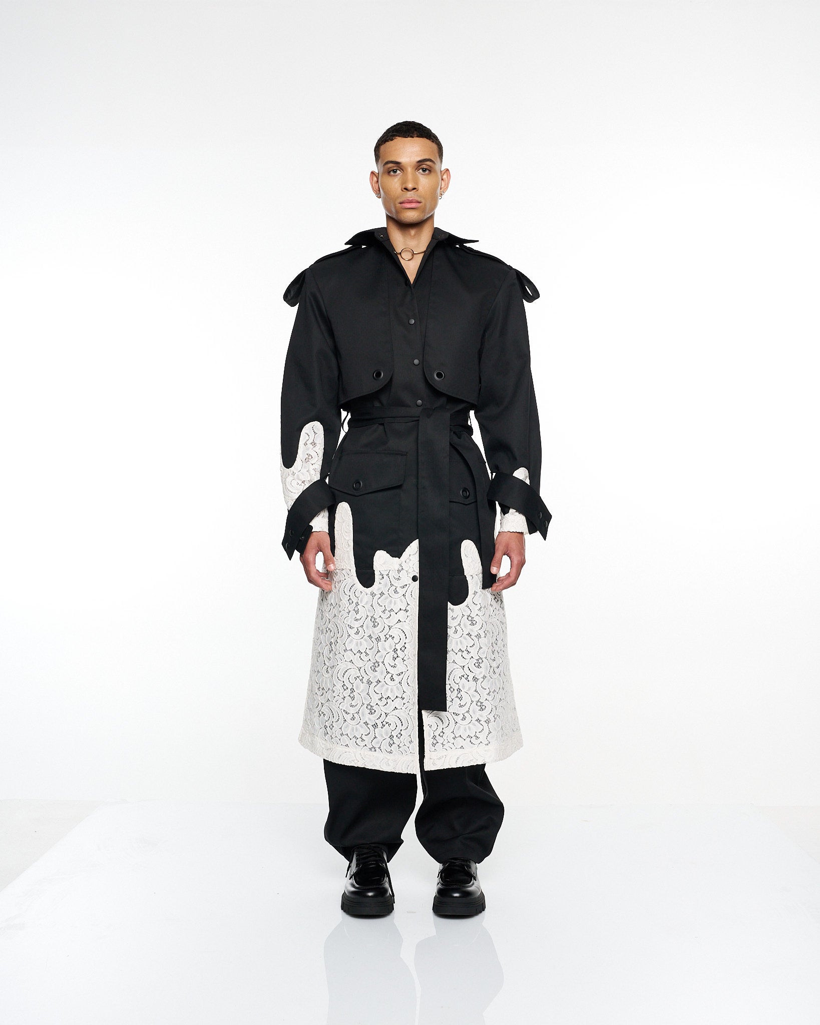 **/Description/*} The RICH MNISI Oreo Trench Coat is crafted from structured cotton & delicate lace, featuring a striking drip-effect overlay, epaulet shoulder details, and a belted waist. Its contrast of sharp tailoring and soft textures creates a bold, sculptural silhouette.