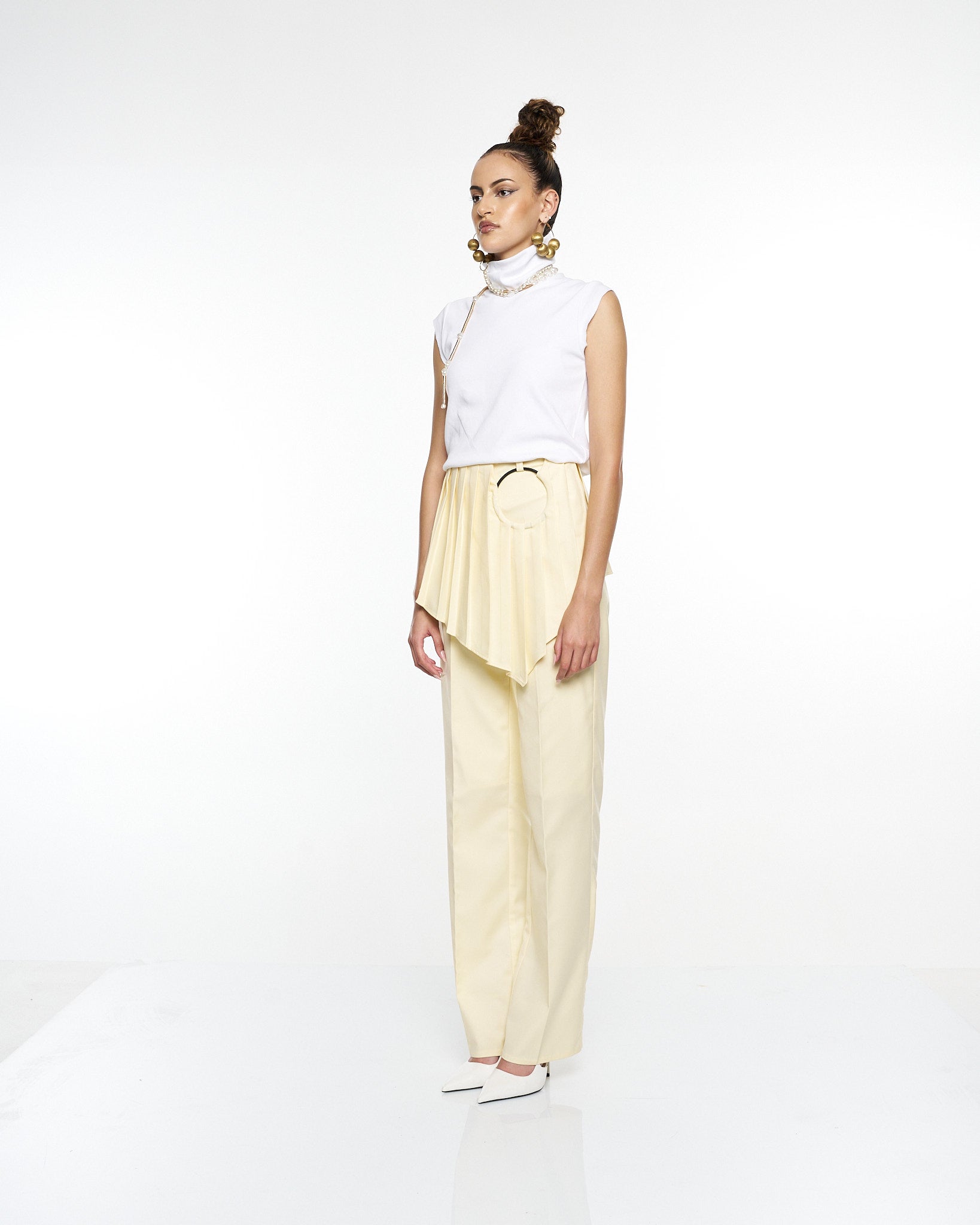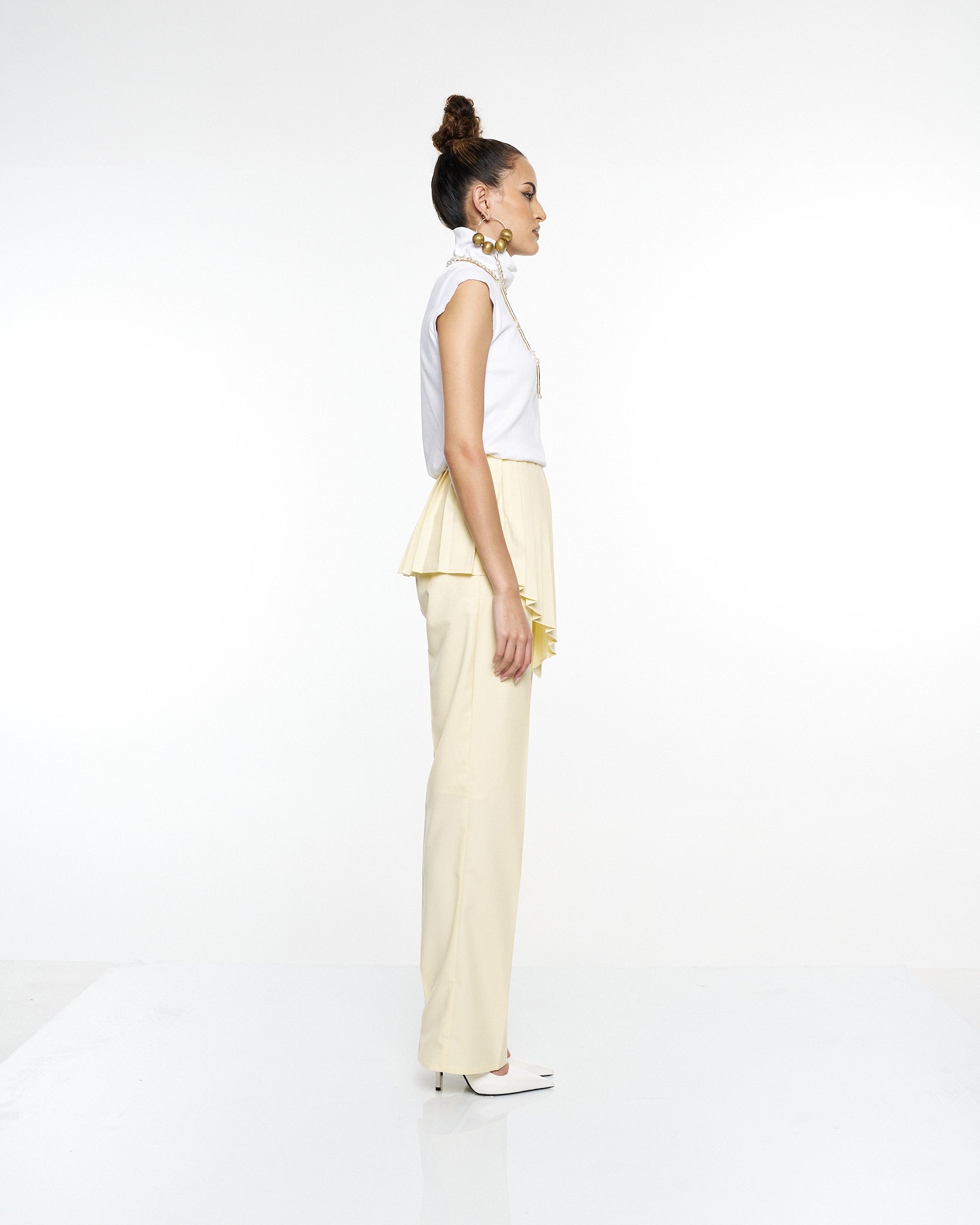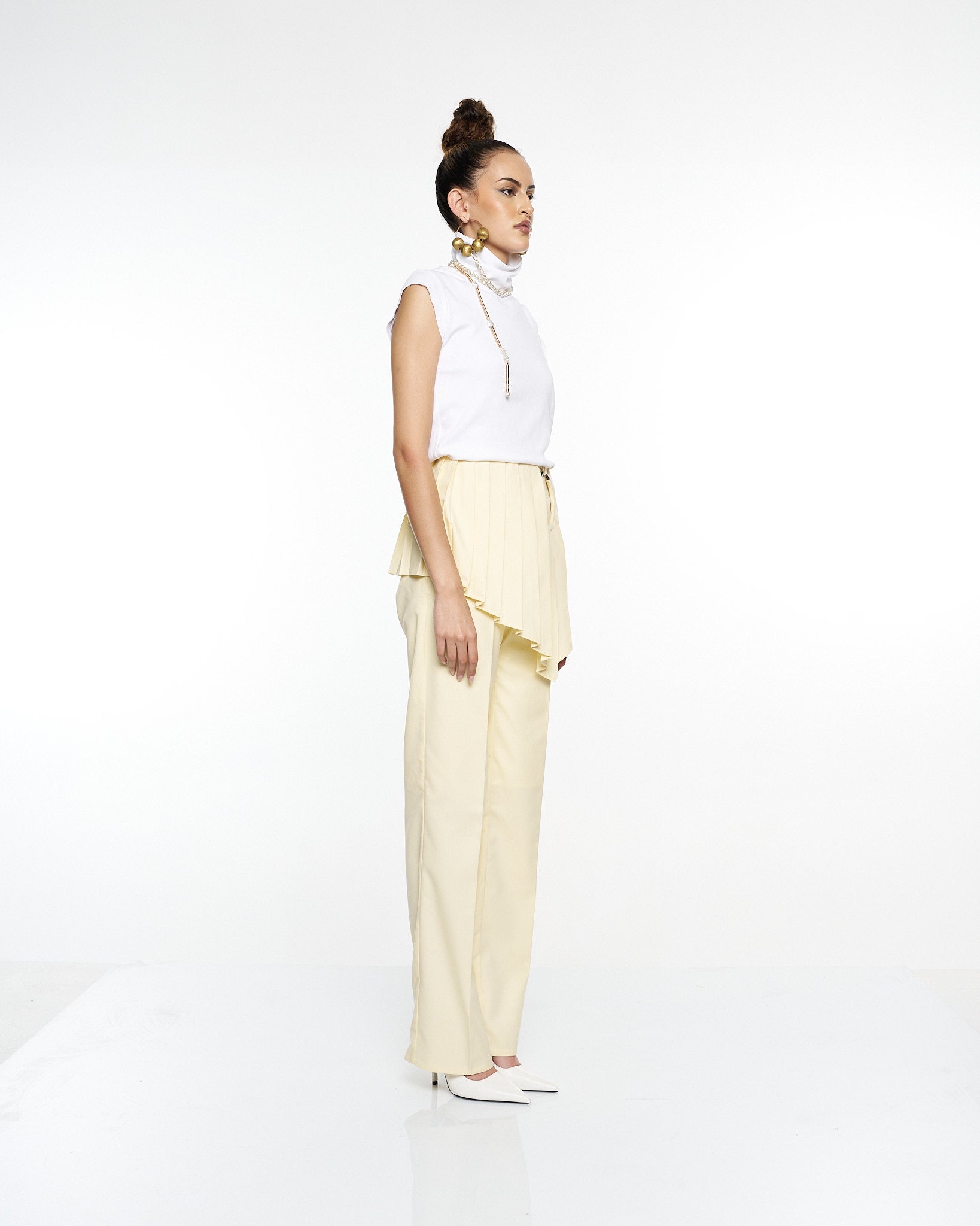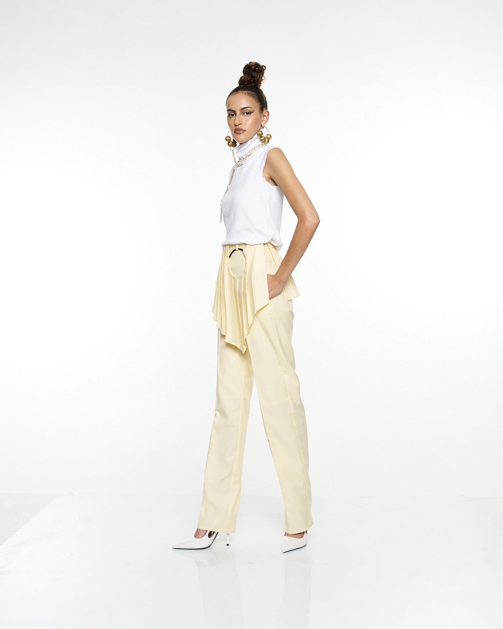 **/Description/*} The RICH MNISI Asymmetrical Layered Trousers are tailored from soft suiting fabric, featuring a high waist, straight-leg cut, and a cascading pleated panel draped from the waistline. Designed in a soft butter hue, these trousers merge modern tailoring with playful movement.