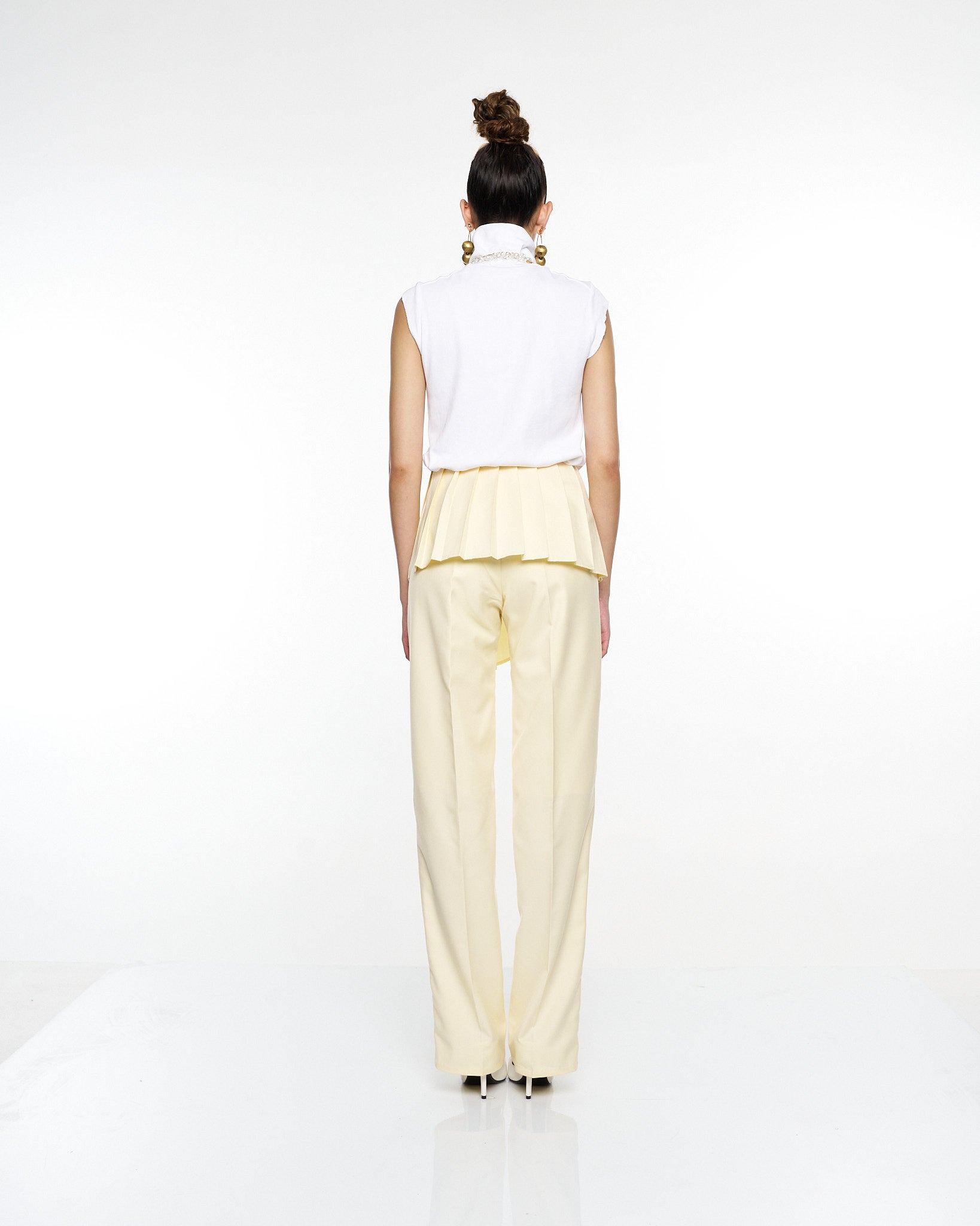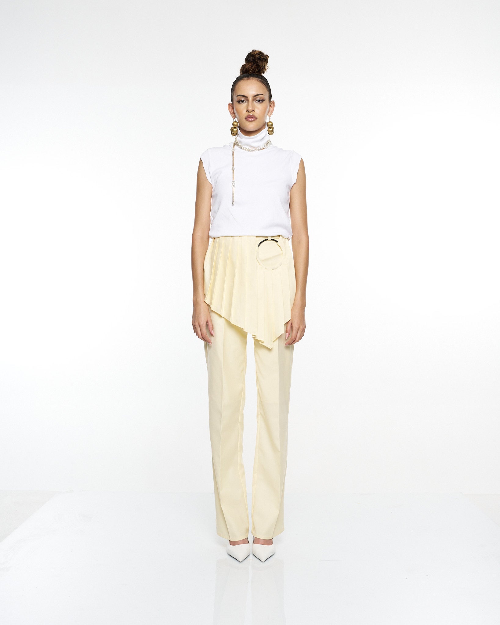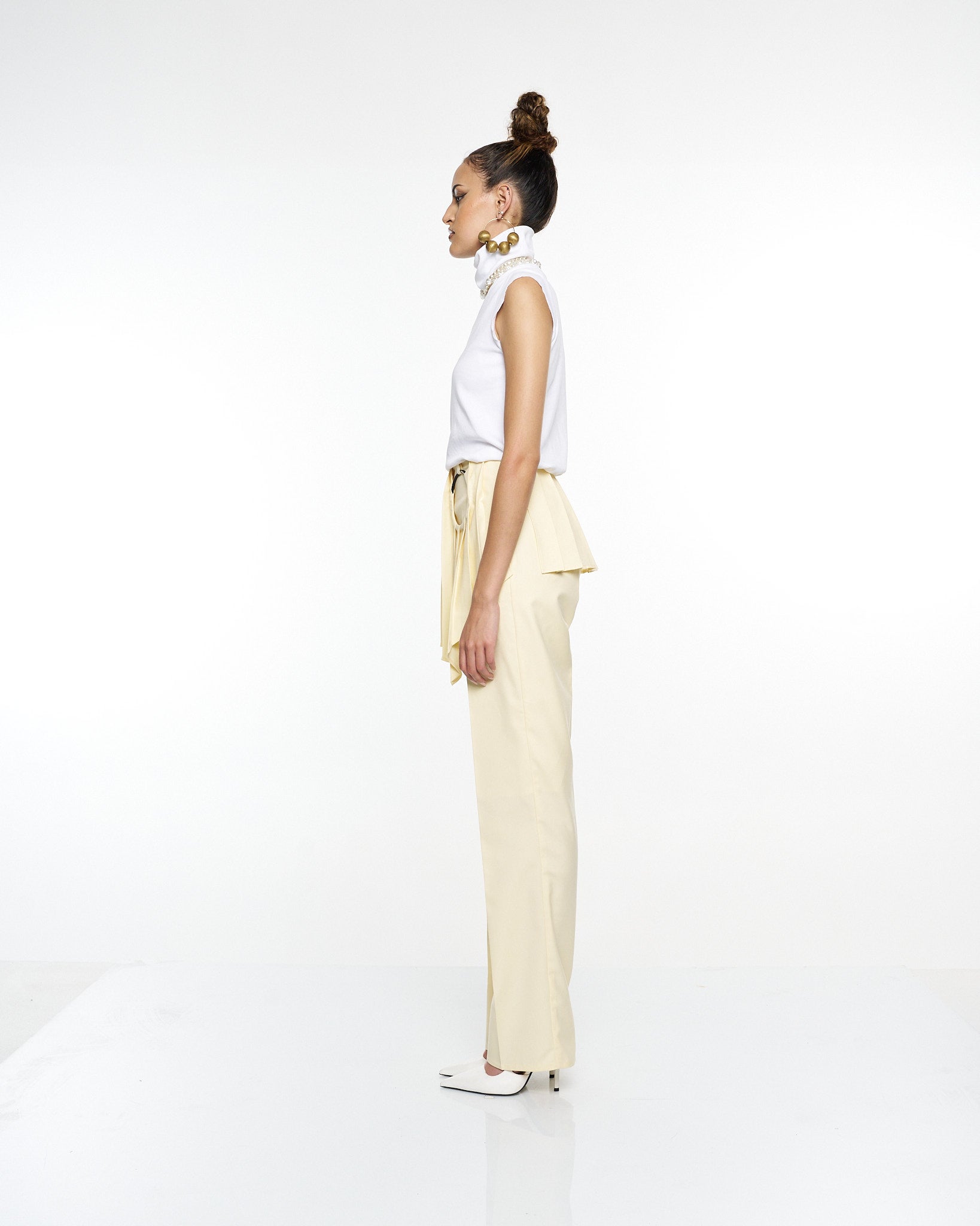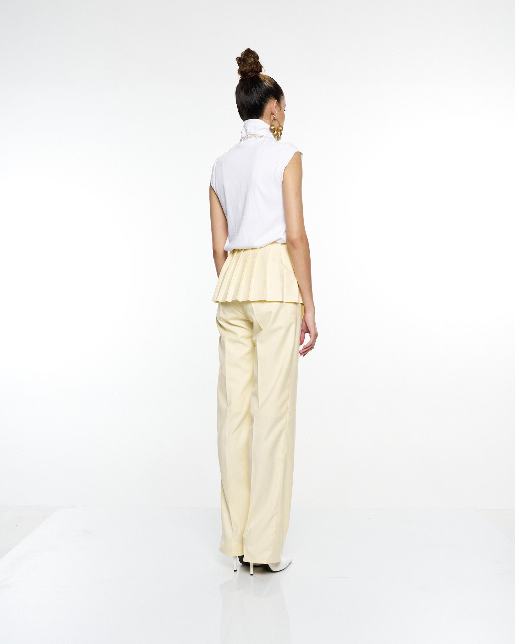 **/Description/*} The RICH MNISI Asymmetrical Layered Trousers are tailored from soft suiting fabric, featuring a high waist, straight-leg cut, and a cascading pleated panel draped from the waistline. Designed in a soft butter hue, these trousers merge modern tailoring with playful movement.