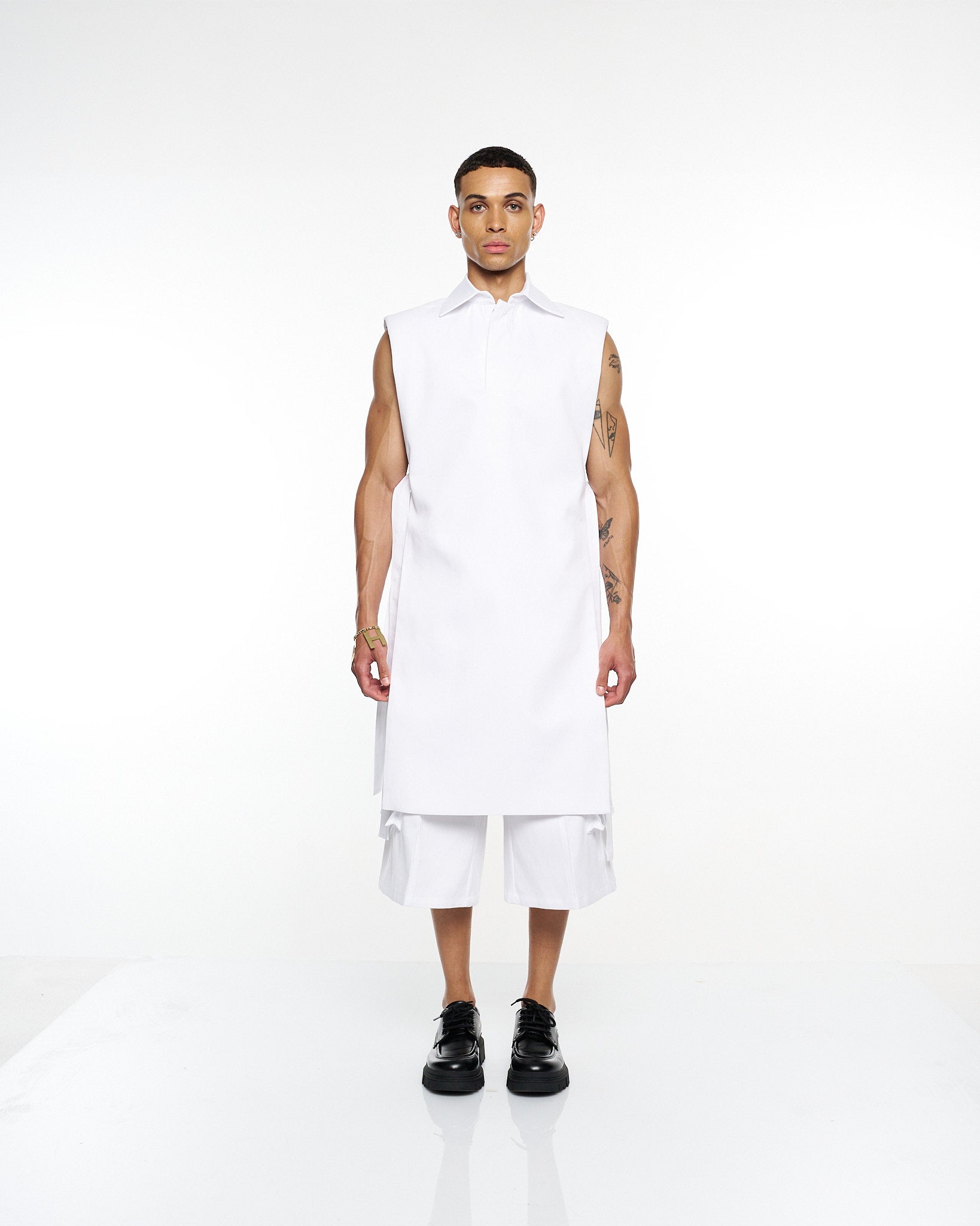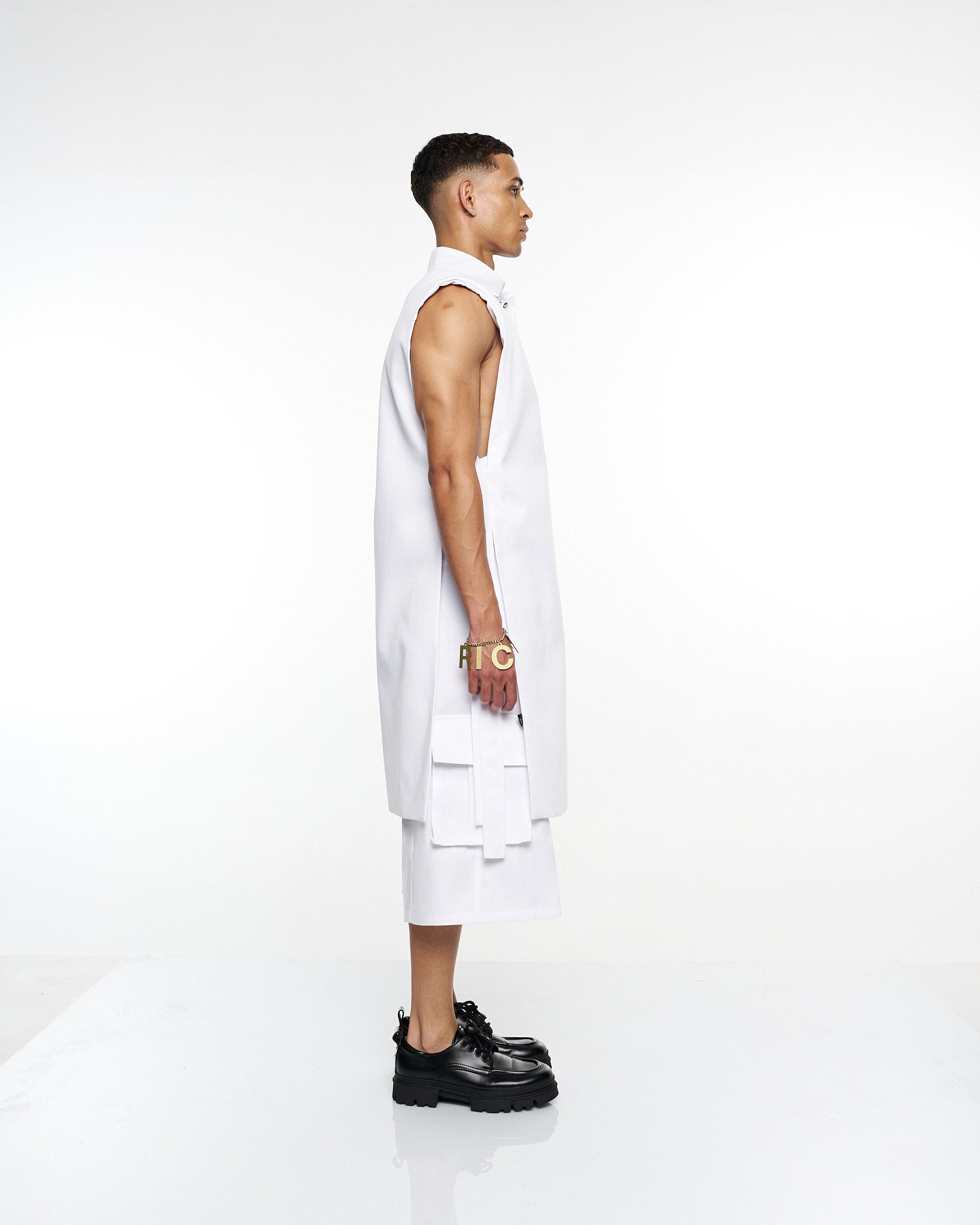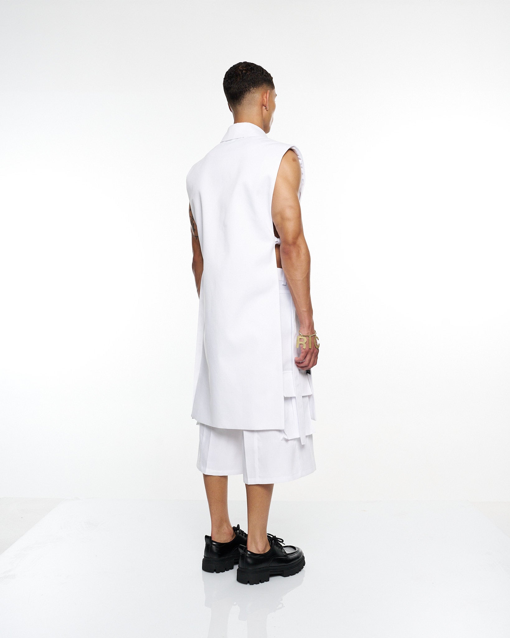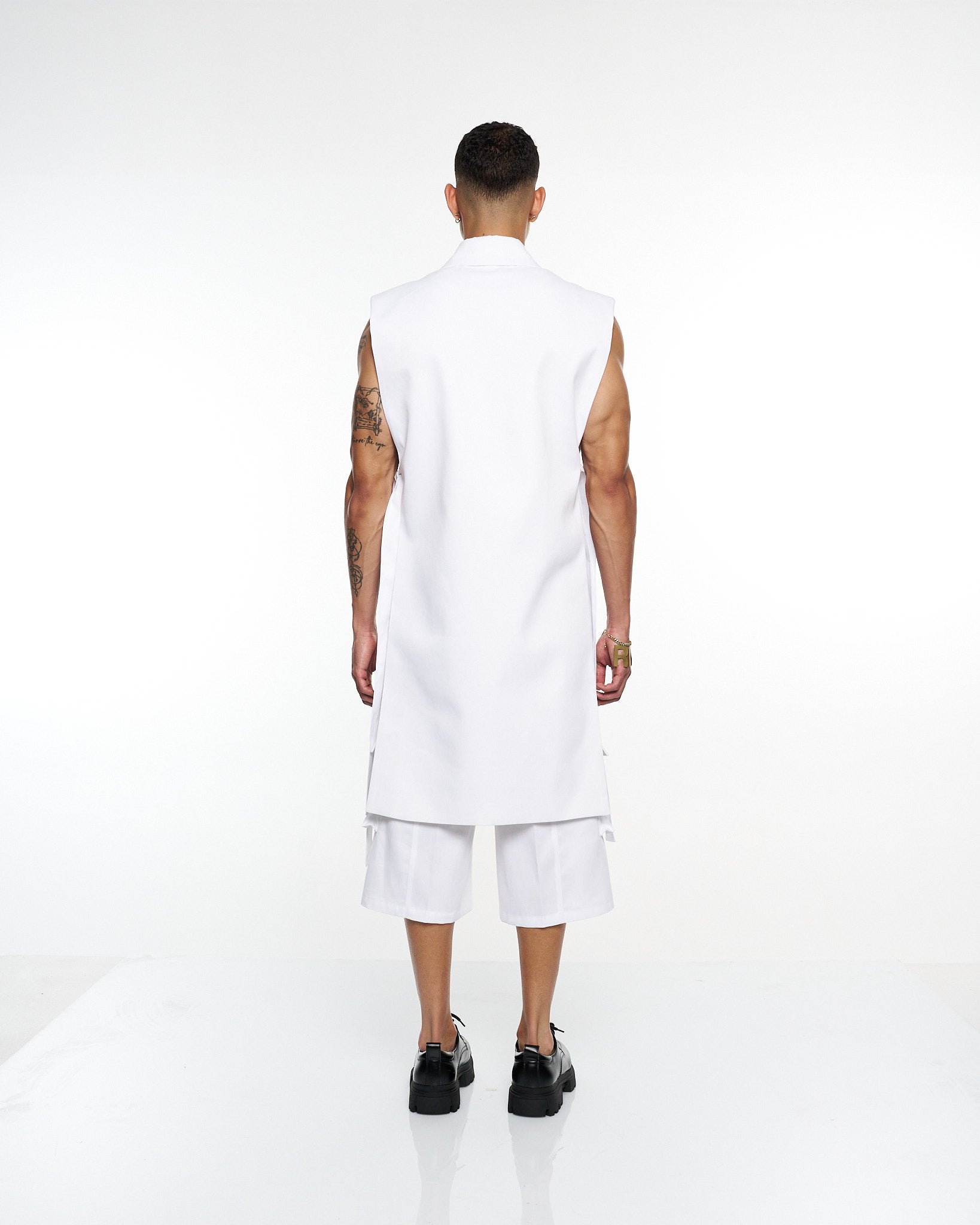 **/Description/*} The RICH MNISI Purity Sleeveless Tunic Jacket is cut from crisp cotton, featuring a sharp collar, clean lines, and an elongated silhouette. A minimalist statement piece that redefines modern tailoring.