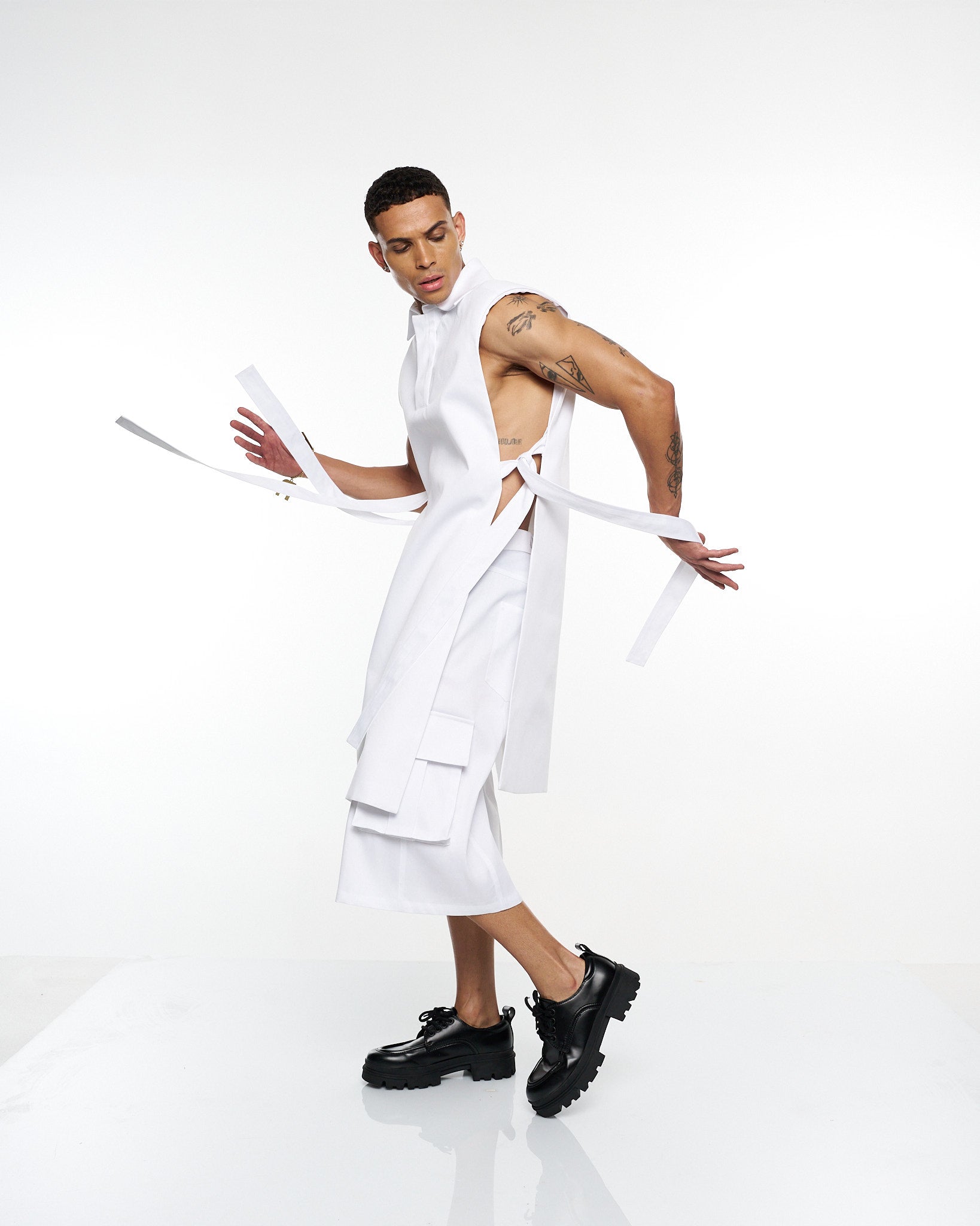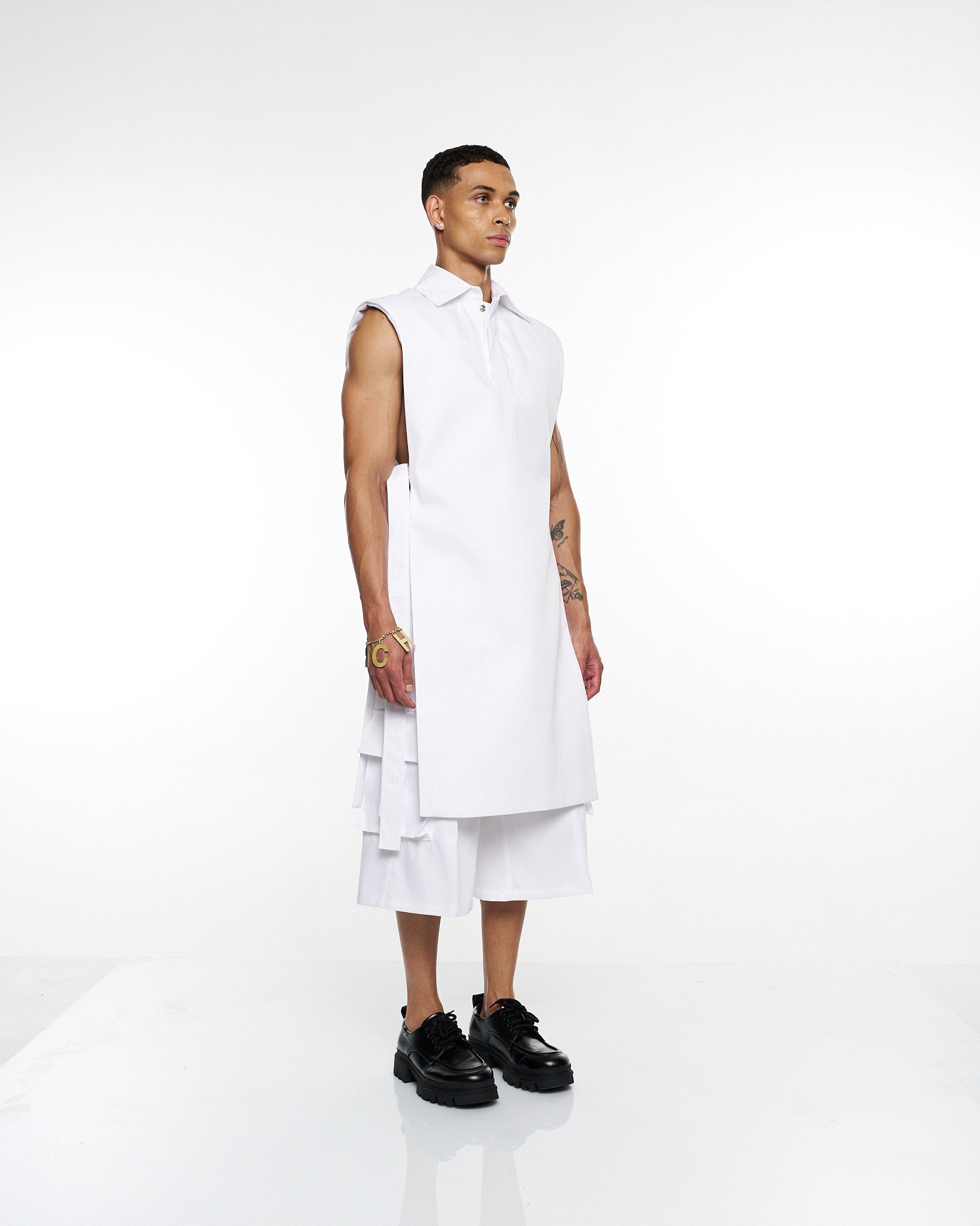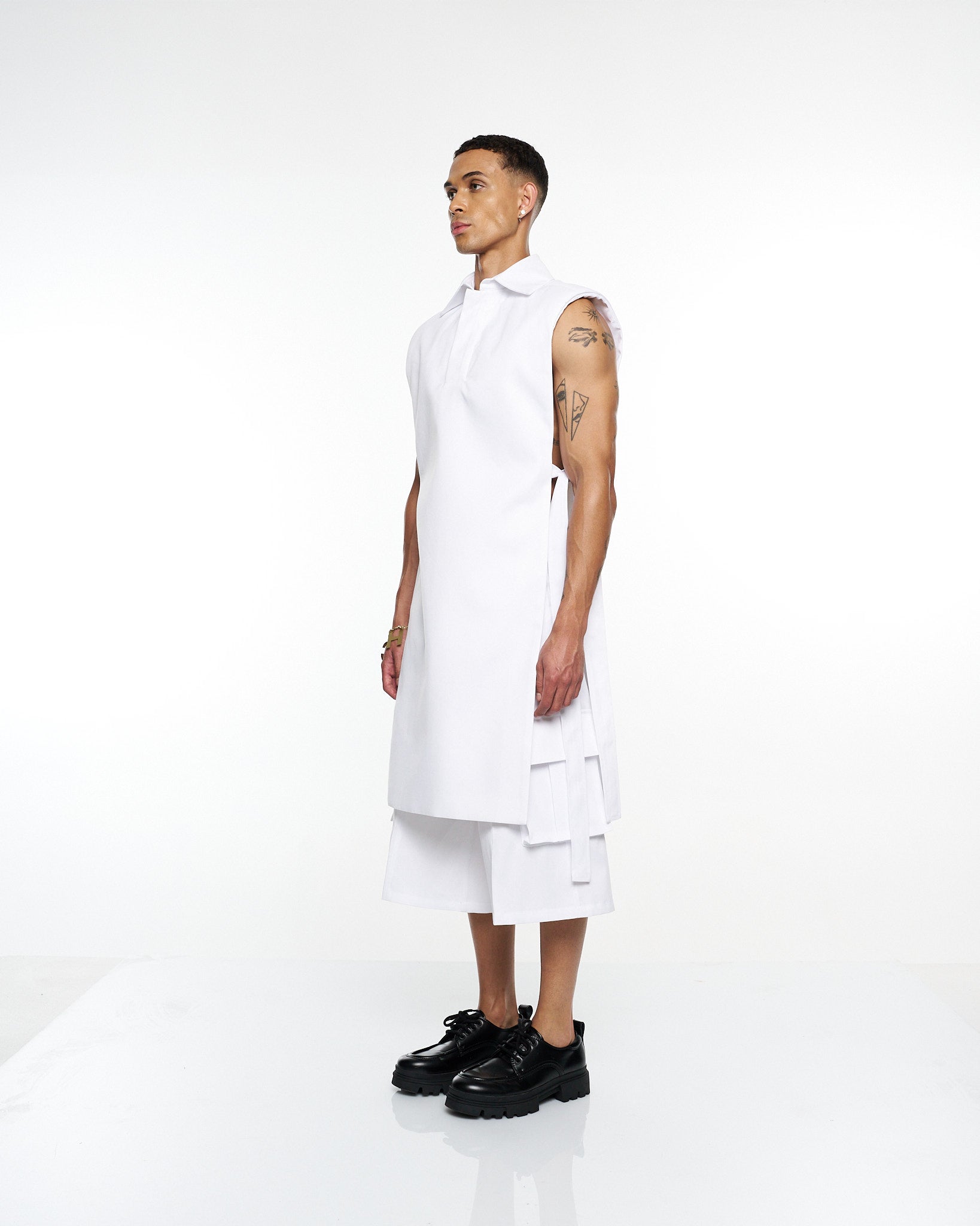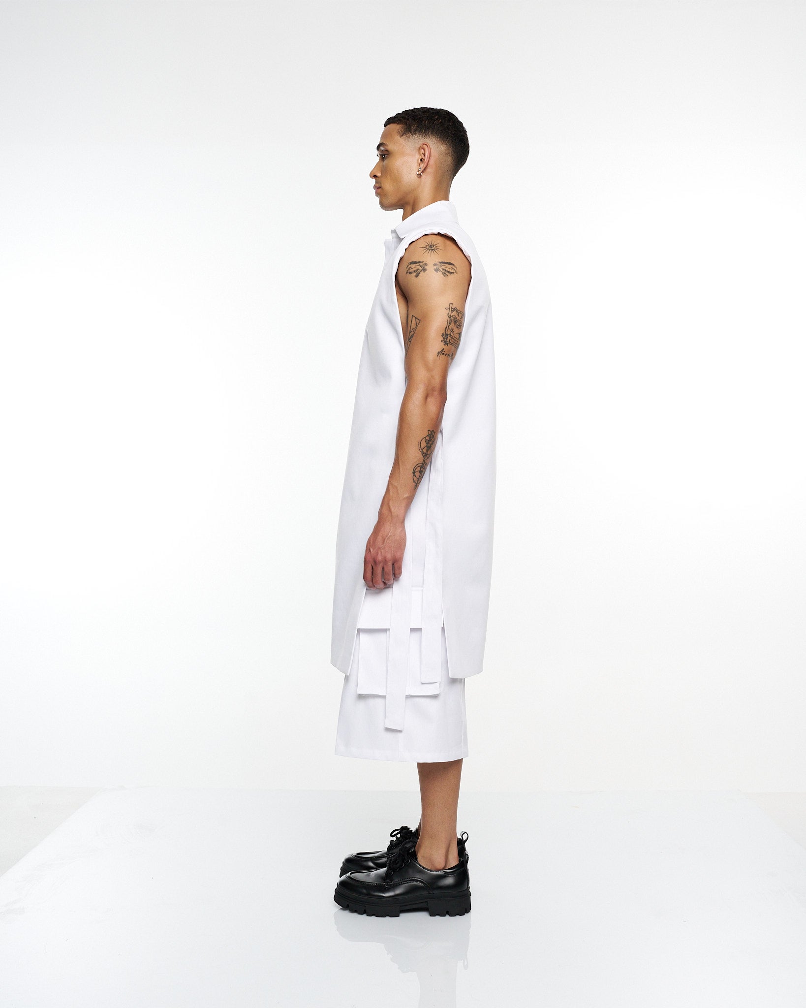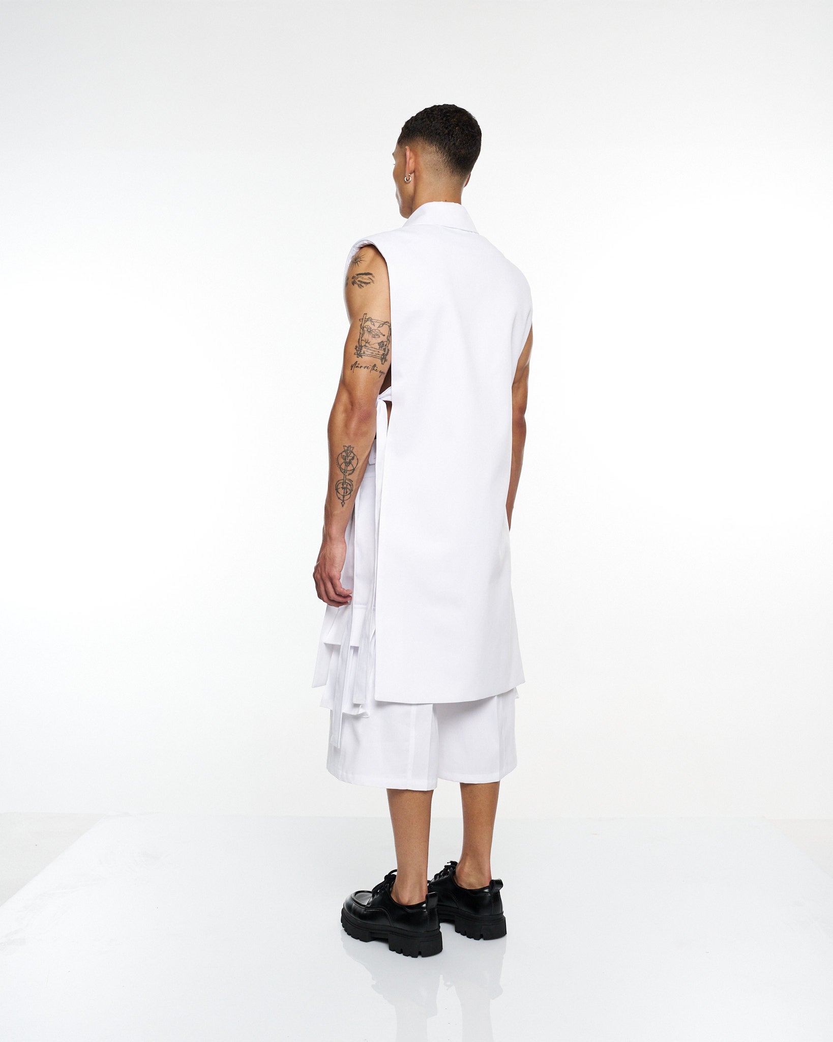 **/Description/*} The RICH MNISI Purity Sleeveless Tunic Jacket is cut from crisp cotton, featuring a sharp collar, clean lines, and an elongated silhouette. A minimalist statement piece that redefines modern tailoring.
