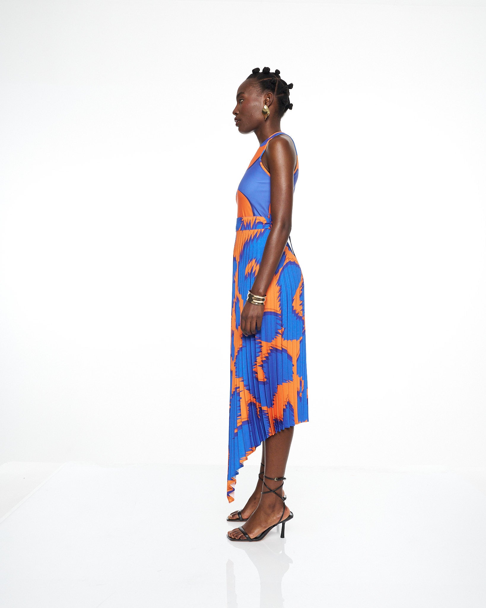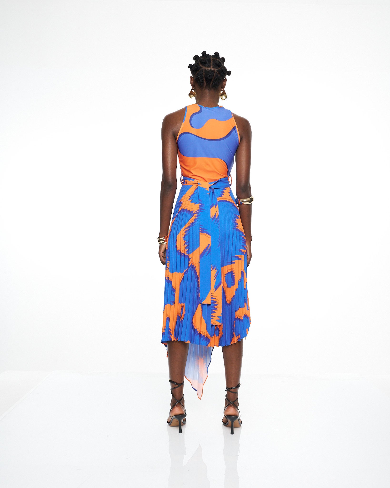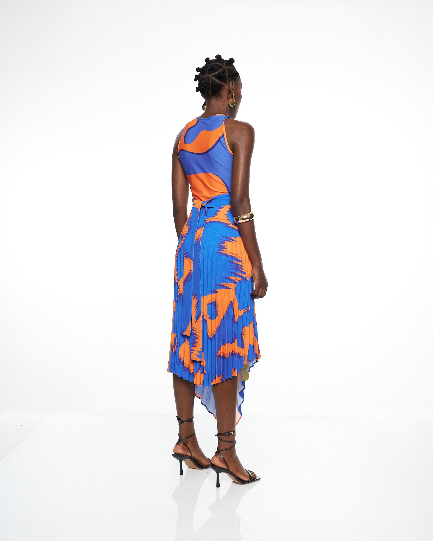 **/Description/*} The RICH MNISI Pleated Scrambled Dress is crafted in a fluid printed lycra that contours the bodice before flowing into a pleated crepe, asymmetrical skirt that moves with sculptural grace. The high neckline and sleeveless cut frame the body with clean modern lines, while the bold wave like print brings rhythm and energy to the elongated silhouette.