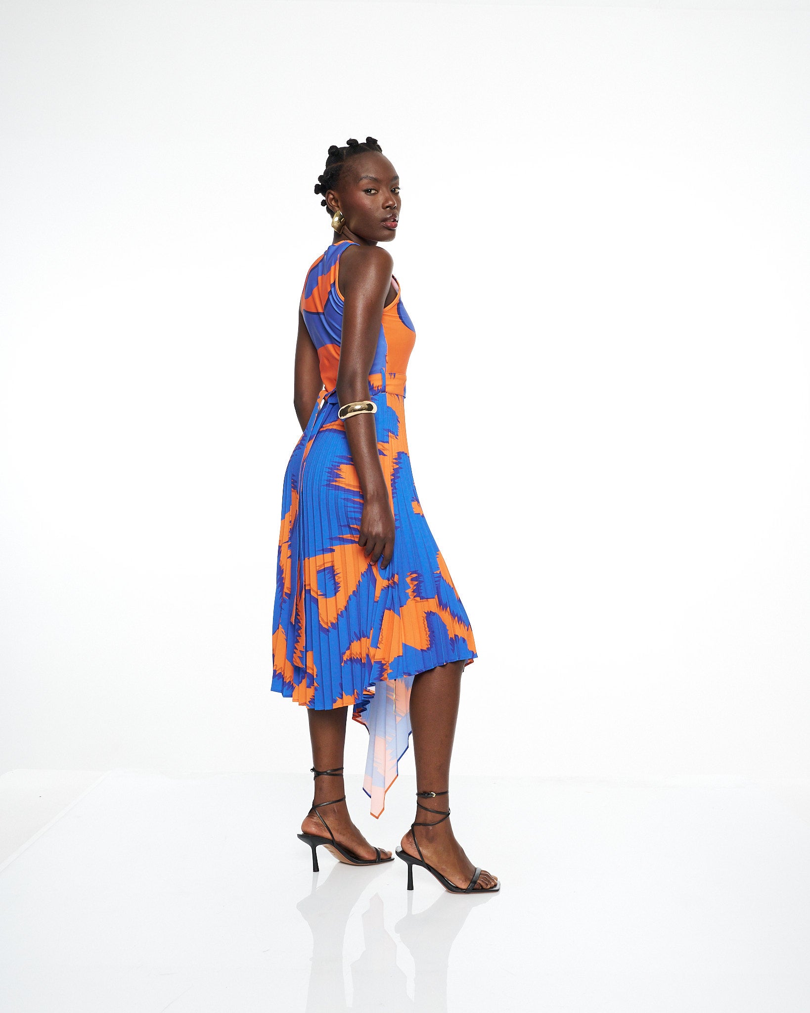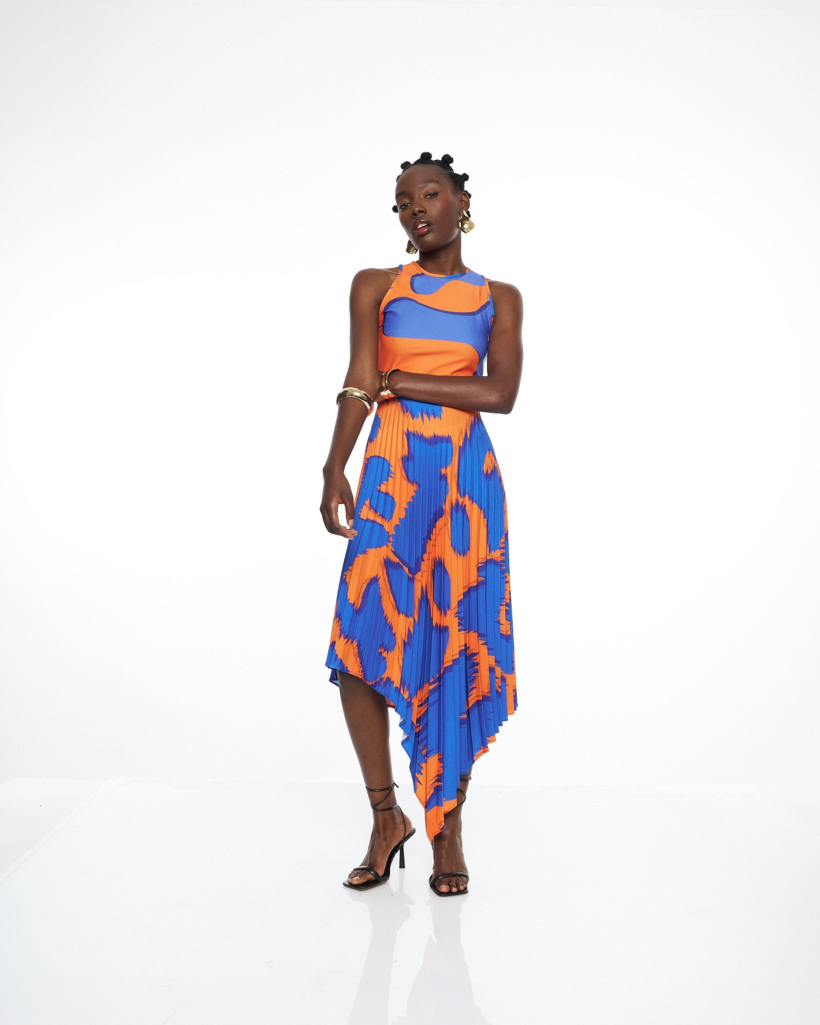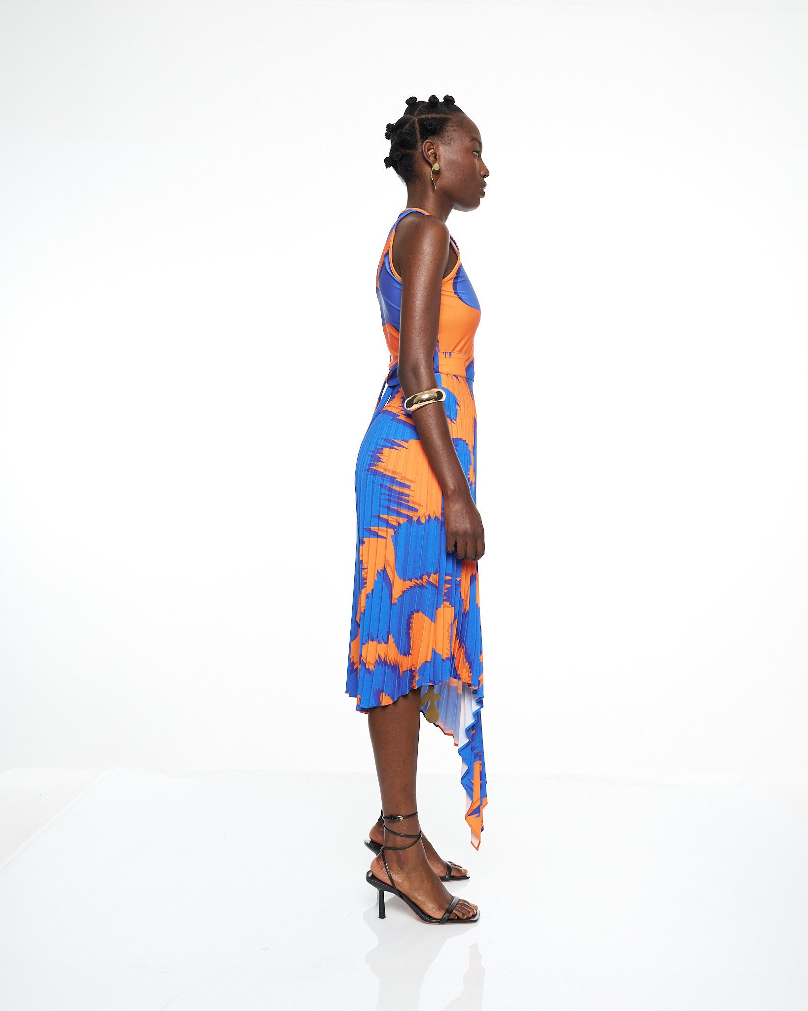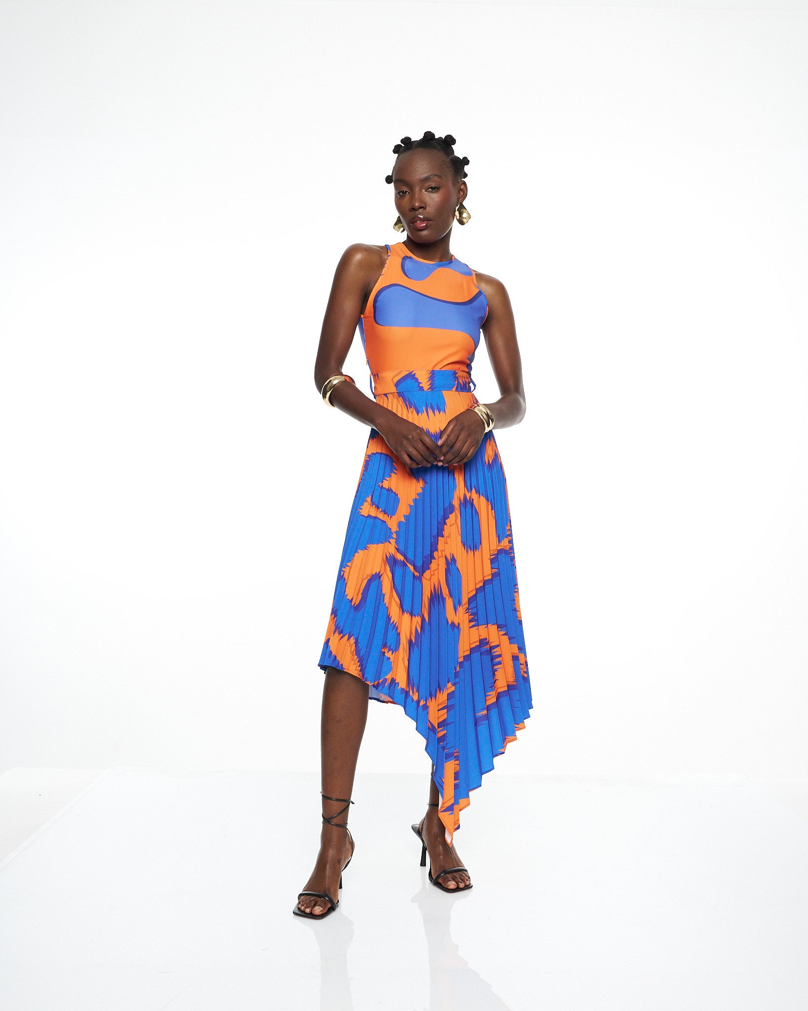 **/Description/*} The RICH MNISI Pleated Scrambled Dress is crafted in a fluid printed lycra that contours the bodice before flowing into a pleated crepe, asymmetrical skirt that moves with sculptural grace. The high neckline and sleeveless cut frame the body with clean modern lines, while the bold wave like print brings rhythm and energy to the elongated silhouette.