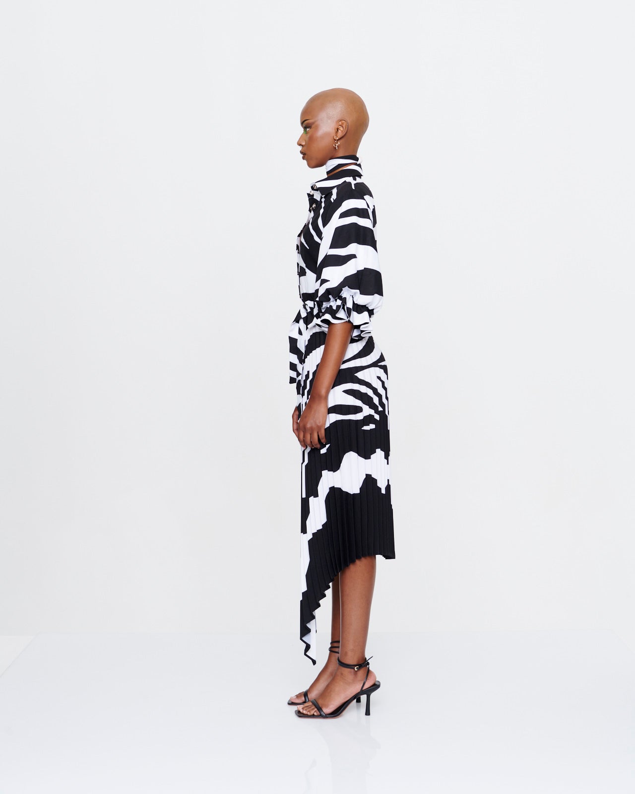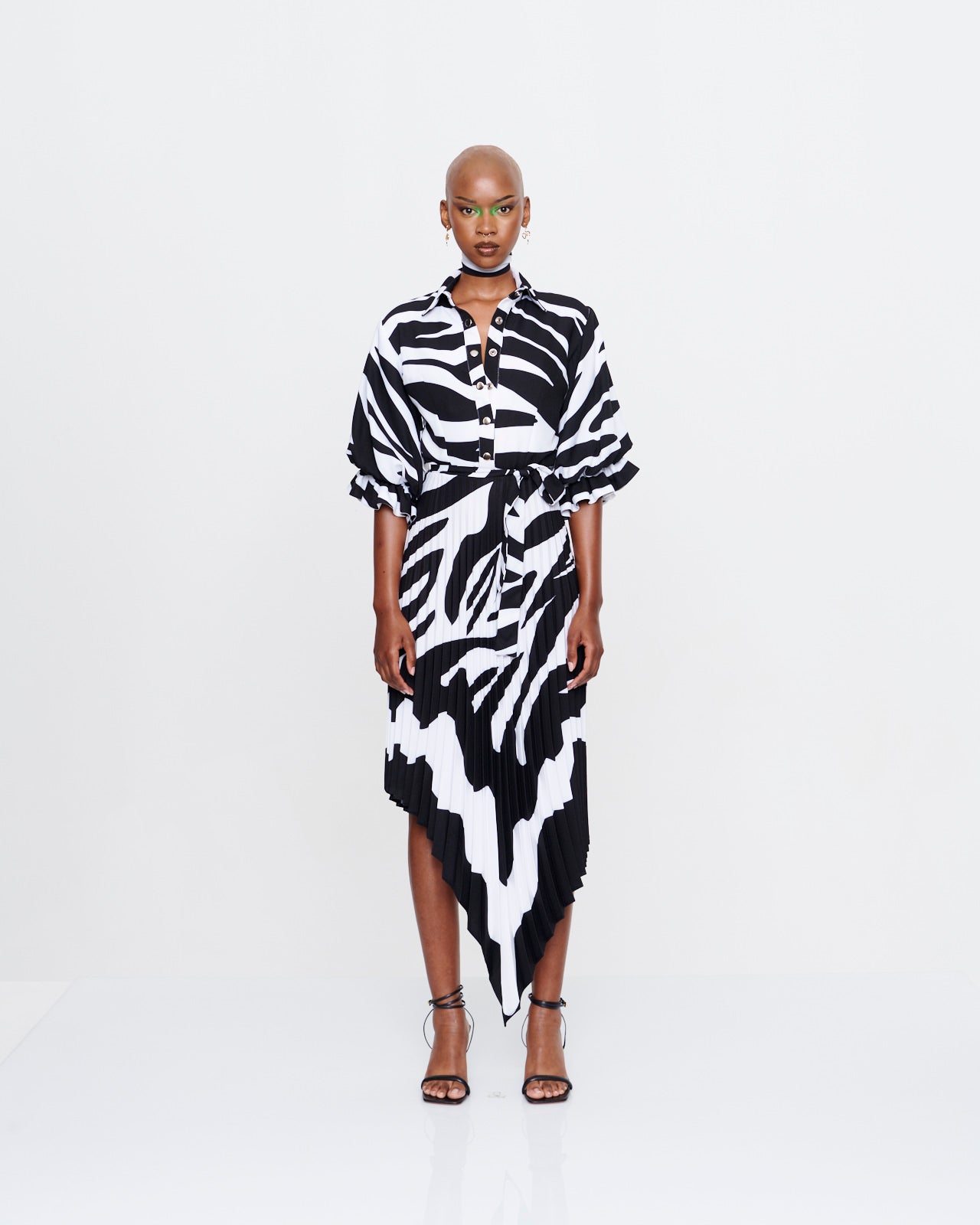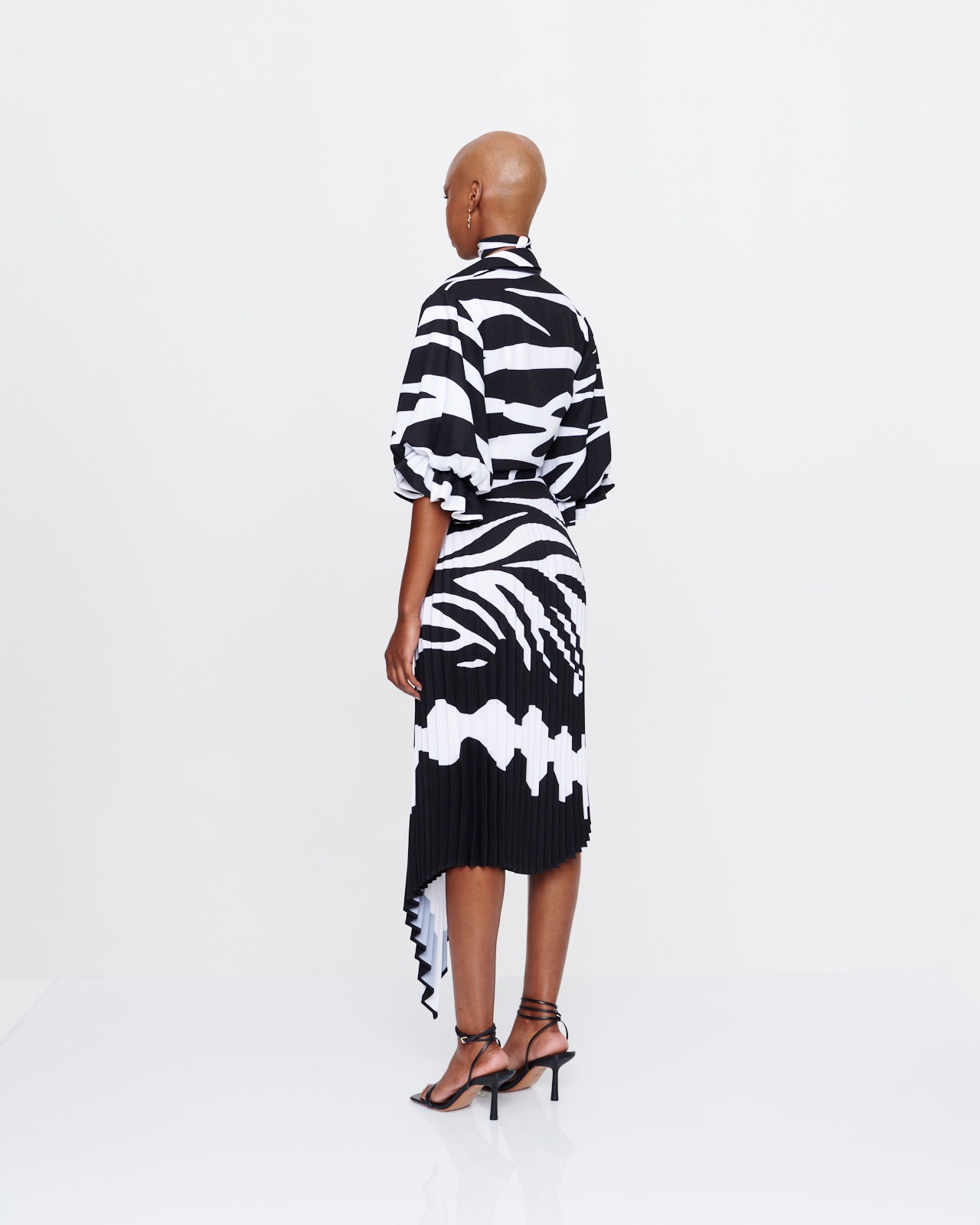 **/Description/*} The RICH MNISI Zebra Ru Dress is artfully crafted from lightweight crepe patterned with our signature Zebra Twirl. It's cut to a fitted top with a relaxed silhouette for delicate flow and subtle movement.