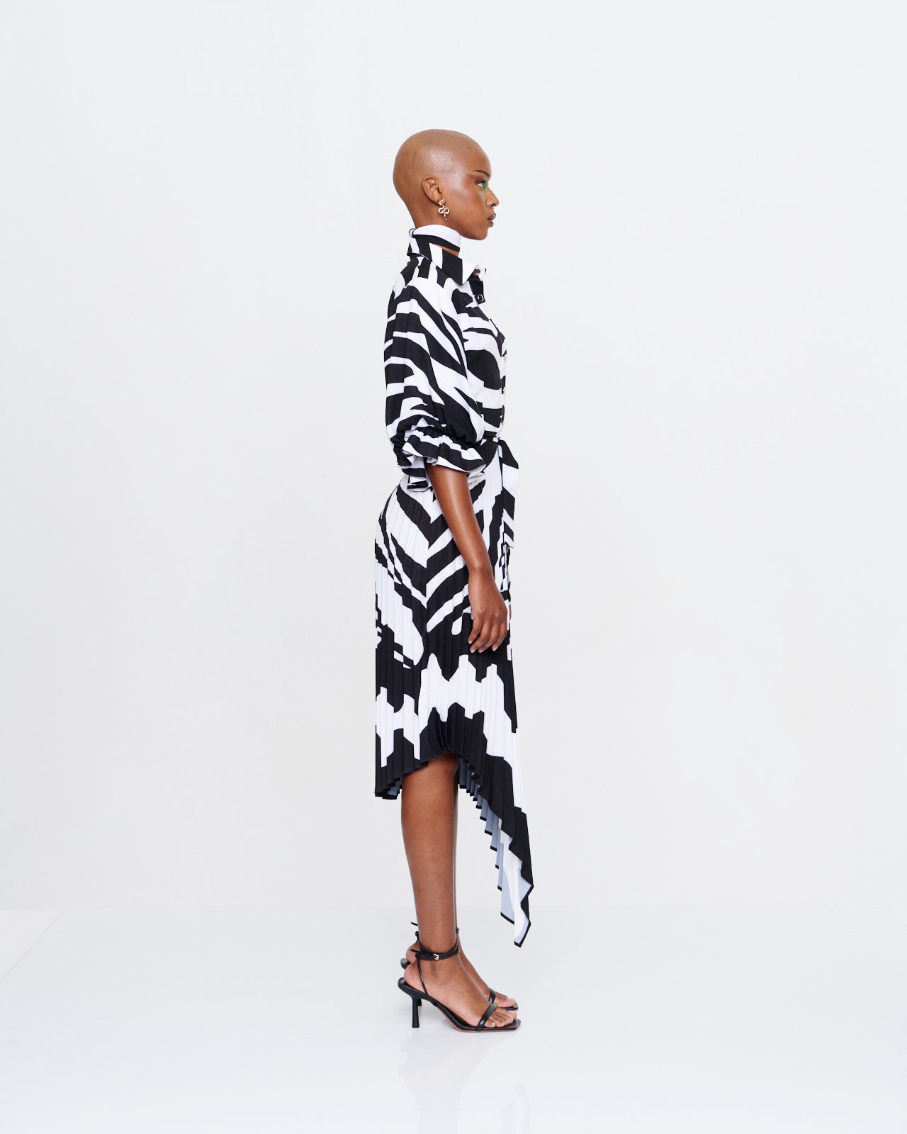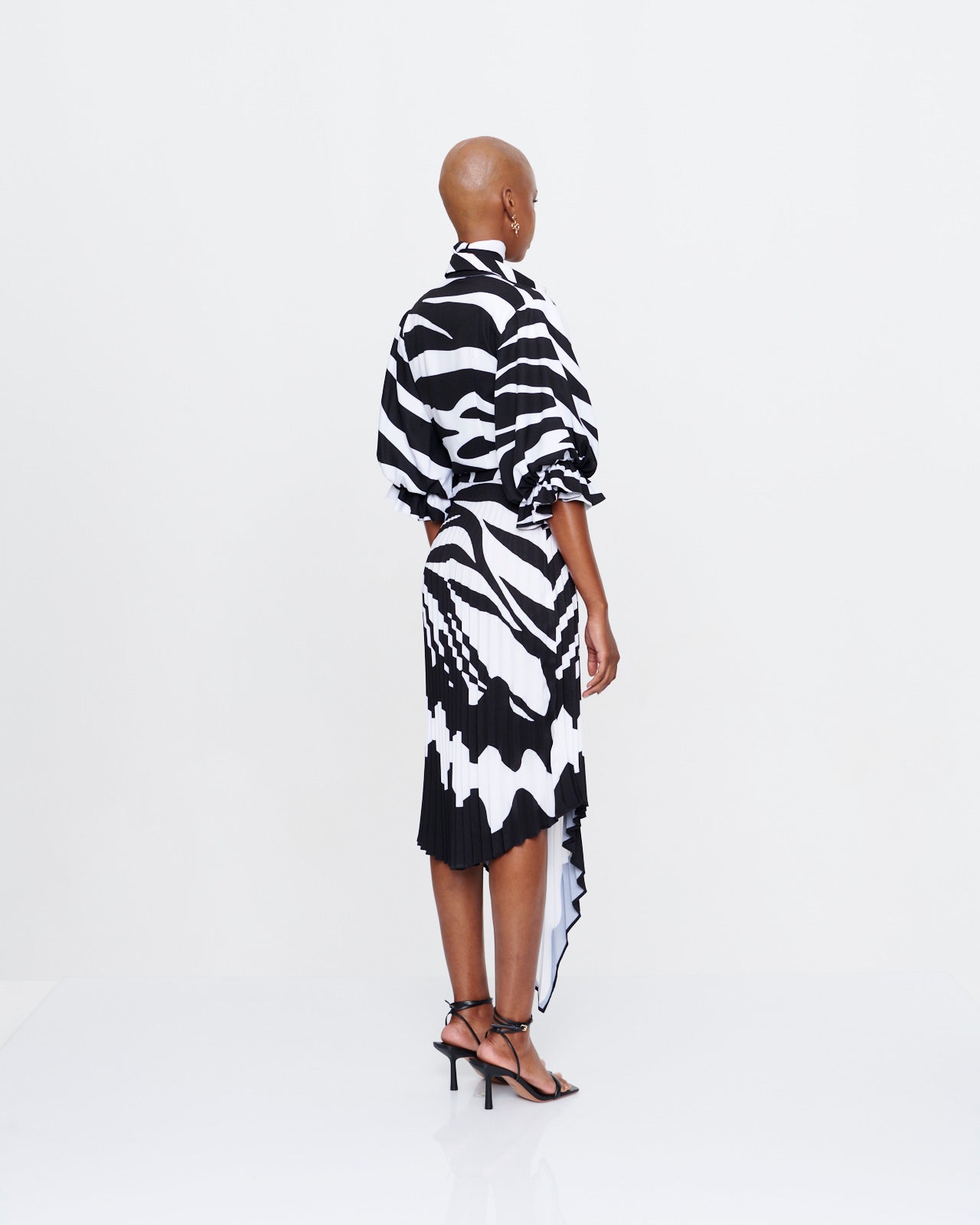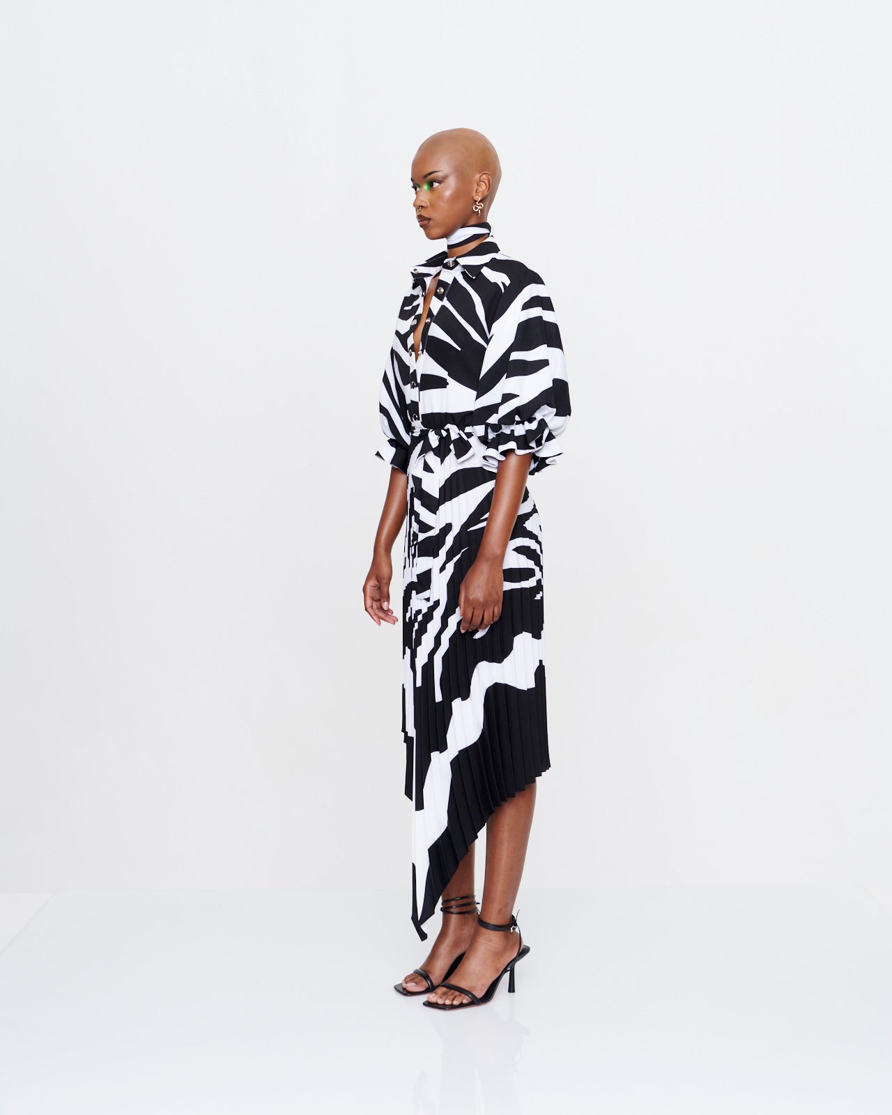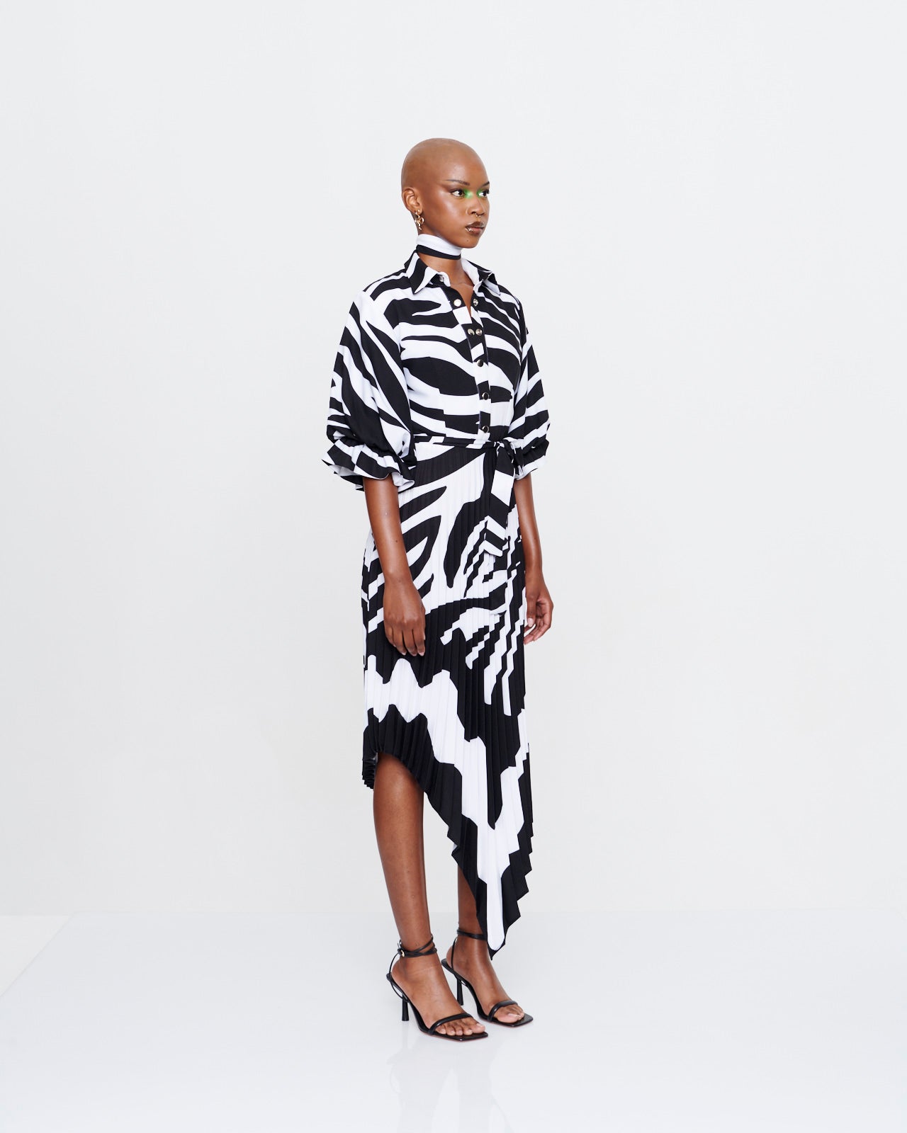 **/Description/*} The RICH MNISI Zebra Ru Dress is artfully crafted from lightweight crepe patterned with our signature Zebra Twirl. It's cut to a fitted top with a relaxed silhouette for delicate flow and subtle movement.